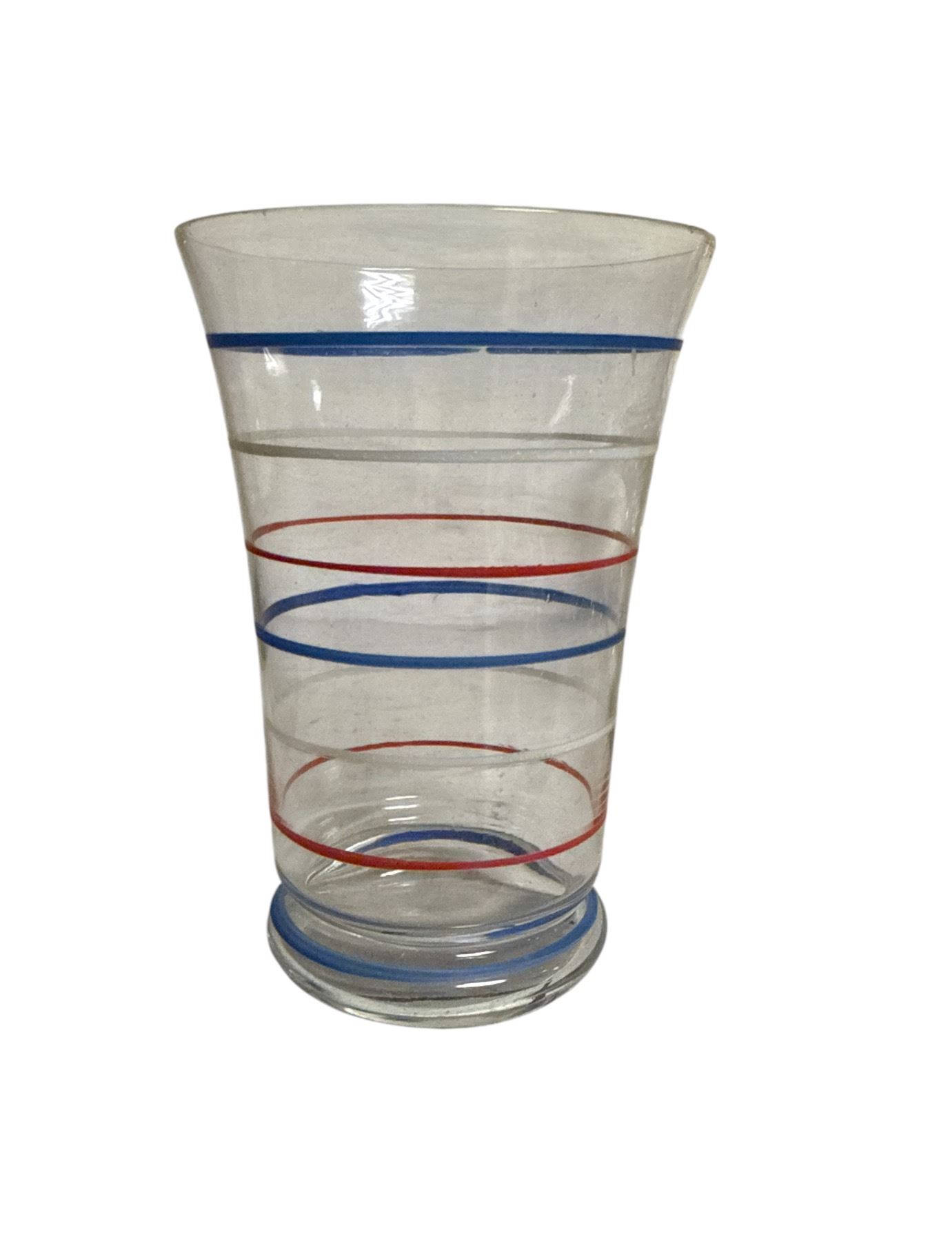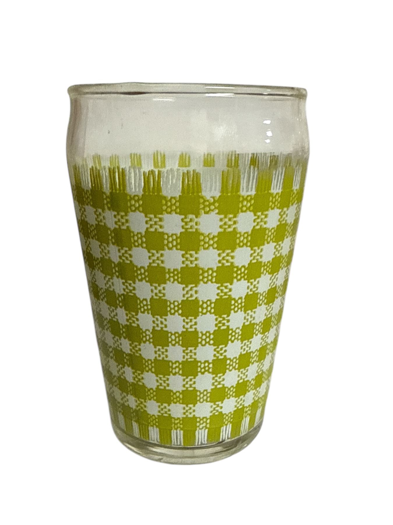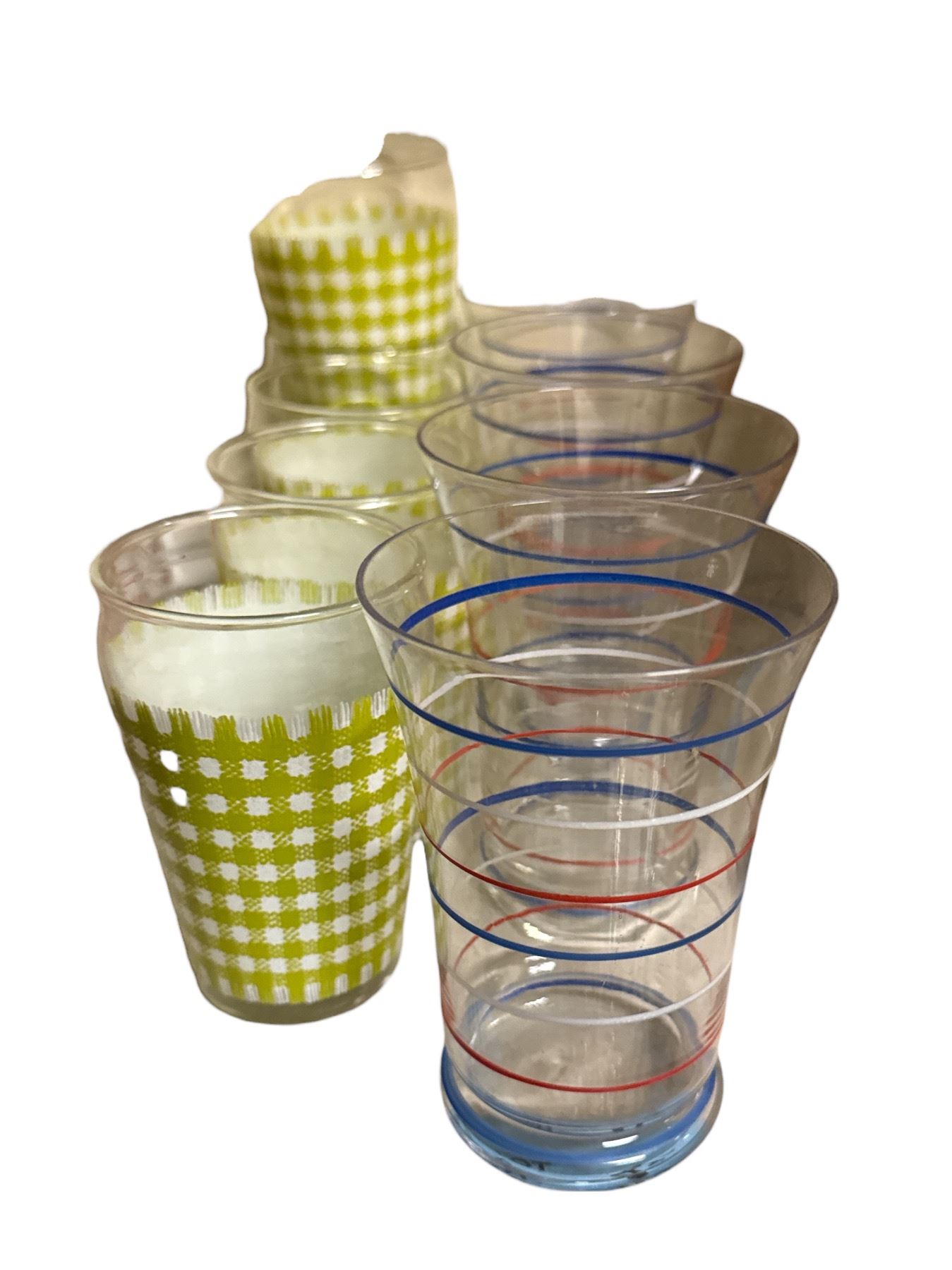 Assorted Mid-Century Patterned Drinking Glasses Including Green Gingham and Red & Blue Ringed Tumblers
