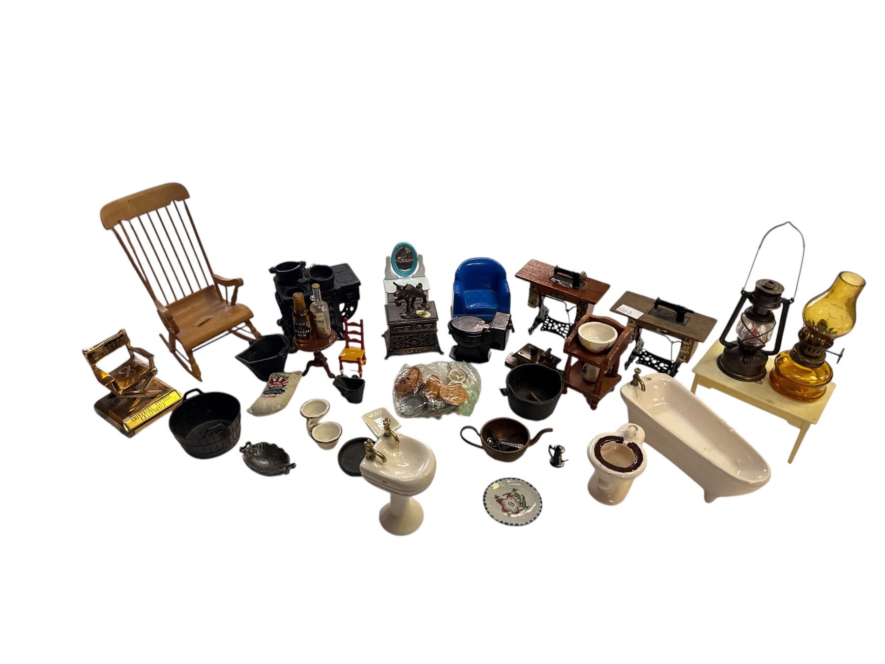 Assorted Miniature Furniture & Doll Accessories: Oil Lamps, Bath Tub, Stove, Chairs, Vanity, & More