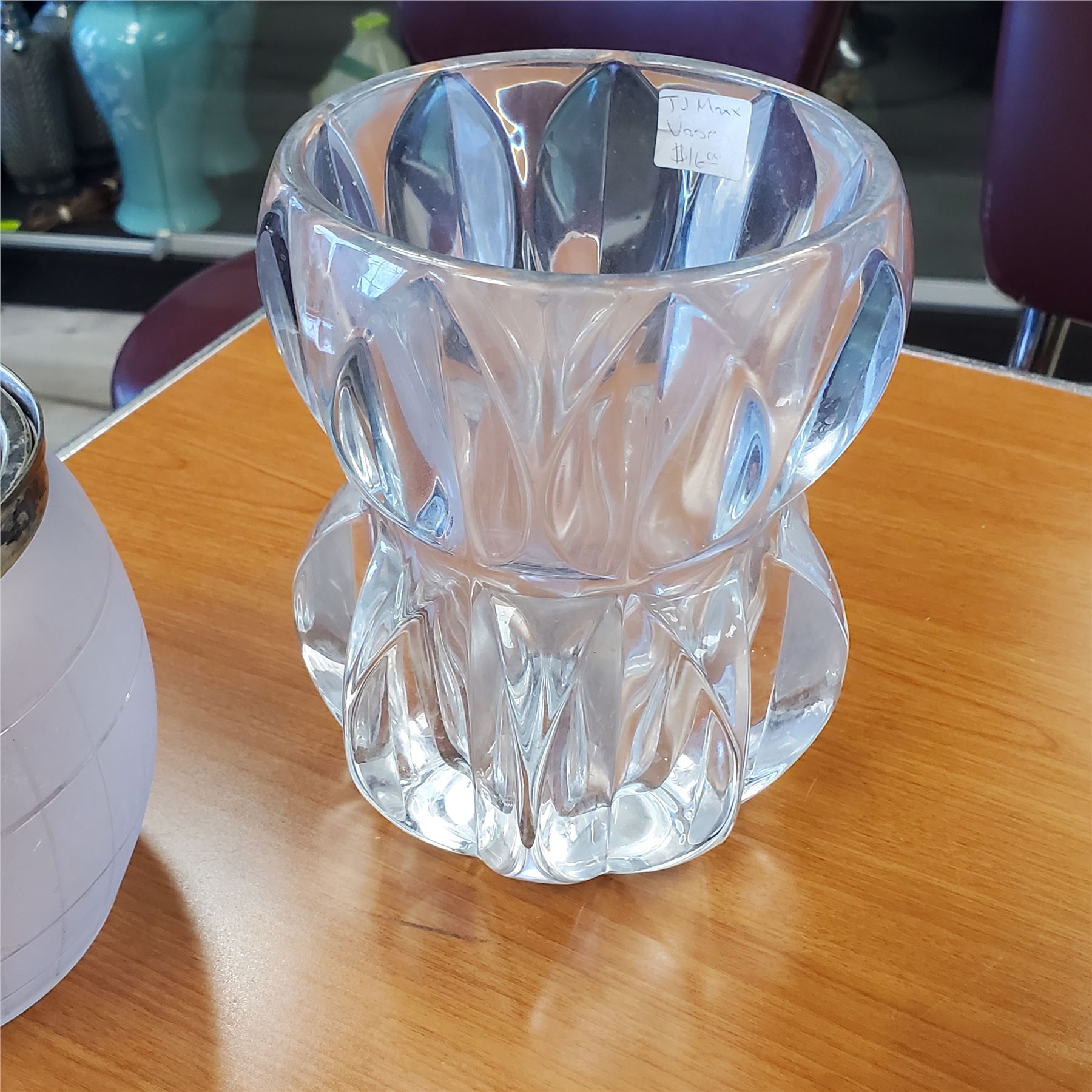 Lot of assorted mixed glass pieces including cookie jars and vases. Items feature various designs and styles. Materials and designs appear as pictured.