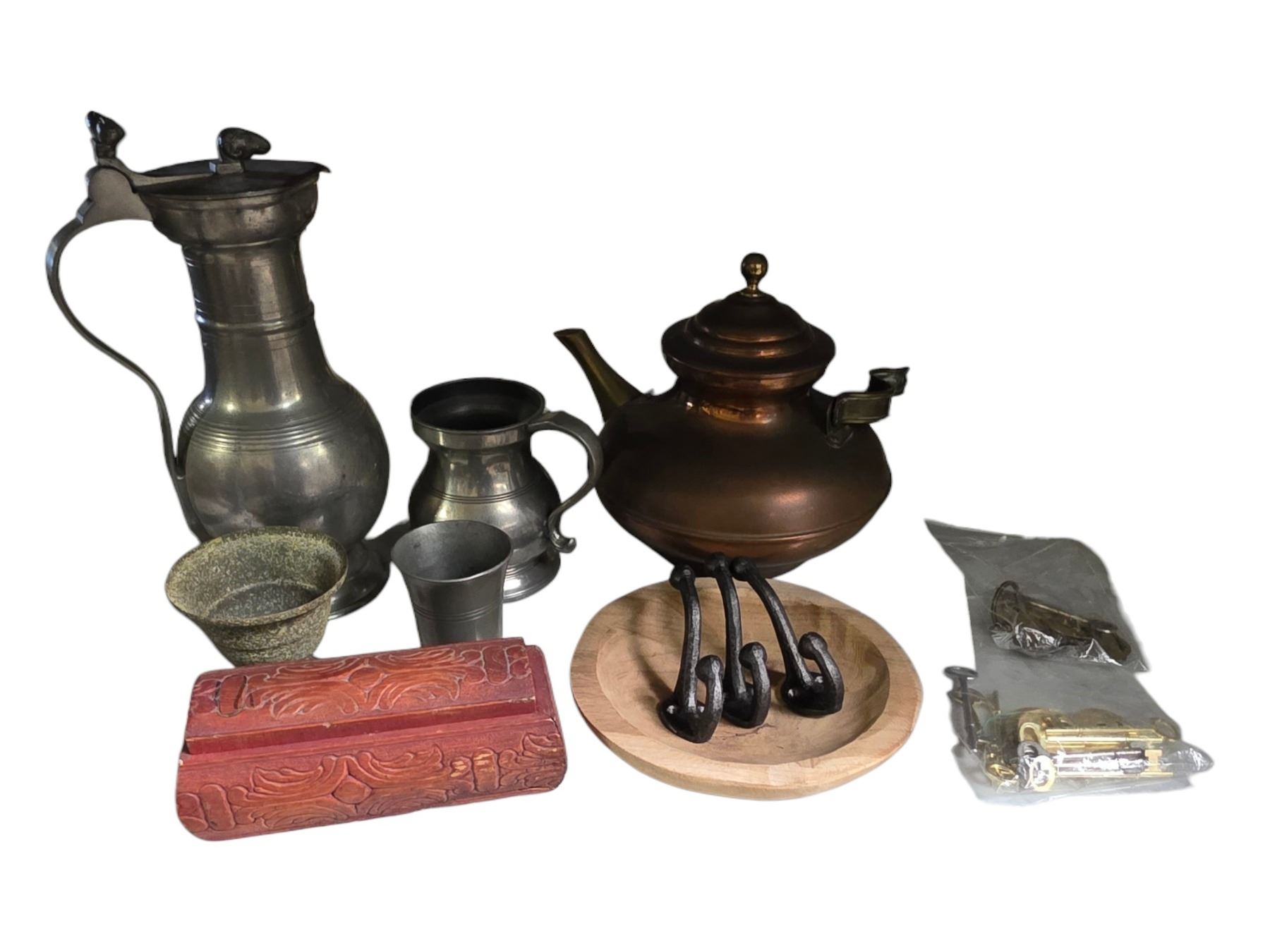 Assorted Pewter Pitcher, Decor Keys, Wooden Box, and More Decor Tabletop Item