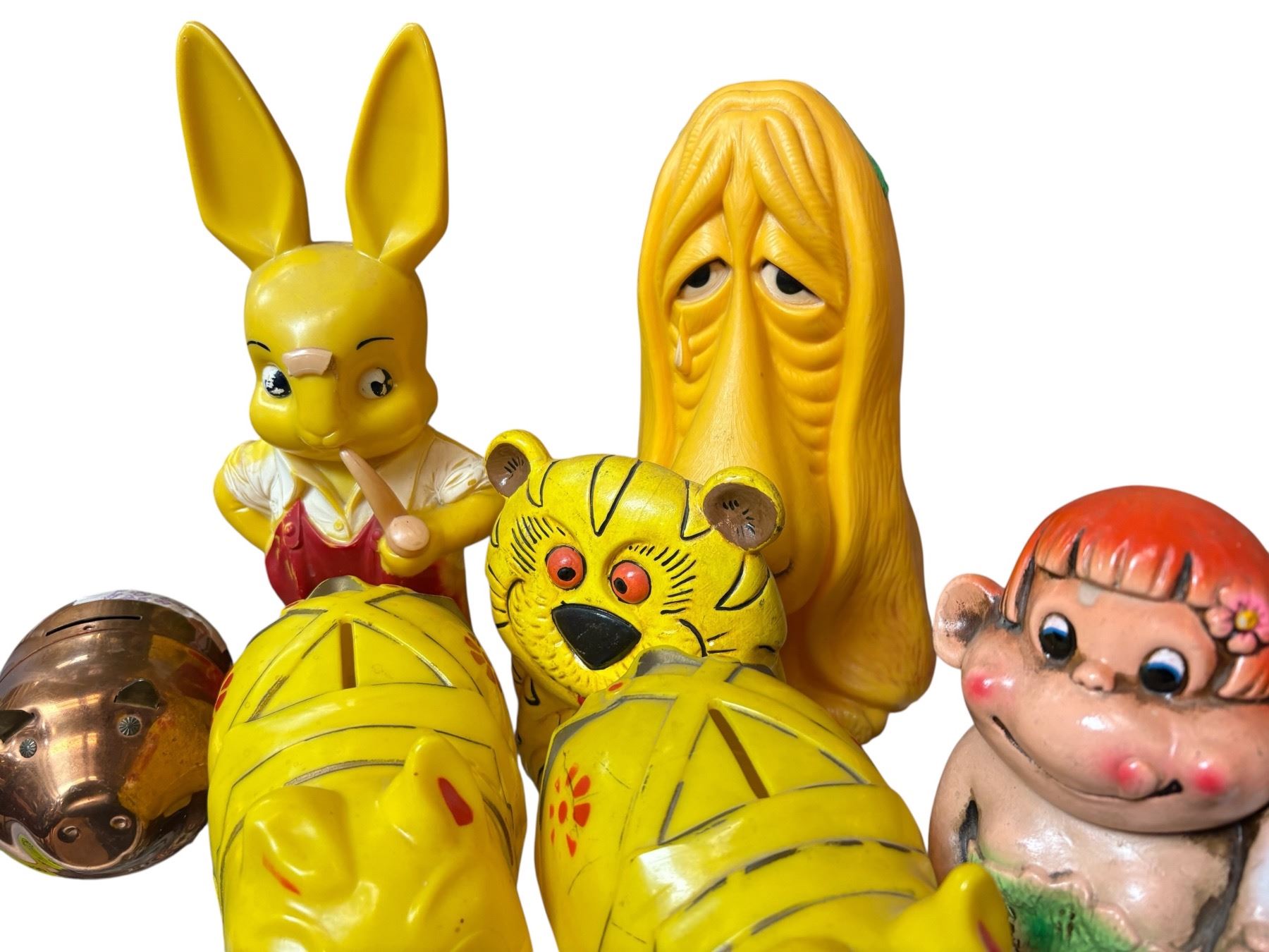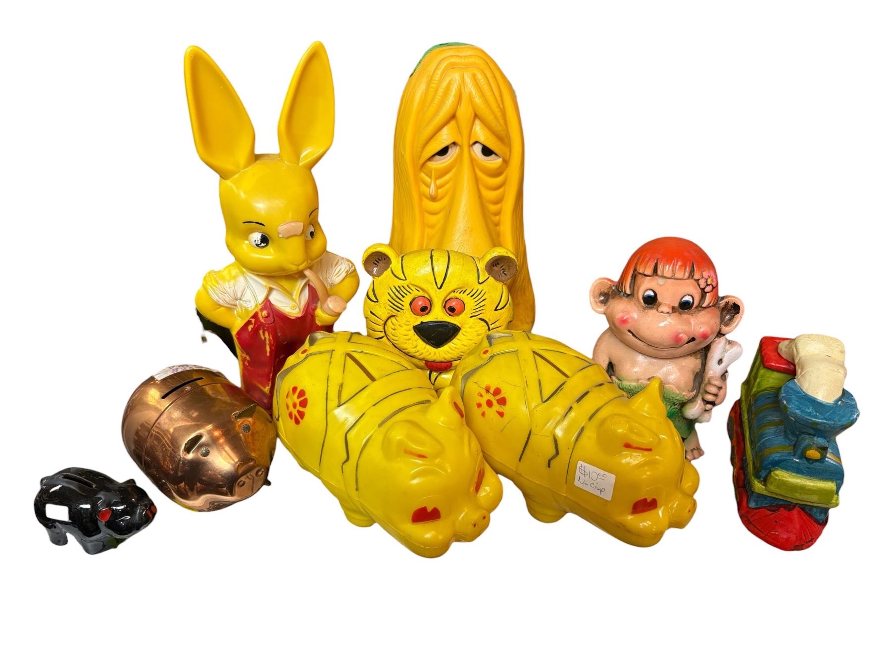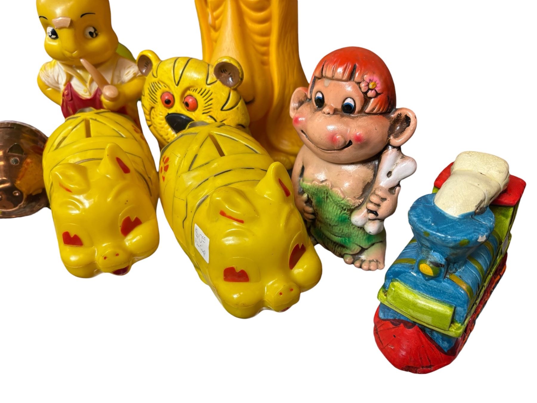 Large collection of piggy banks featuring a variety of materials including ceramic, plastic, and metal. Styles range from traditional to novelty designs, covering multiple eras. Some banks depict animals, vehicles, and classic pig designs. Ideal for themed decorative use or for saving coins.