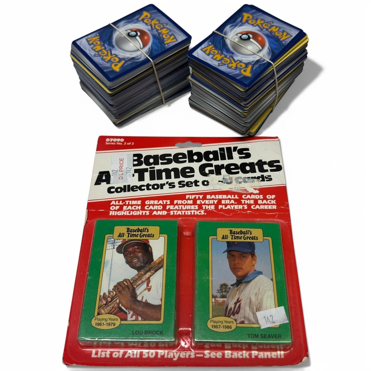 Includes a stack of assorted Pokémon cards featuring various characters and a package of vintage baseball cards. Details and specific card types or conditions are as pictured. Item is as pictured.