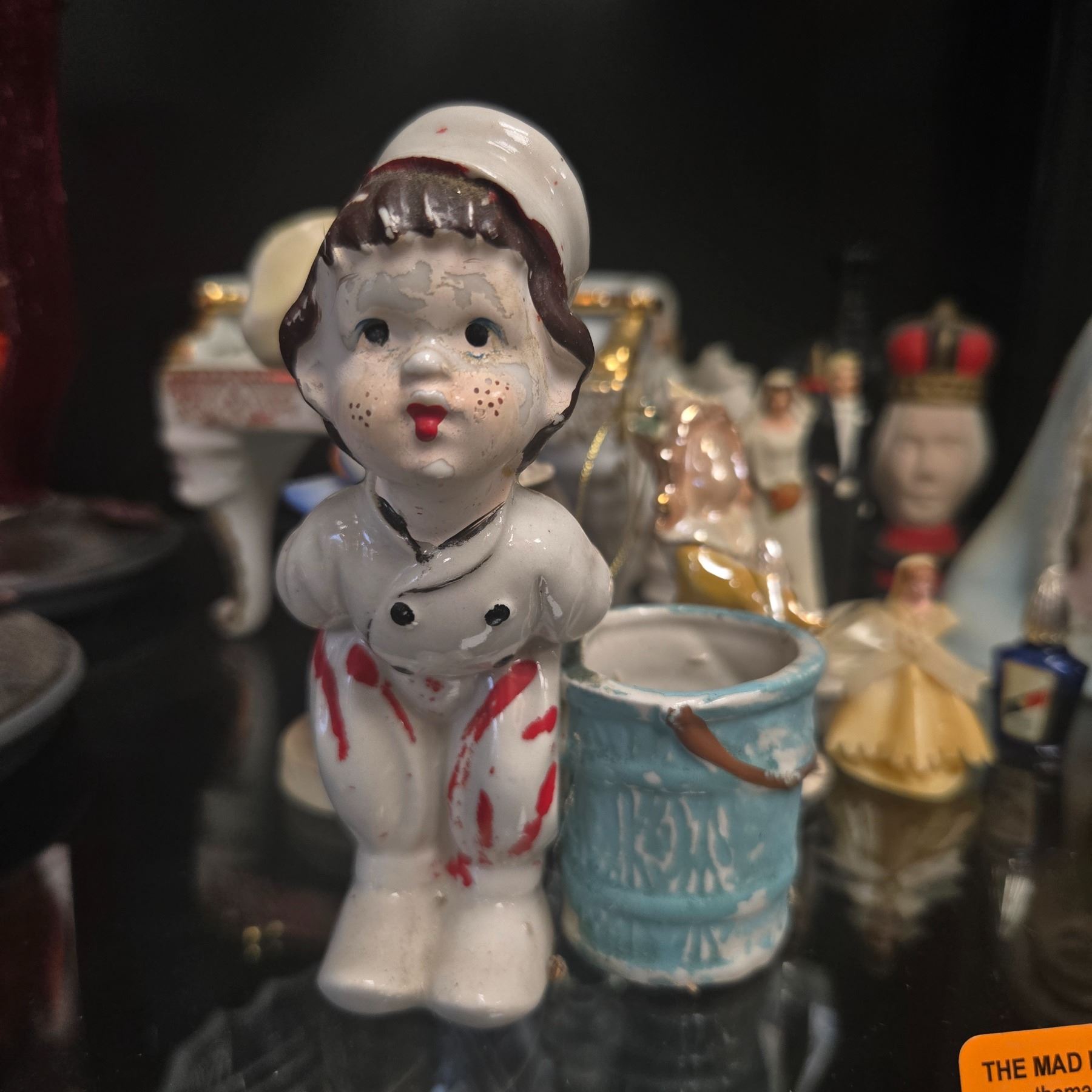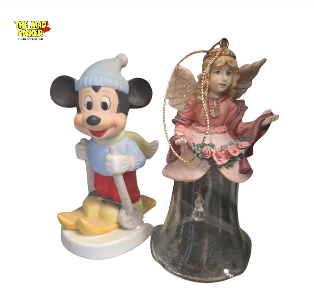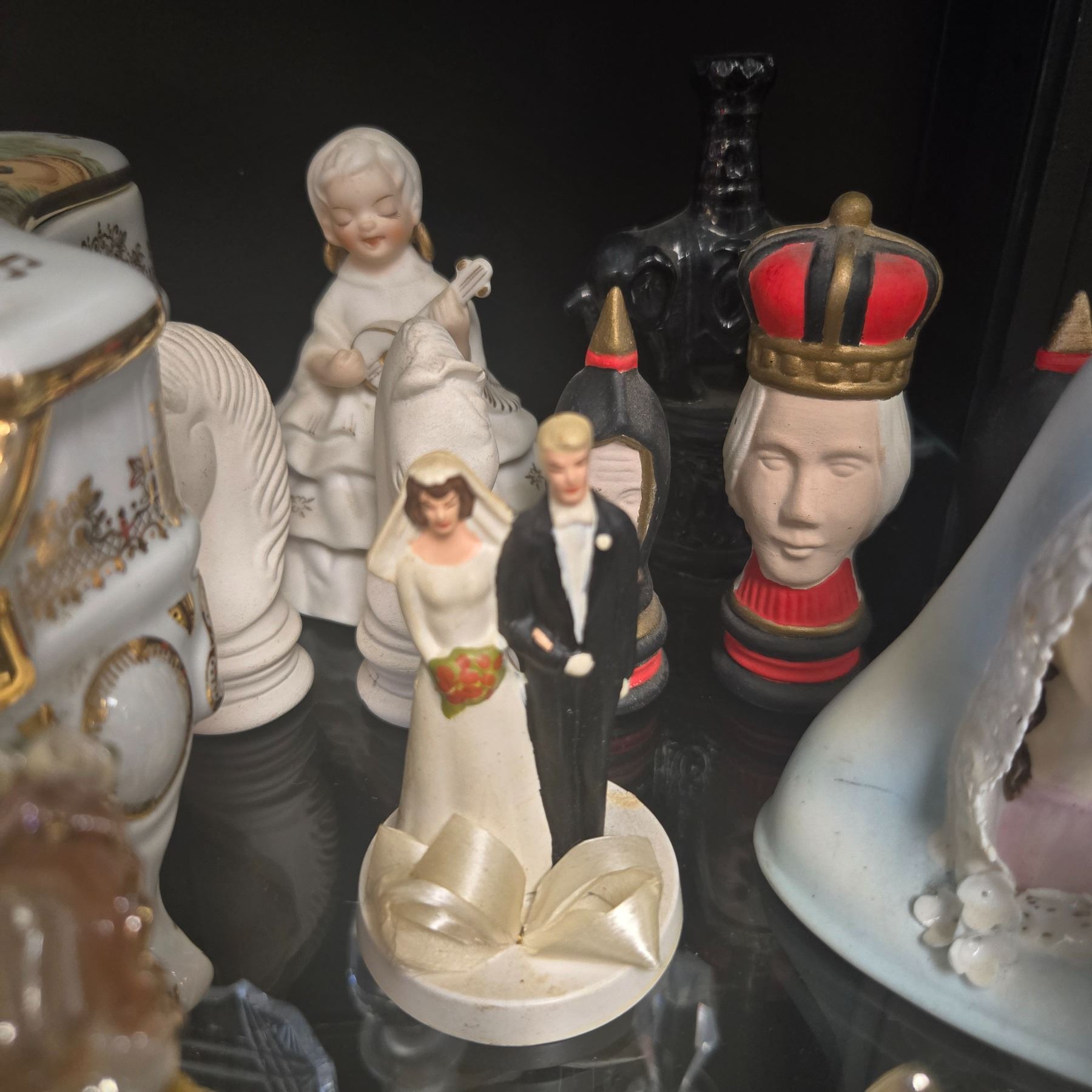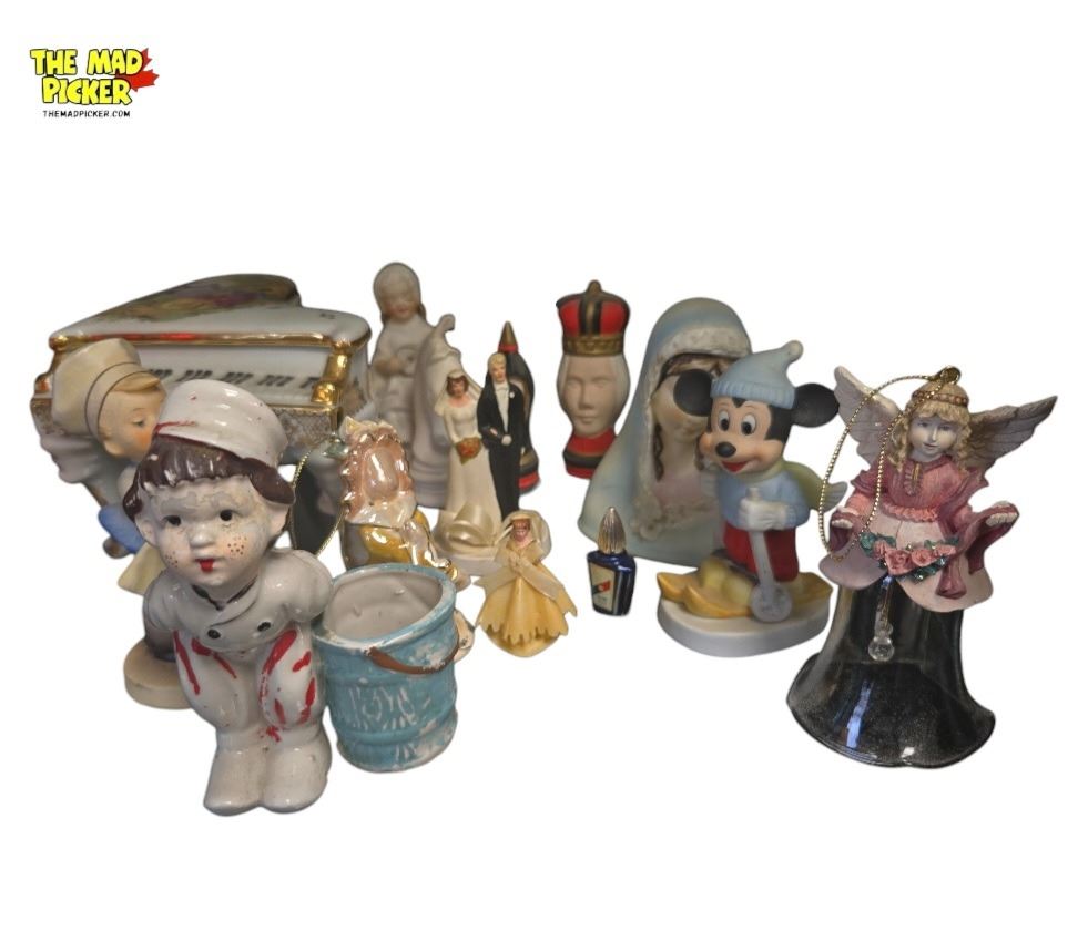 Diverse collection of mostly porcelain figurines featuring wedding-themed pieces, chess figures, a Limoges piano, Mickey Mouse characters, and Christmas ornaments. Includes various styles and designs. Ideal for thematic or decorative purposes. Condition and sizes vary within the collection.