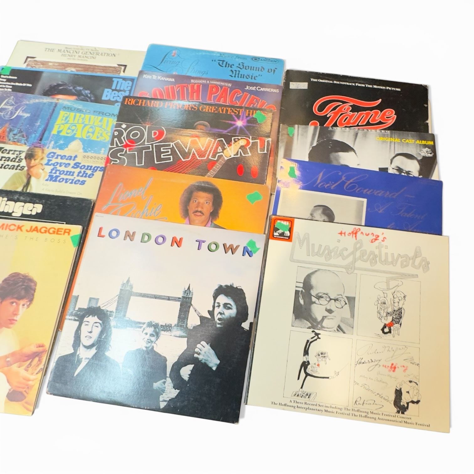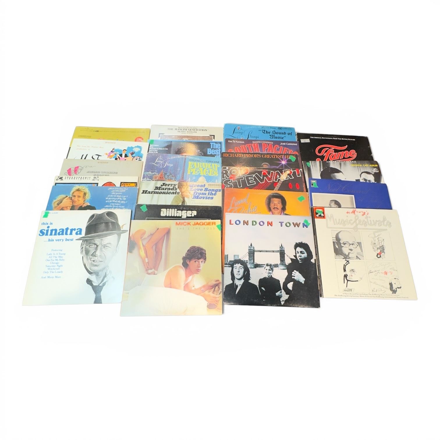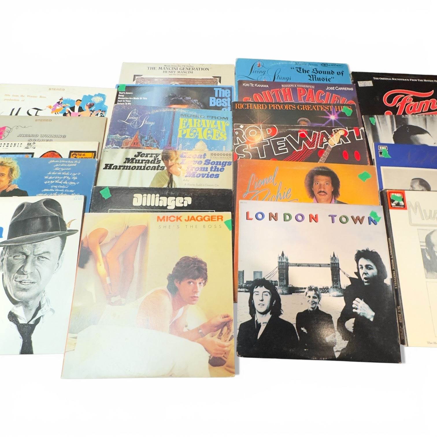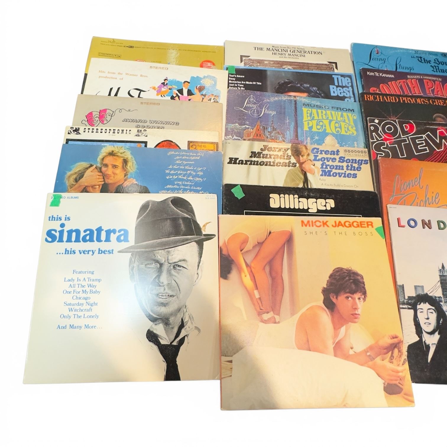 Lot includes an assorted collection of records featuring artists such as Rod Stewart and Mick Jagger. Additional titles or artists may be included in the collection. Items are as pictured, and condition of records and sleeves varies across the collection. A diverse selection of recorded music.