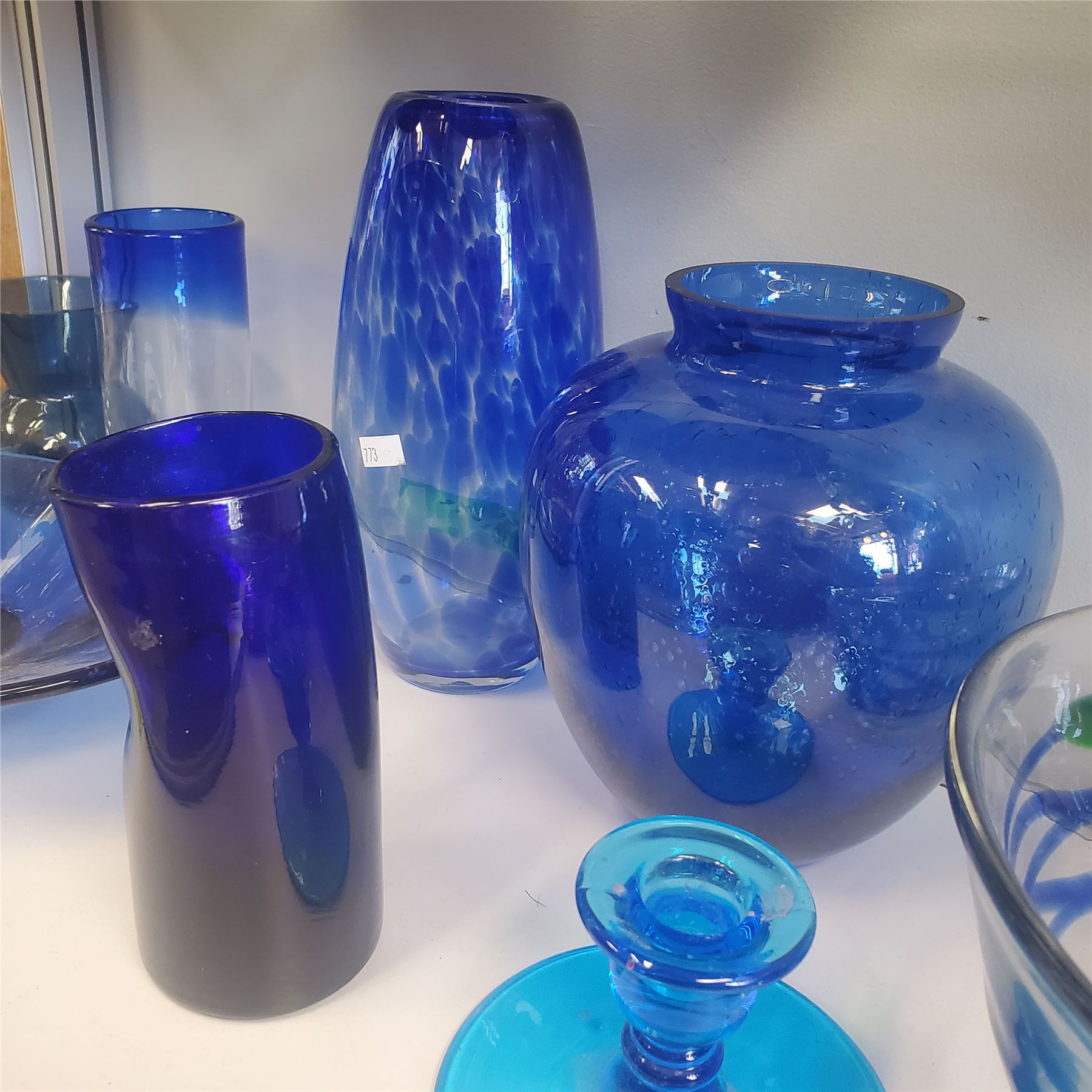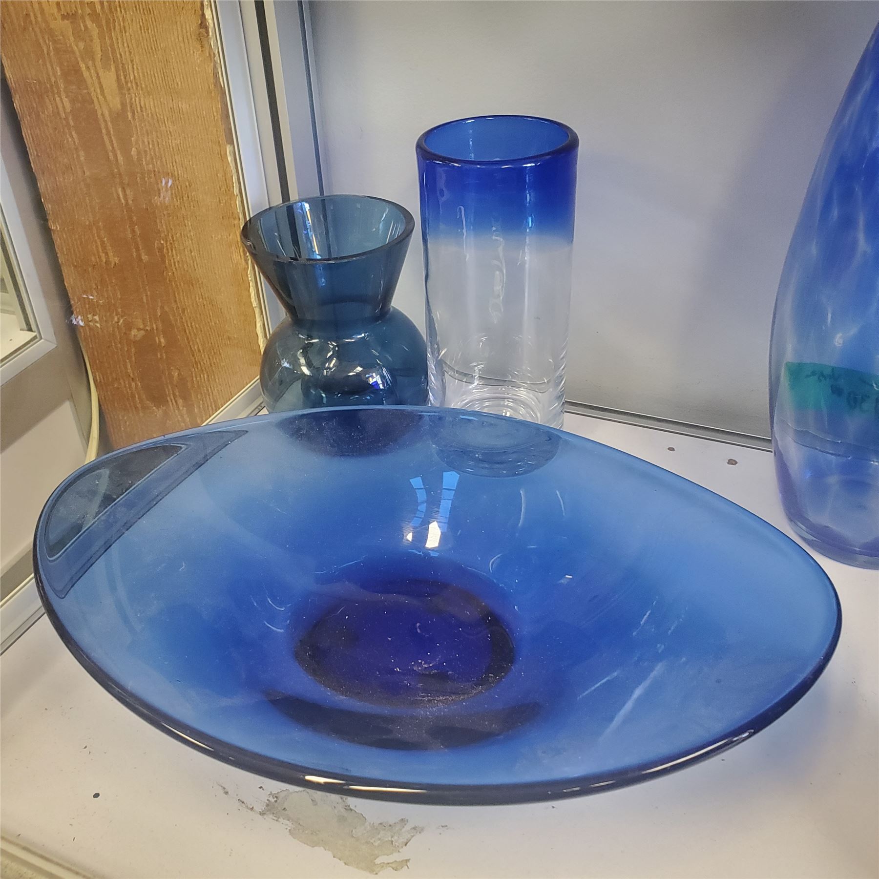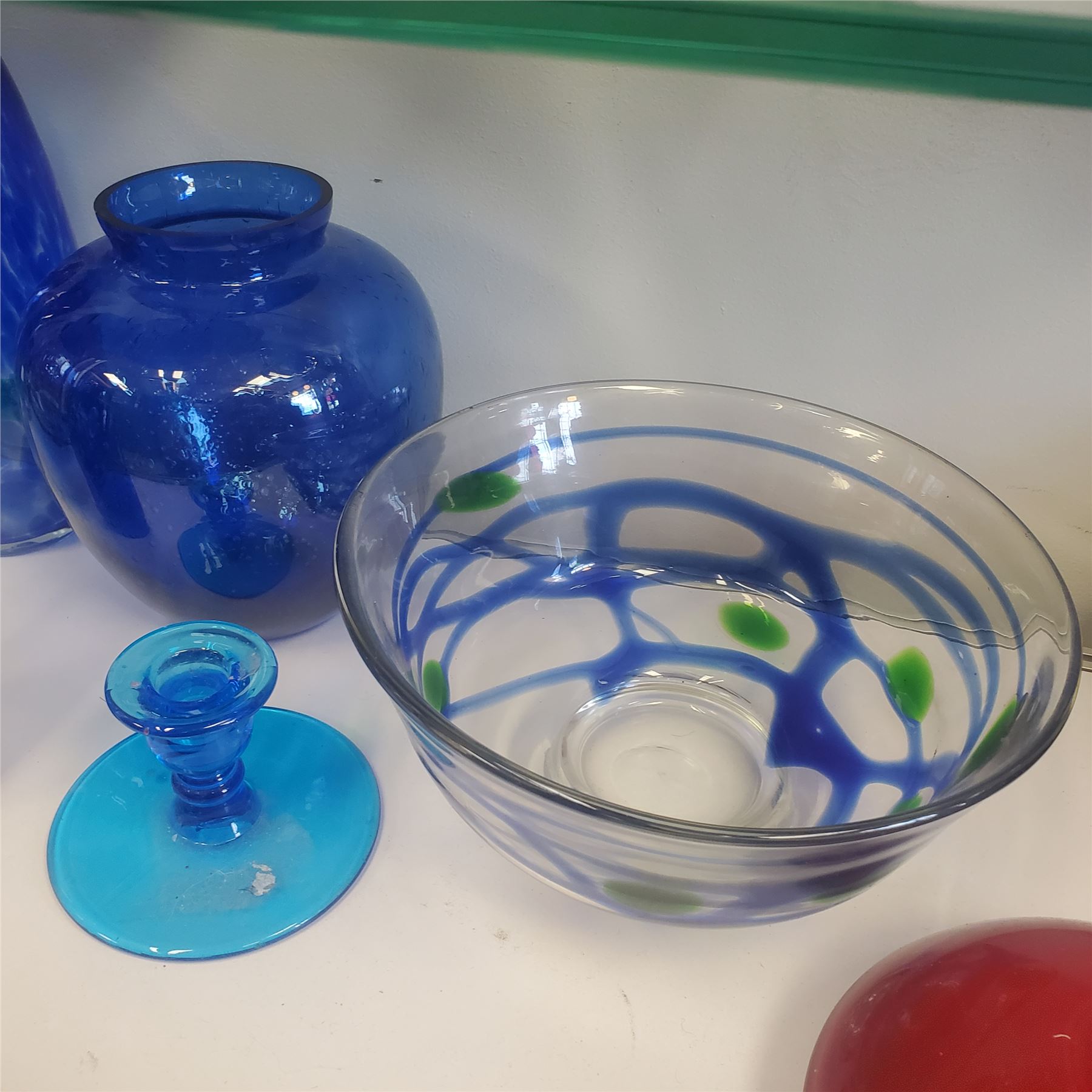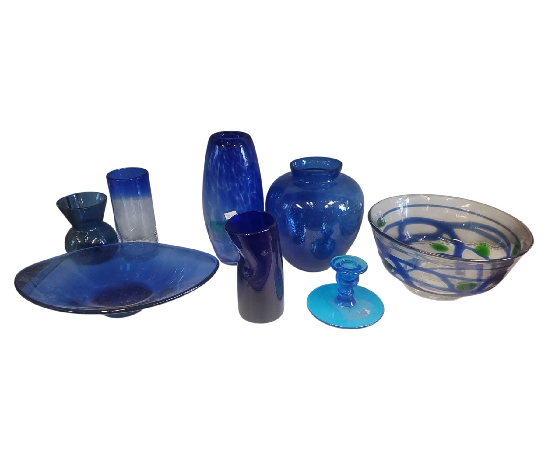 Collection of vintage blue themed art glass items including vases, bowls, candlestick holders, and a dish. The pieces feature a variety of shapes and styles in coordinating blue tones. Item is as pictured. Tallest piece is 9.5" tall.