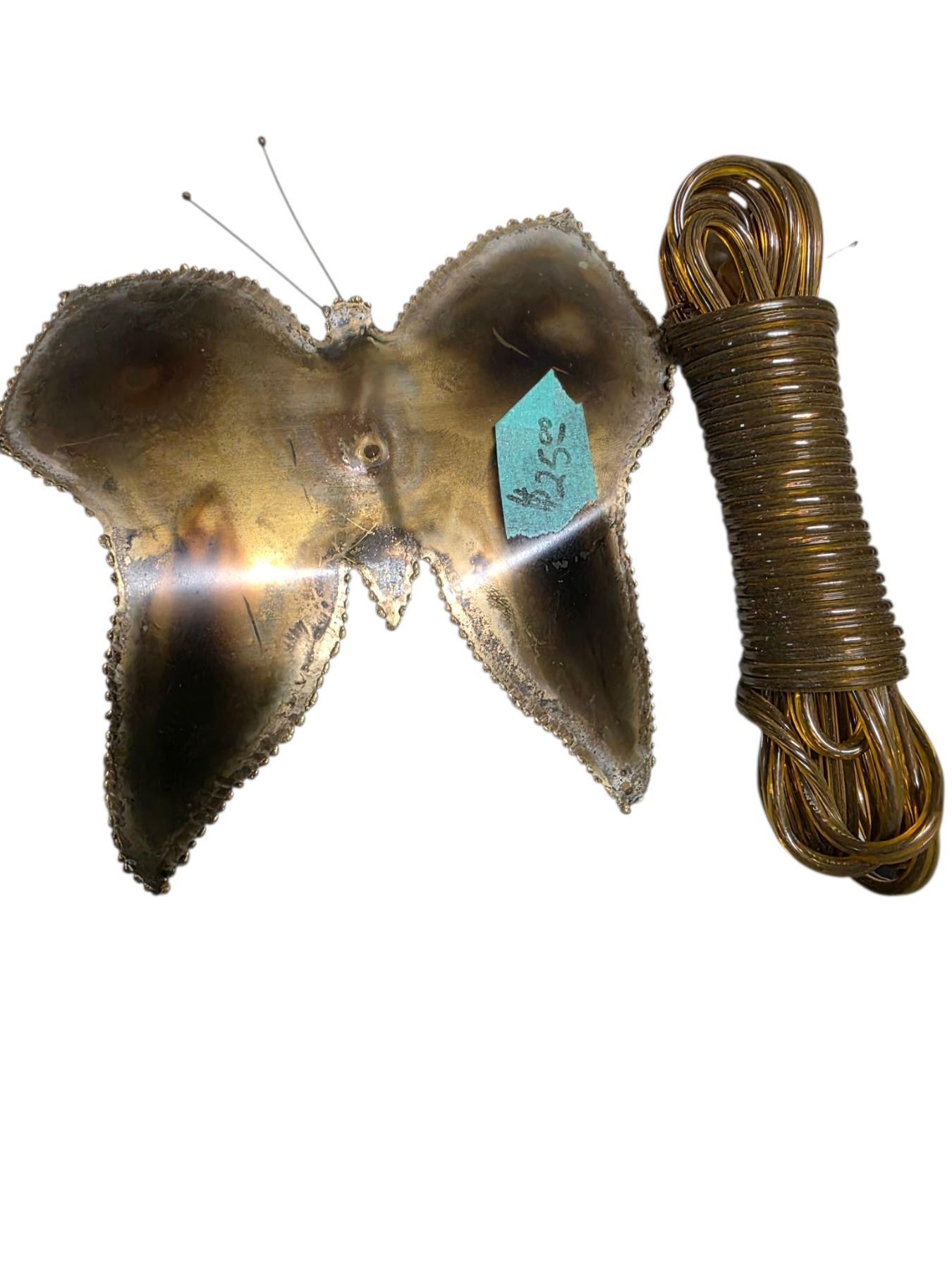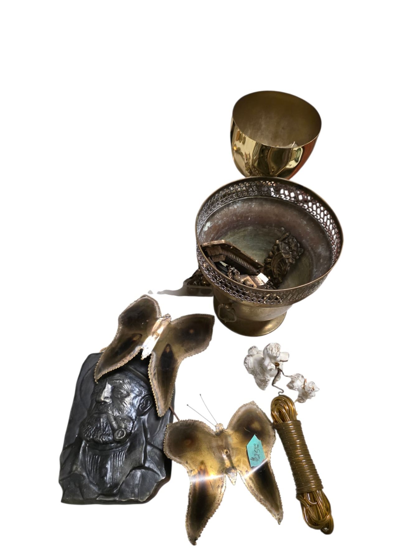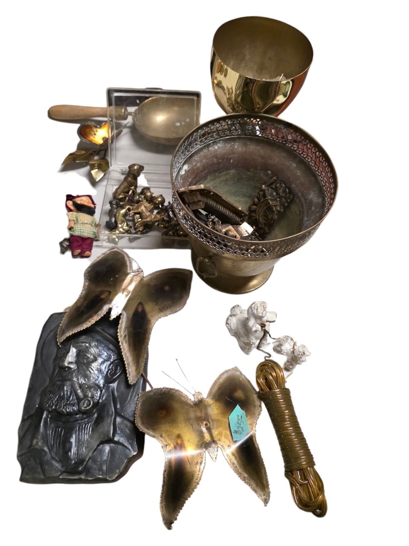 Assorted Vintage Brass & Metal Decor Lot - Footed Pierced Bowl, Goblet, Mini Figurines, Butterfly Wall Art & Misc