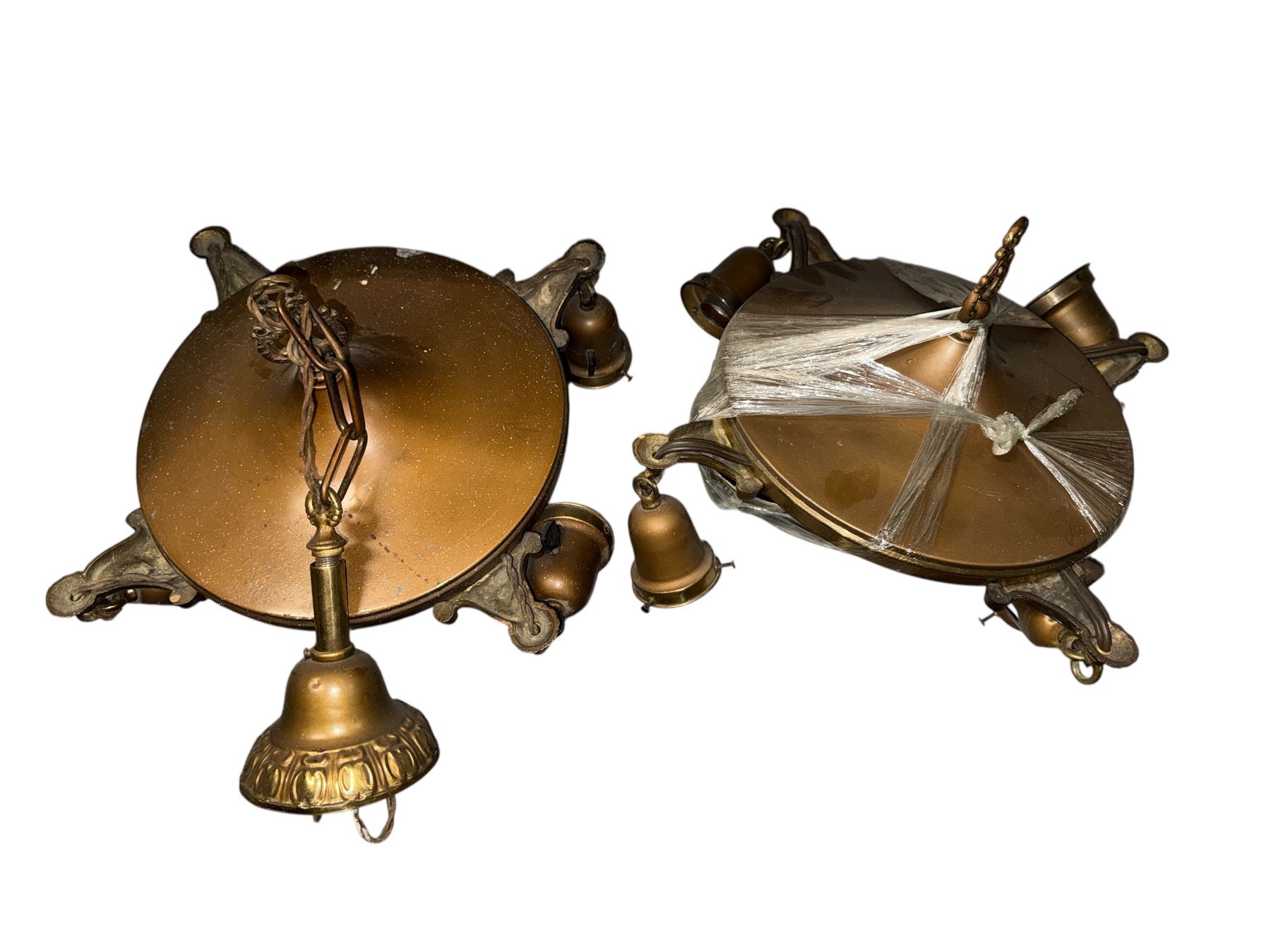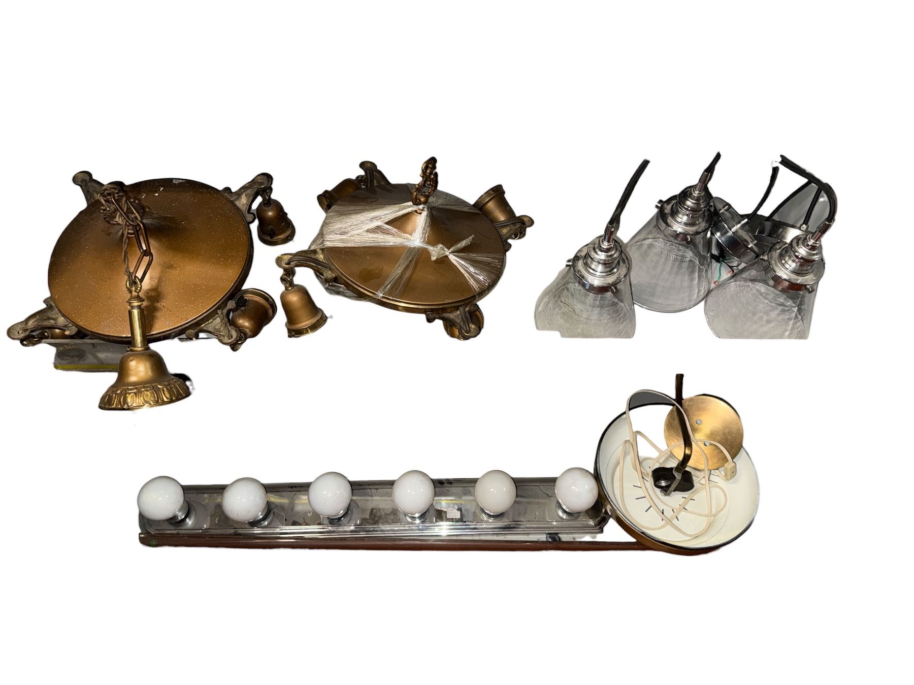 Assorted Vintage Ceiling and Vanity Light Fixtures Including Brass Flush Mounts, Three-Light Fixture, and Six-Bulb Vanity Bar