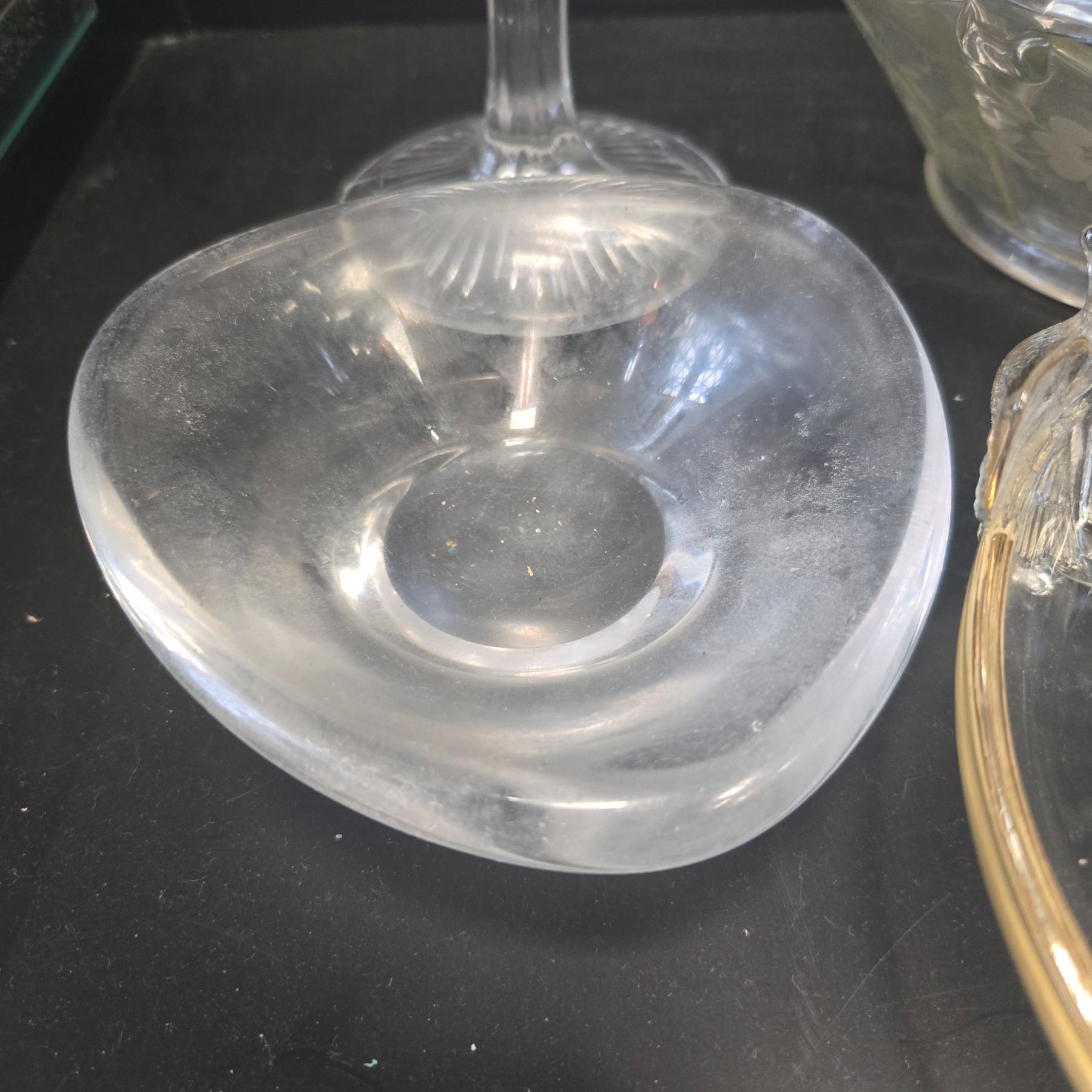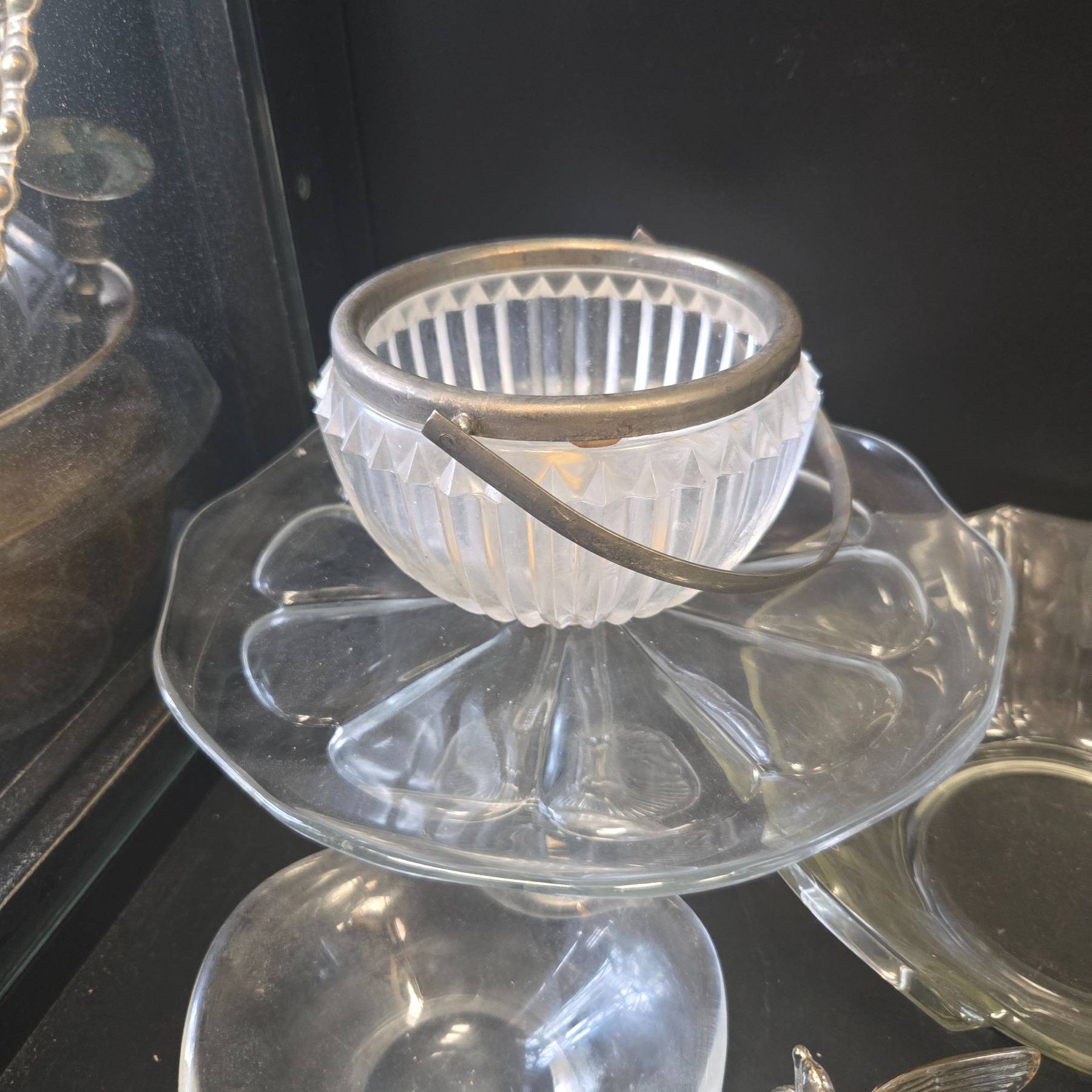 Collection includes assorted clear glass dishes, bowls, and a cake plate from the mid-20th century. Likely pressed or blown glass with simple, elegant designs. Suitable for serving or decorative purposes. No specific maker marks on items. Variety of sizes and styles.