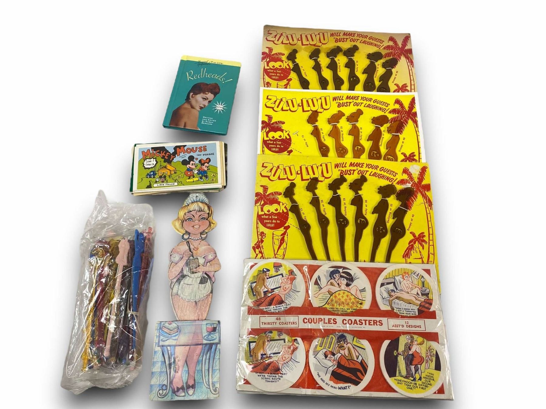 Assorted Vintage Collectibles: Stir Sticks, Books, Coasters, & More