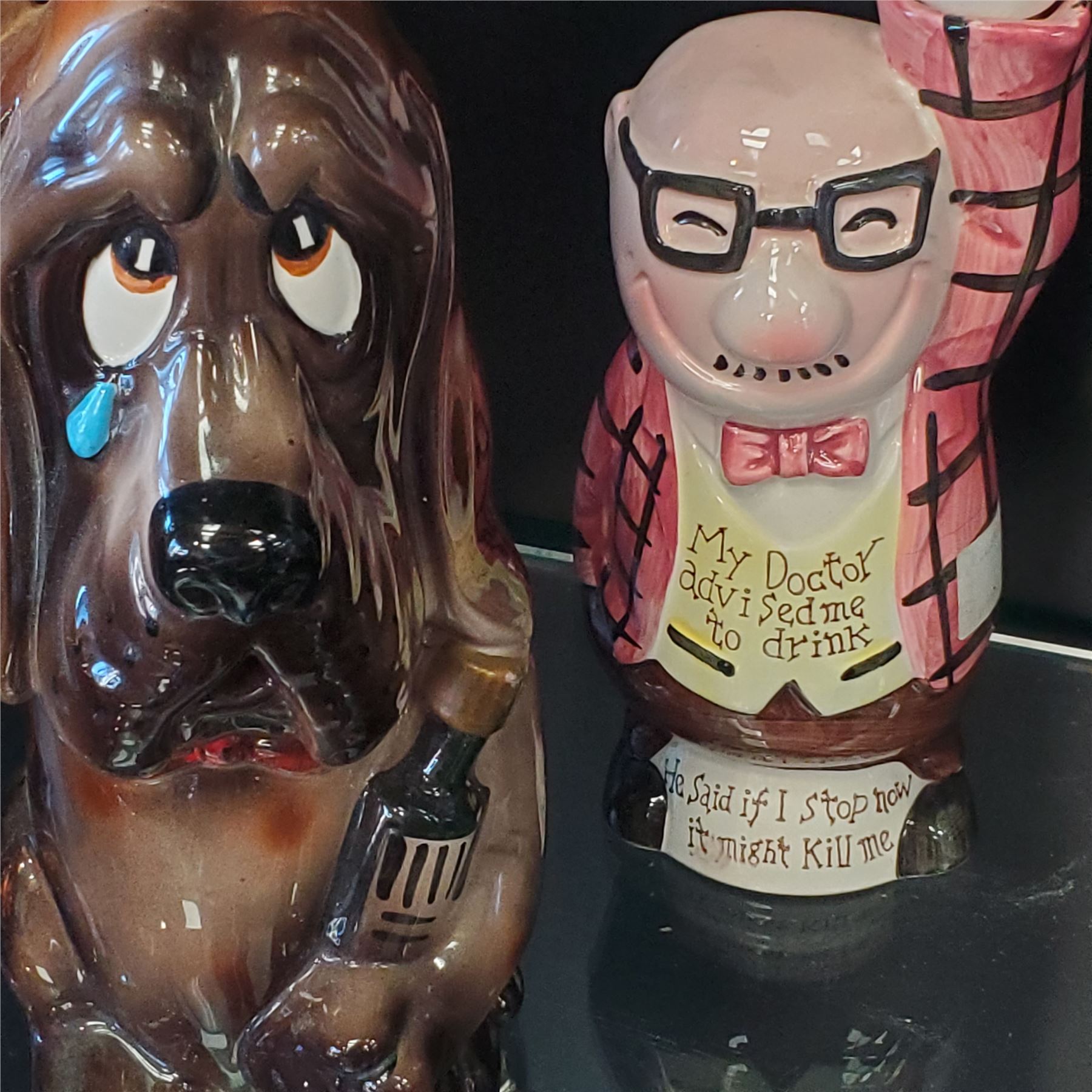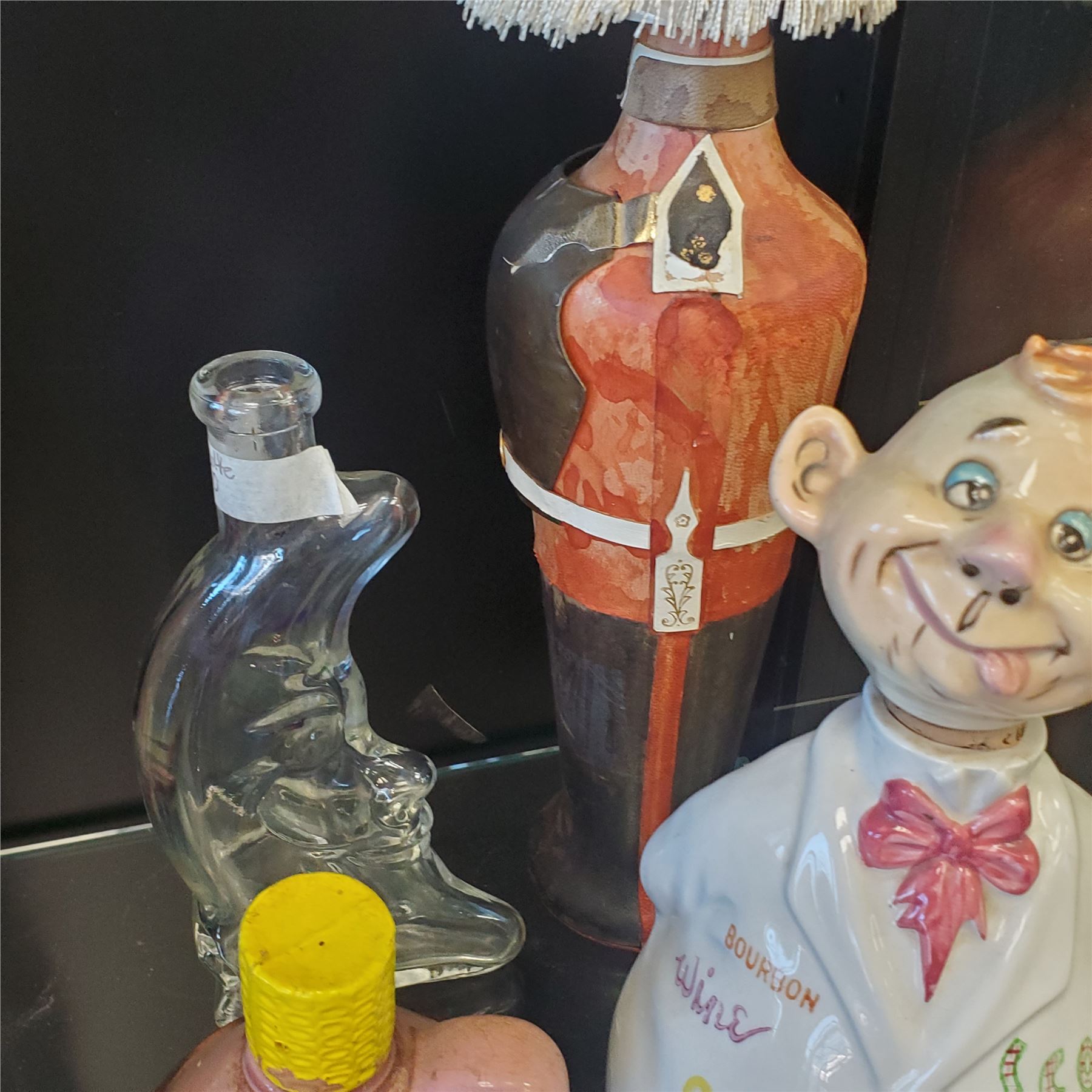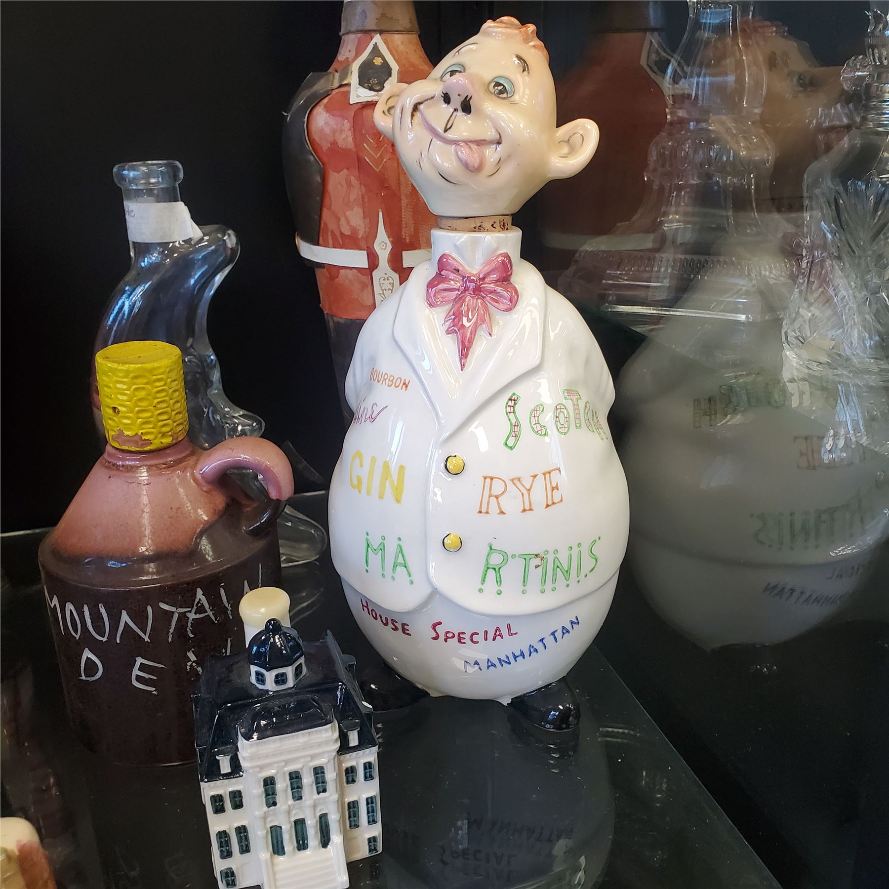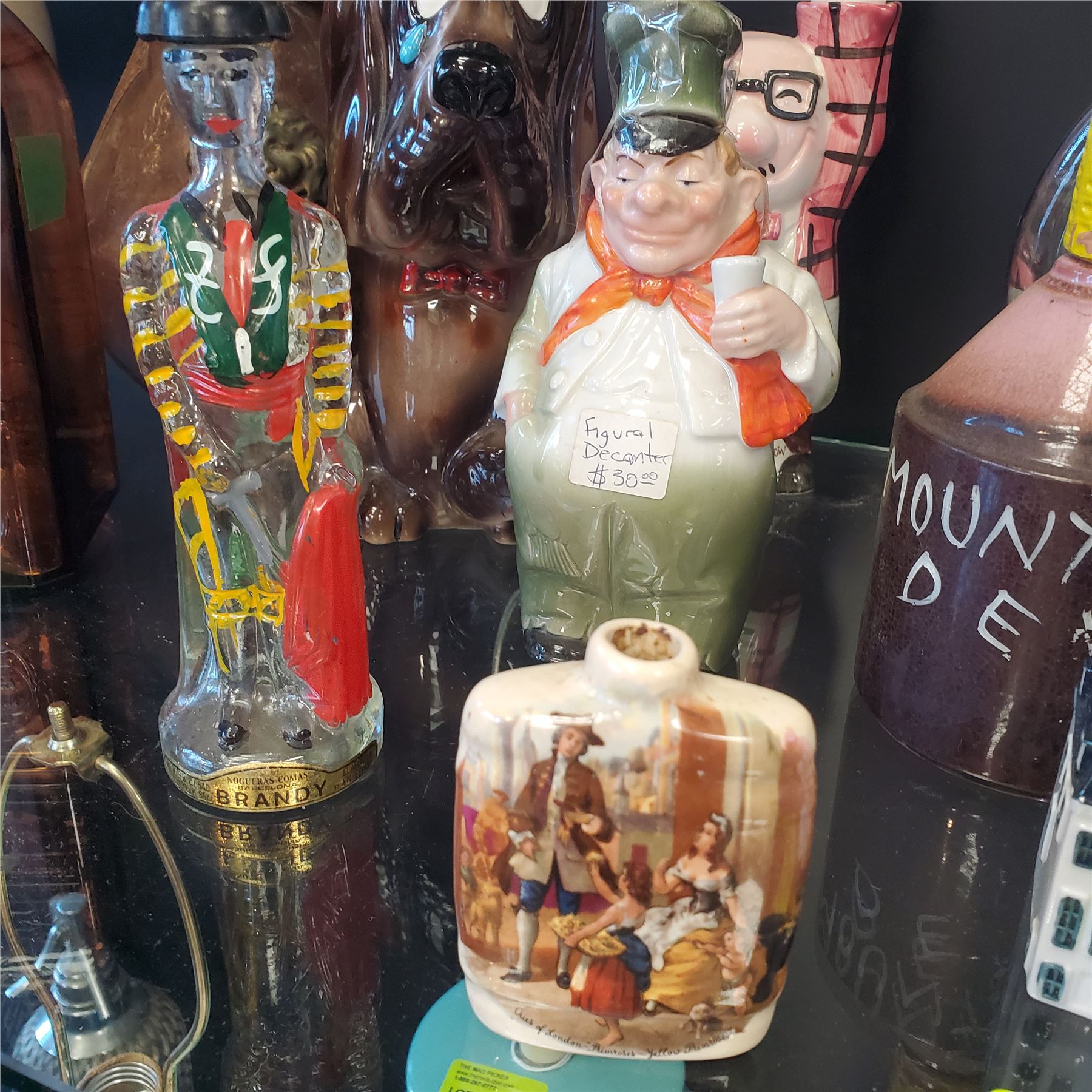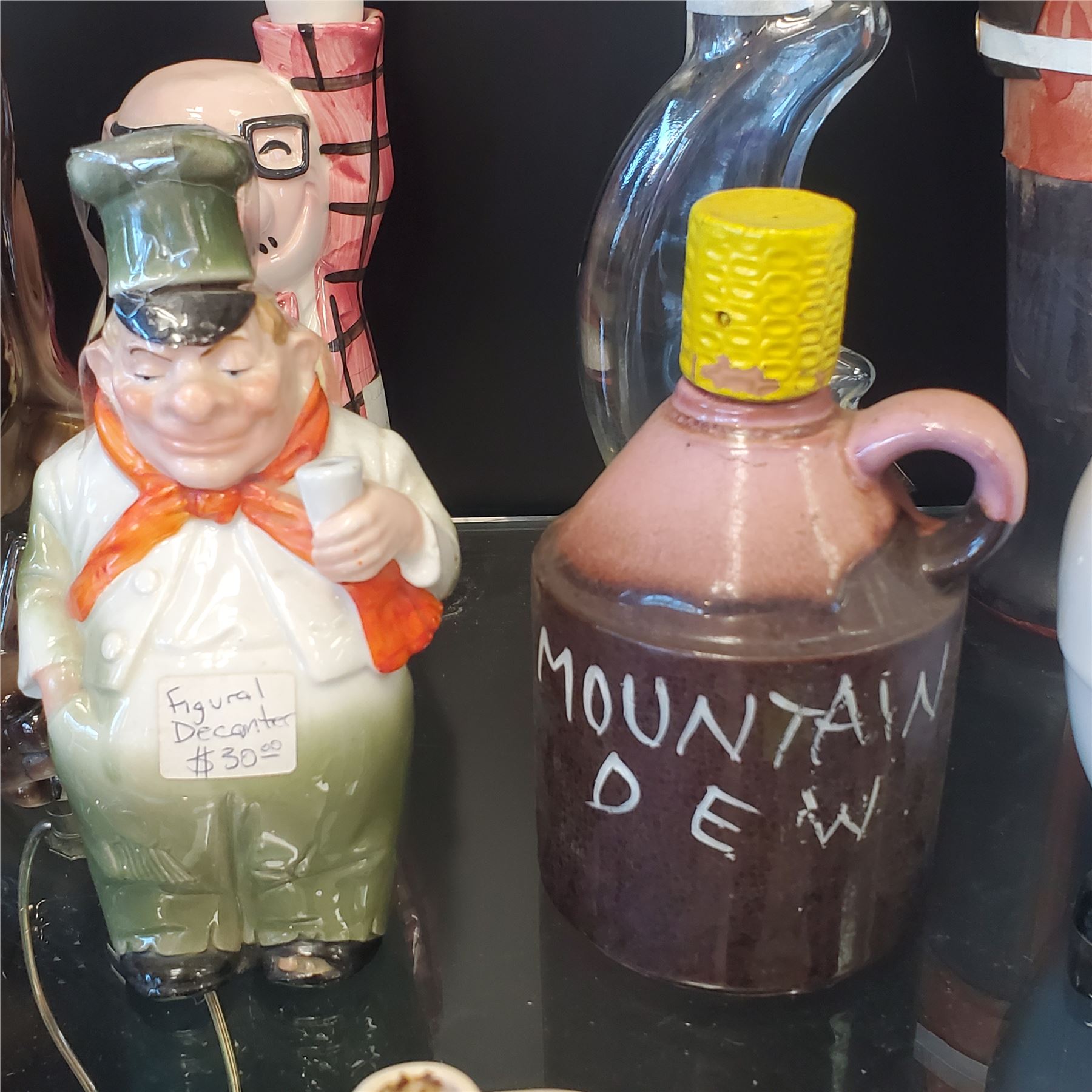 Lot of 10 assorted vintage decanters and liquor bottles. Various designs and materials included. Tallest piece measures 16.5-Inch in height. Items are as pictured.