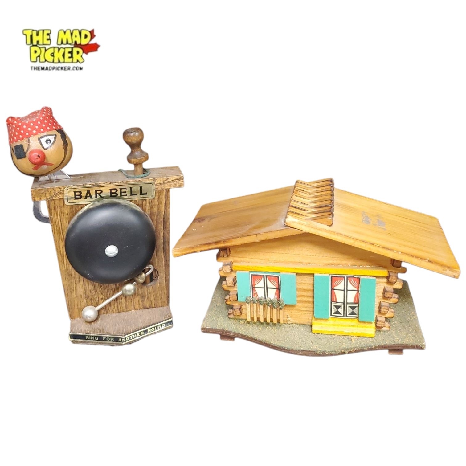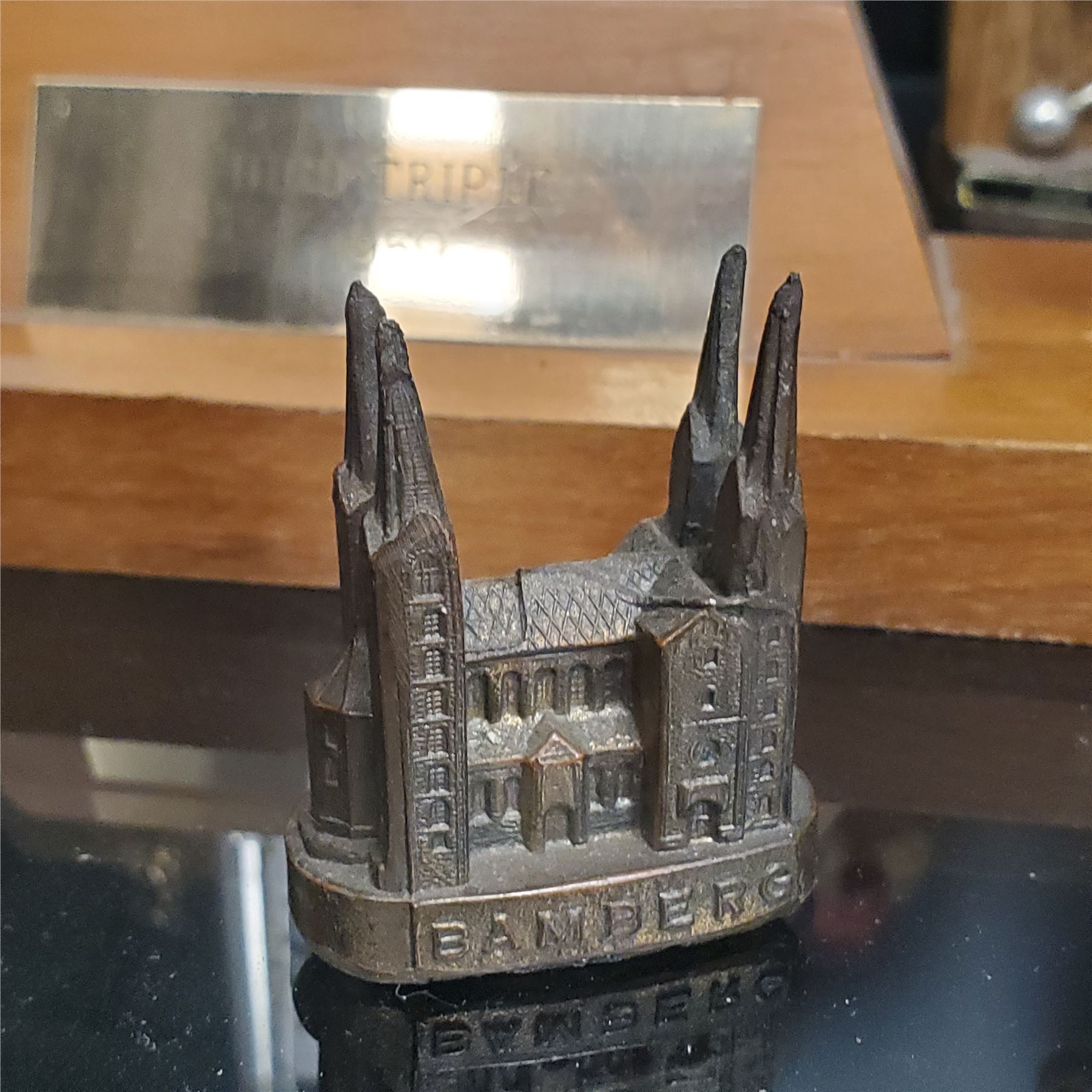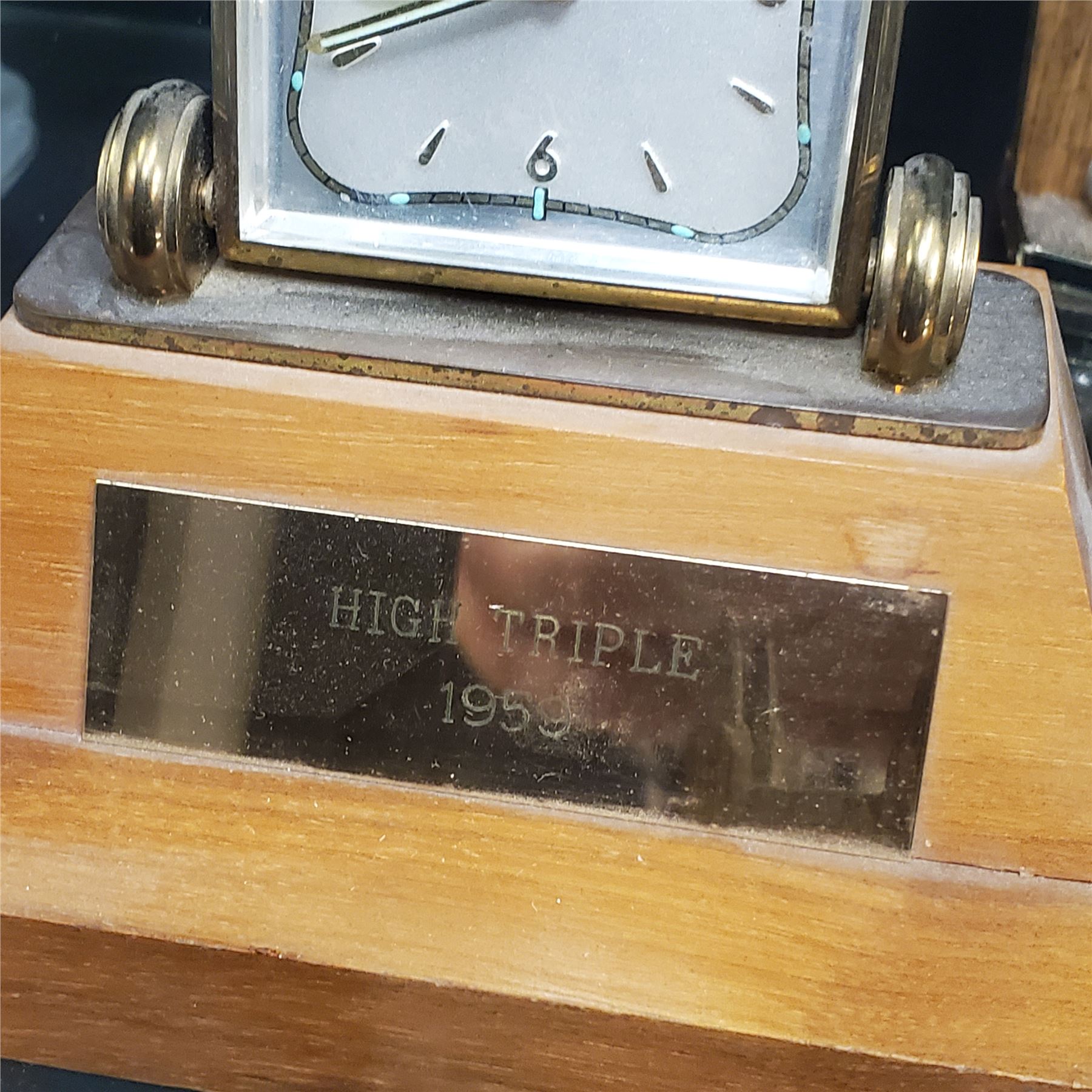 Collection of assorted vintage desk items, including bowling trophies, a bar bell, a clock, and various small souvenirs. Likely mid-20th century. Materials include metal and plastic components. Mixed themes suggest decorative and award-based pieces from varied origins of the era.