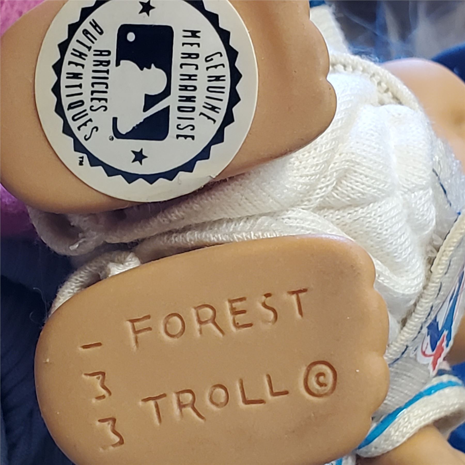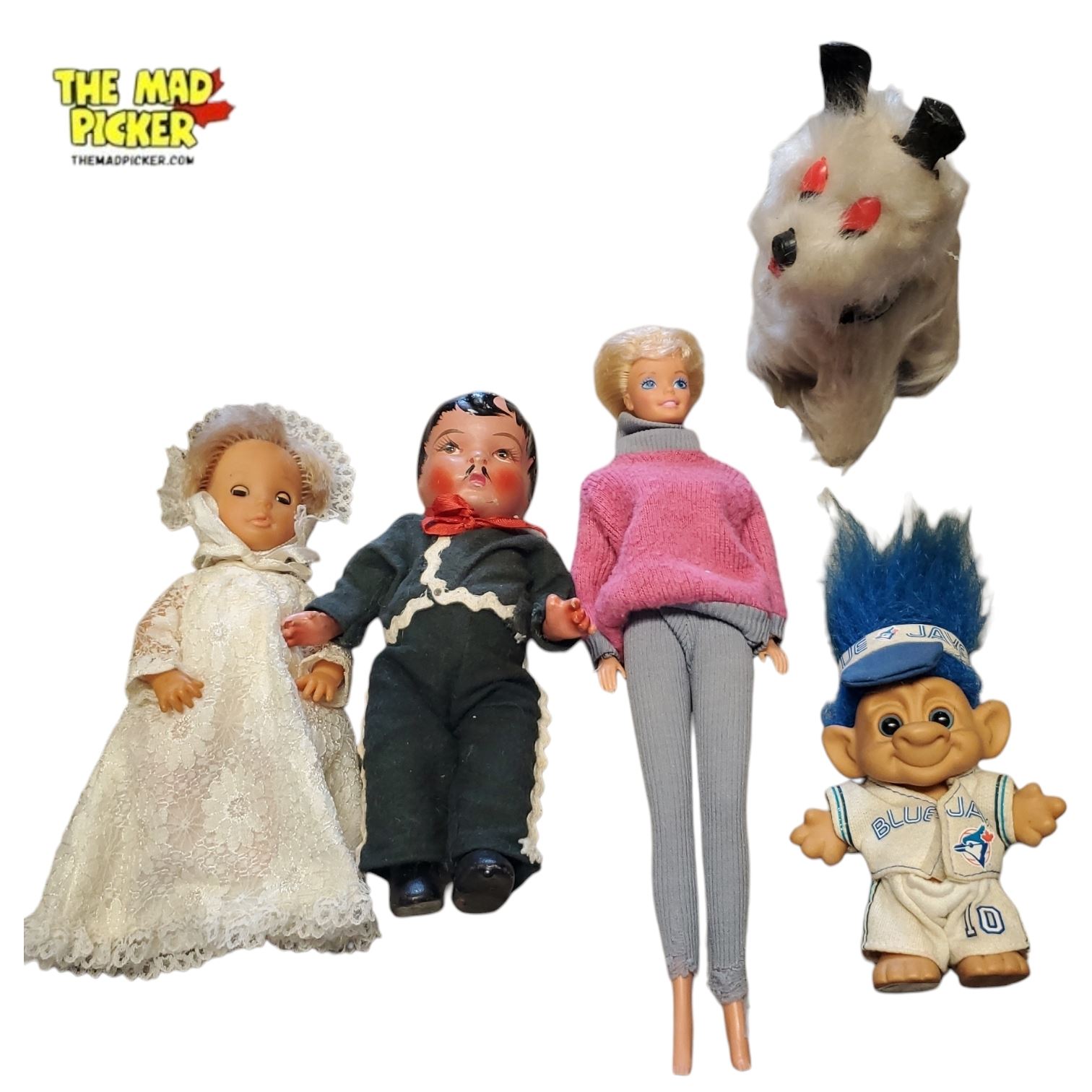 Lot of vintage Troll dolls, including a Russ Troll doll in a blue baseball uniform. Troll dolls trace their origins to Thomas Dam of Denmark, gaining popularity in the 1960s and resurging in the 1980s-1990s. Collectible group showcasing iconic designs from the era.