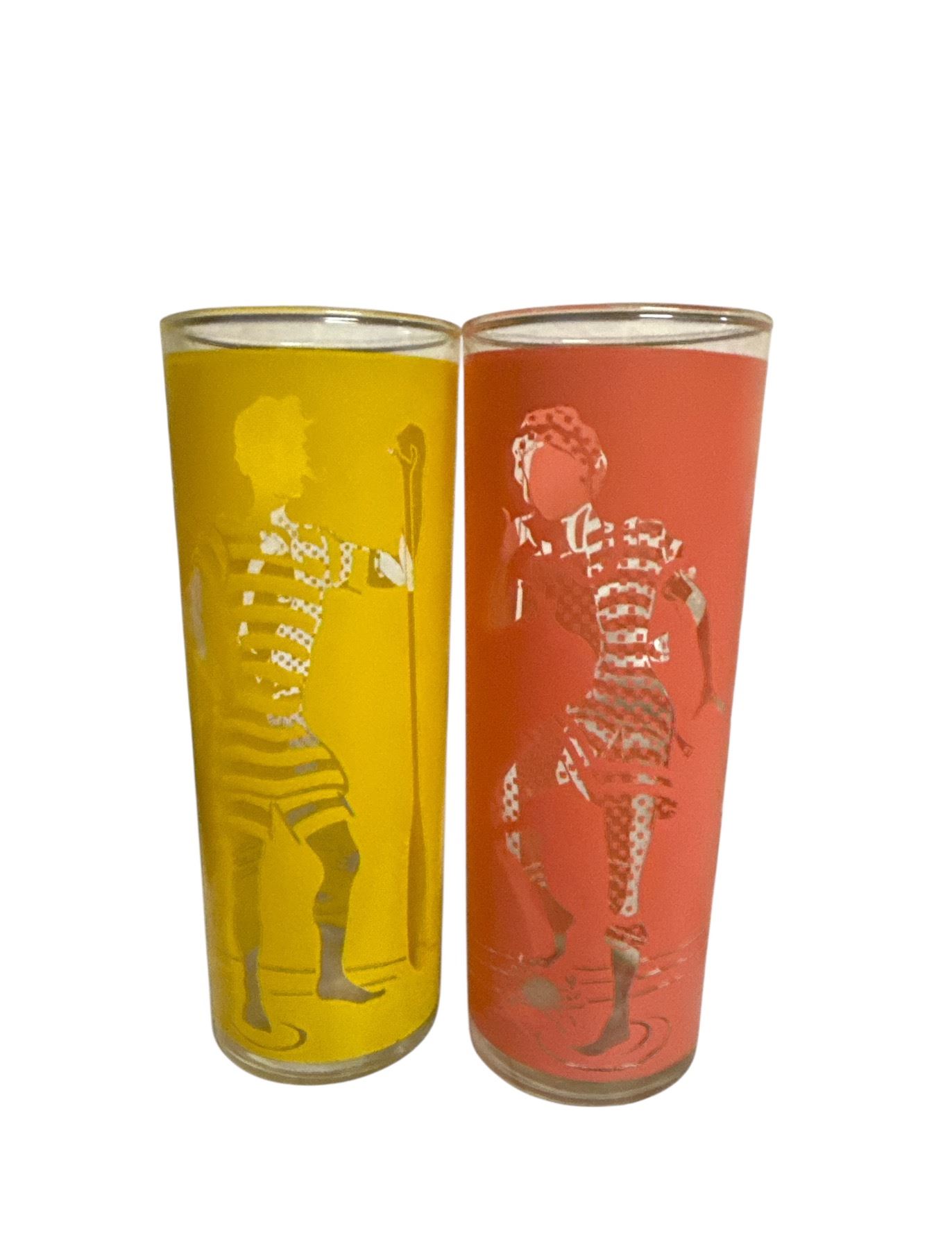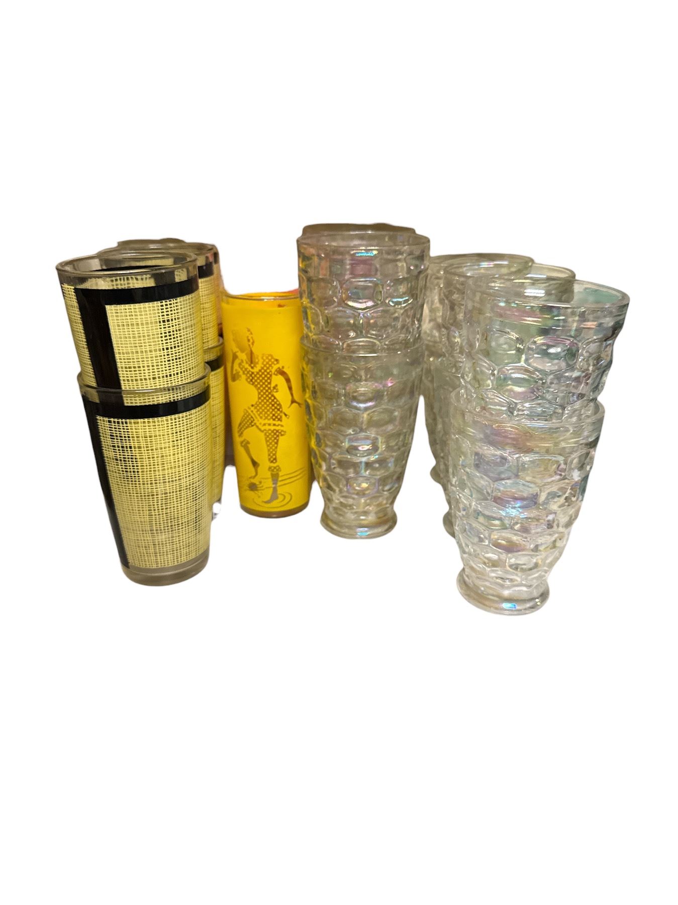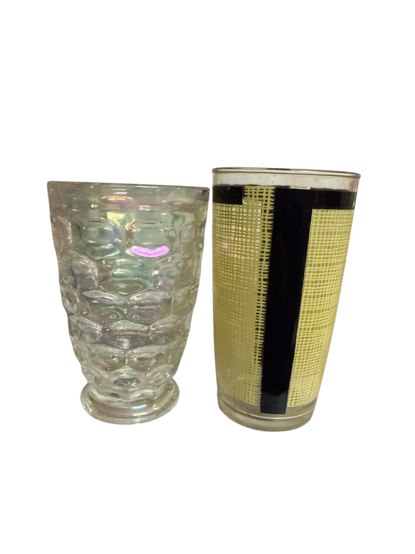 Assorted Vintage Drinking Glasses Including Iridescent Honeycomb Tumblers, Yellow Figural Highball, and Black & Gold Mid-Century Glasses