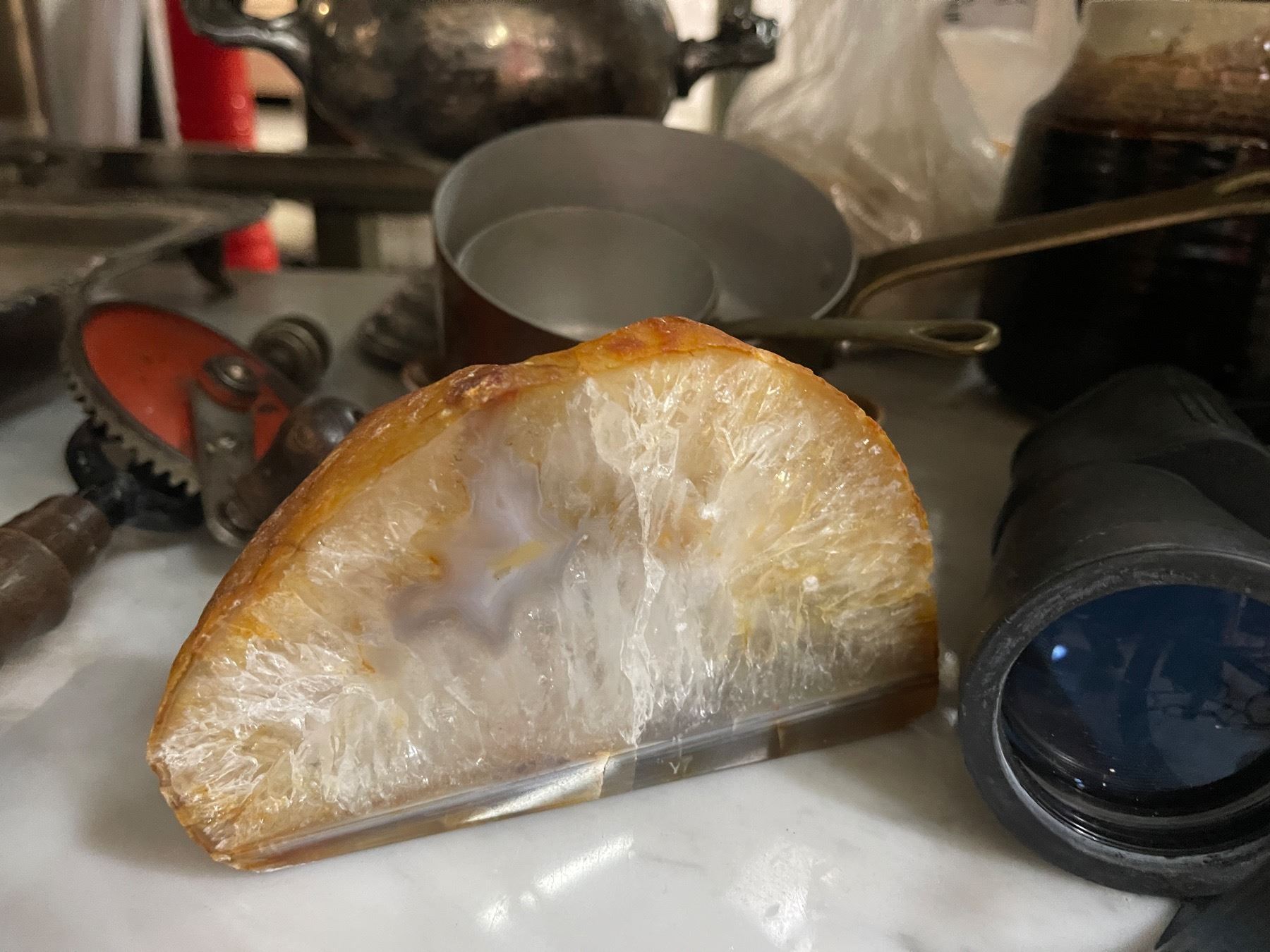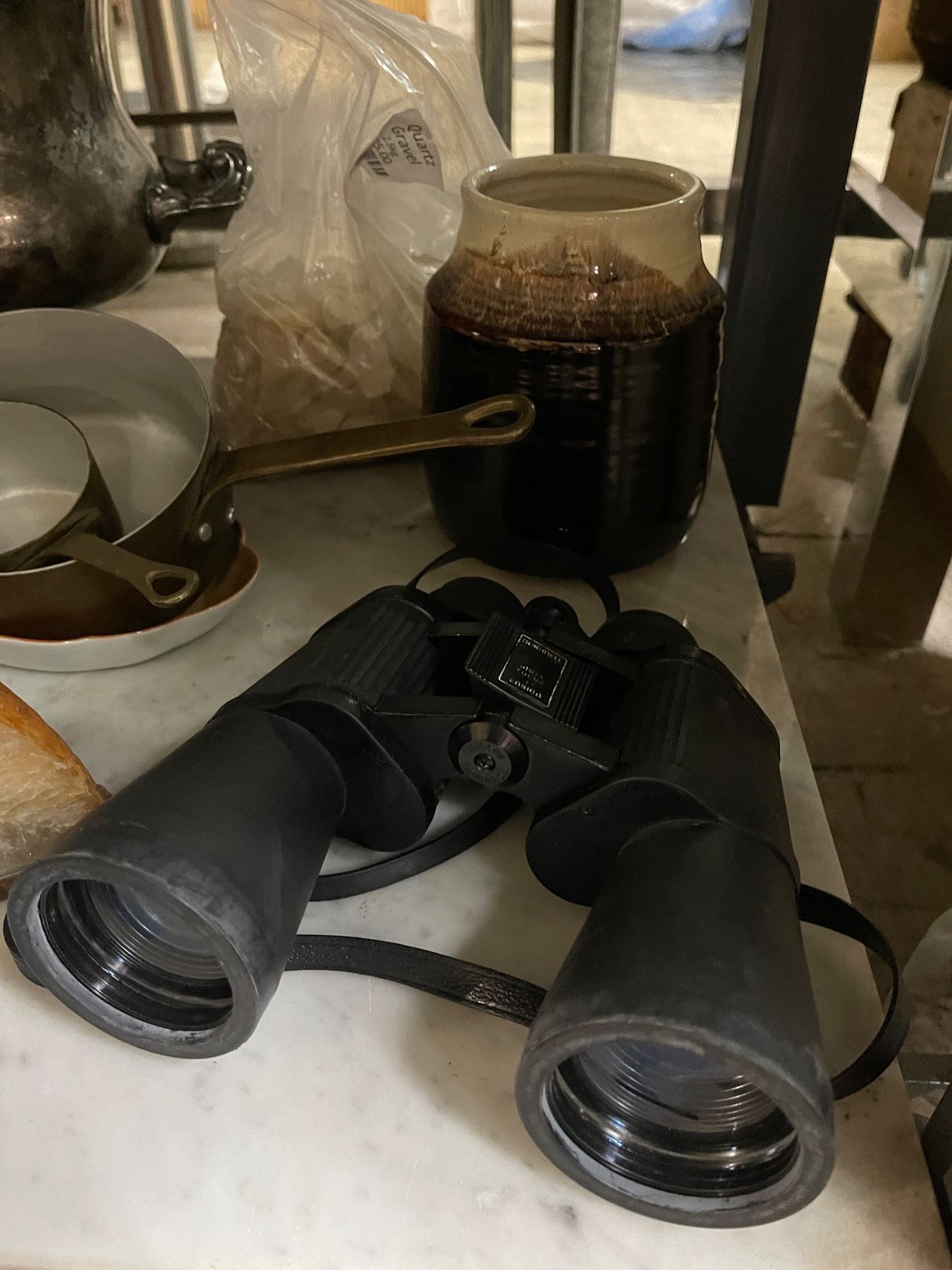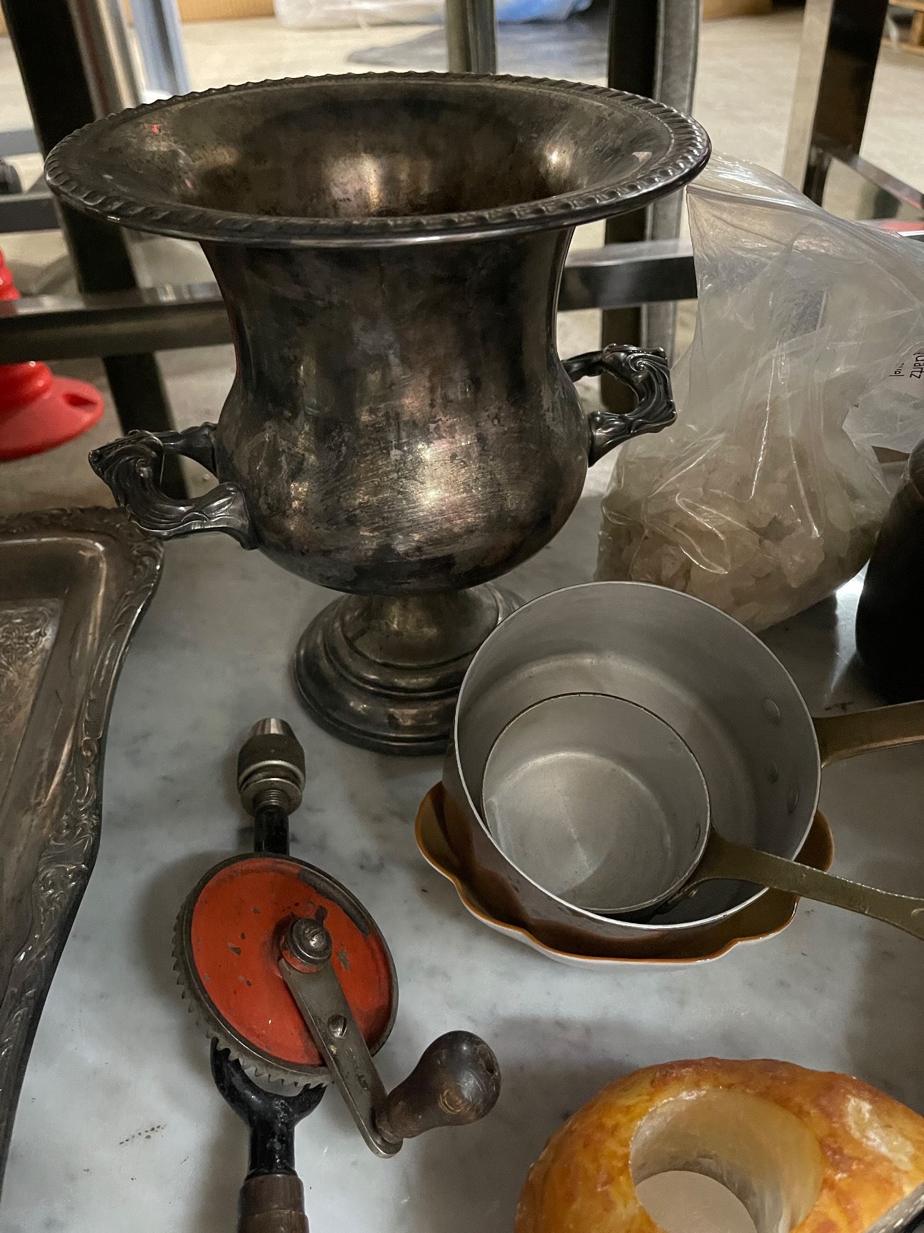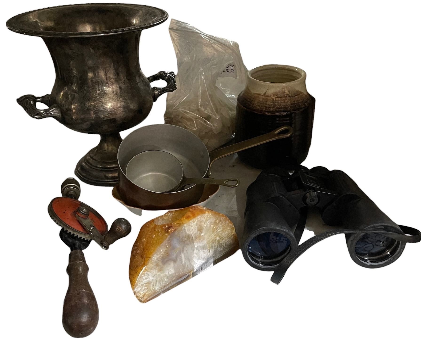 Assorted Vintage Items - Silver-Plated Bucket, Binoculars, Hand Drill, Copper Pots, and Agate Stone