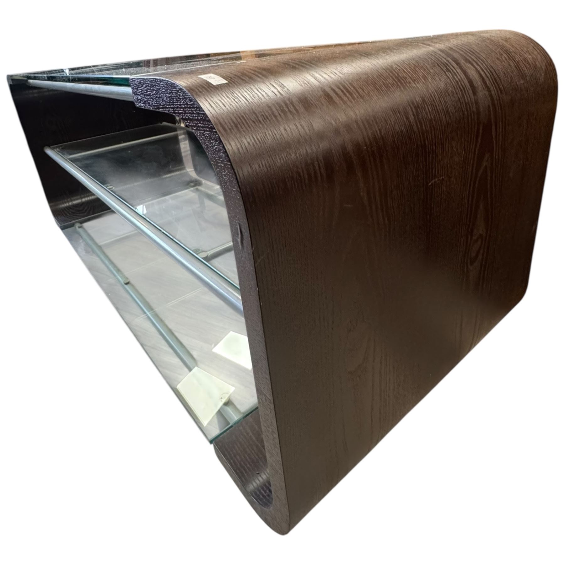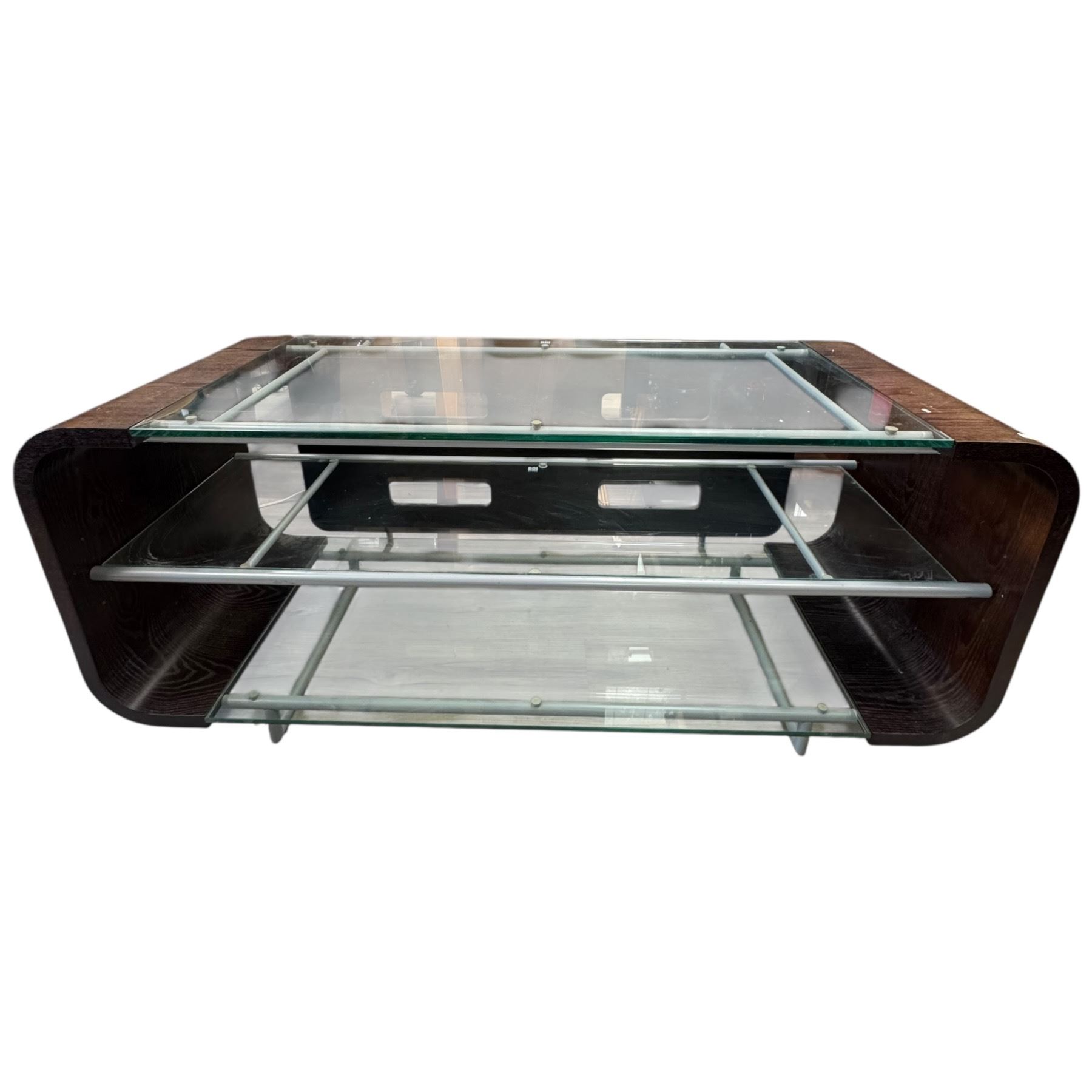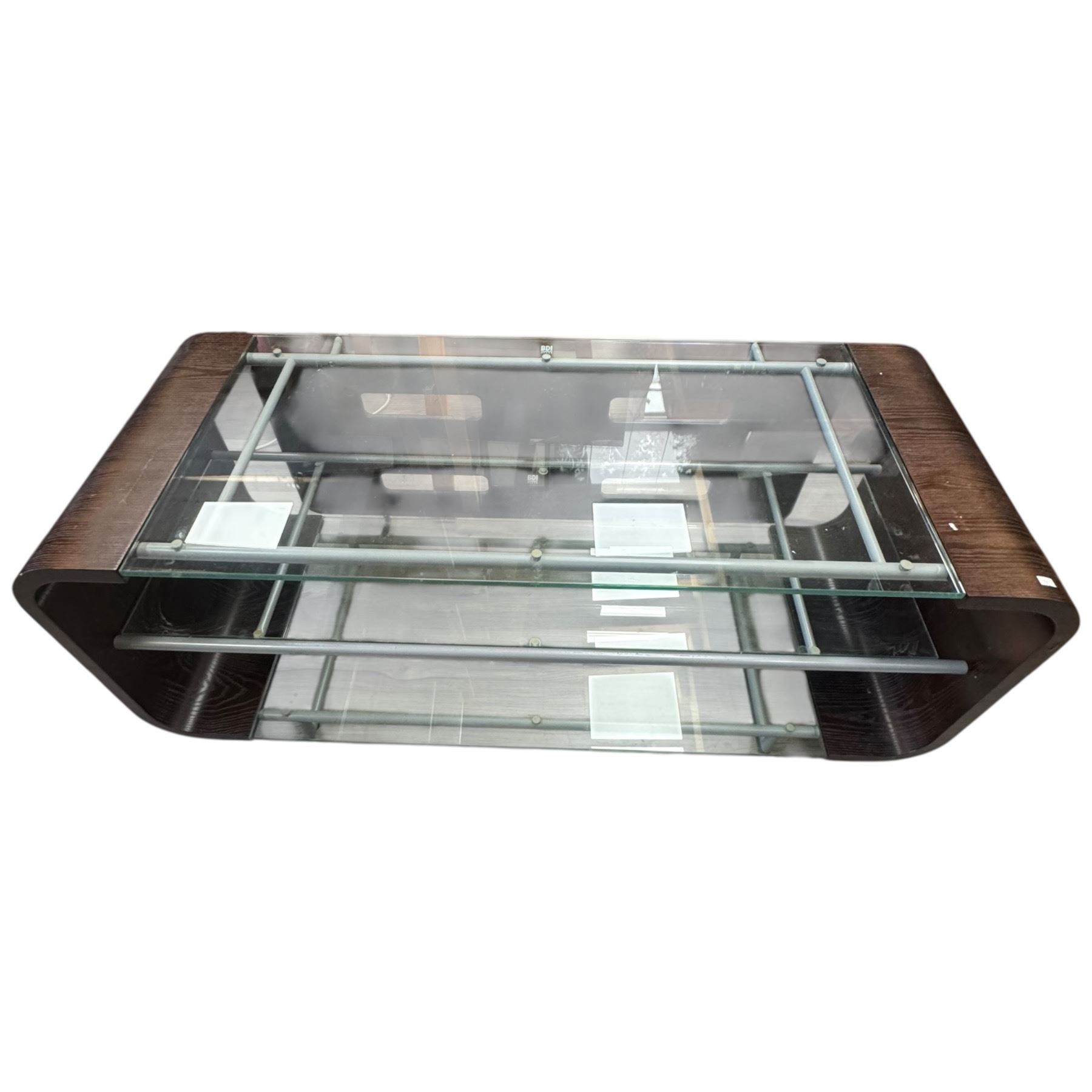 BDI modern TV stand featuring tempered glass and stylized wood design. Measures 48-Inch length, 18.5-Inch width, and 20-Inch height. Designed for media storage and contemporary interiors. Item is as pictured.