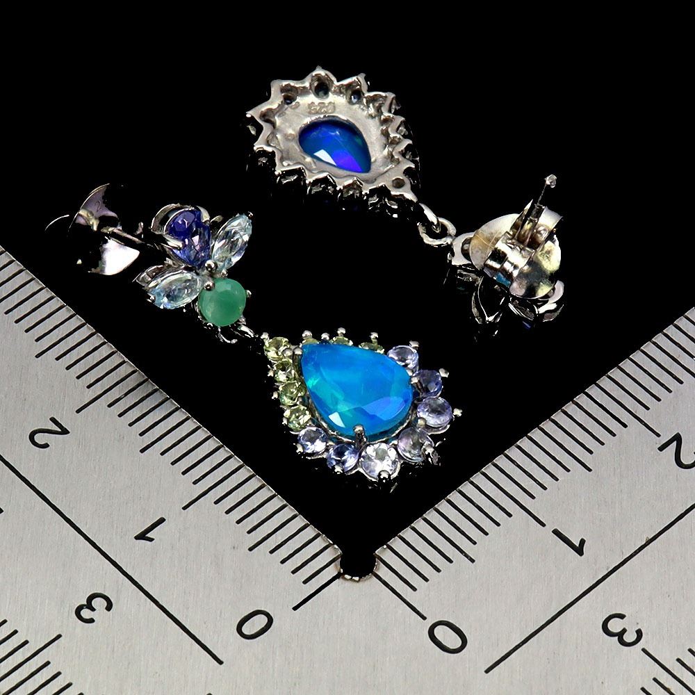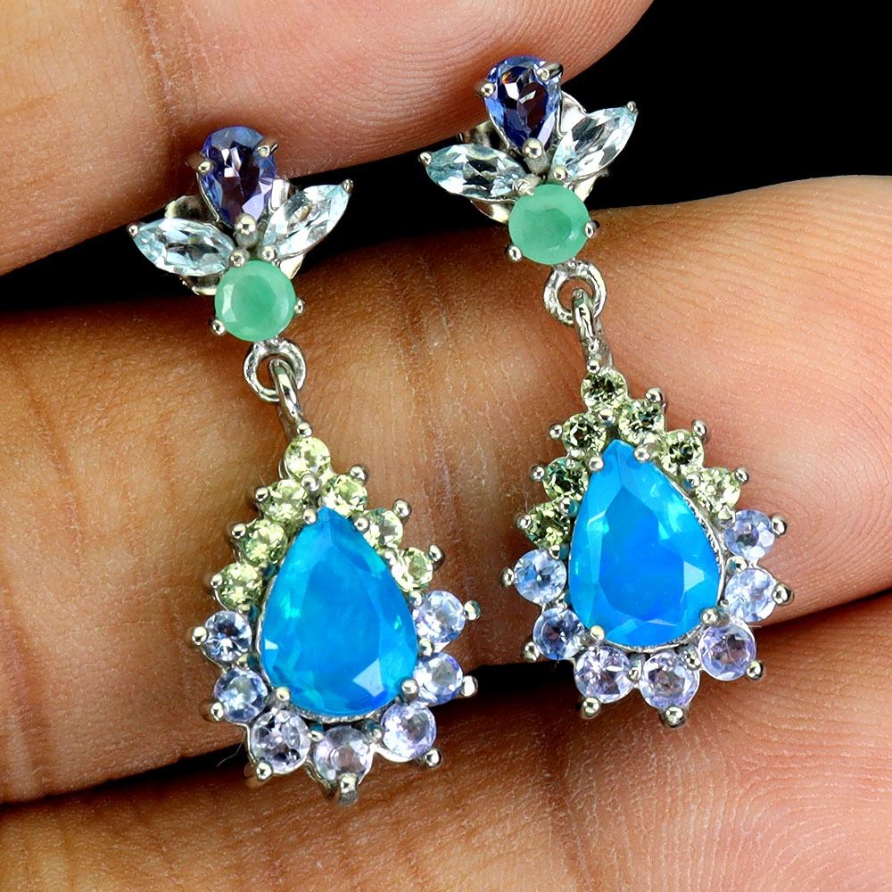 BEAUTIFUL PEAR CUT BLUE OPAL, EMERALD AND TANZANITE EARRINGS IN 14K WHITE PLATED GOLD OVER 925 STERLING SILVER - APPRAISED REPLACEMENT VALUE CAD 940