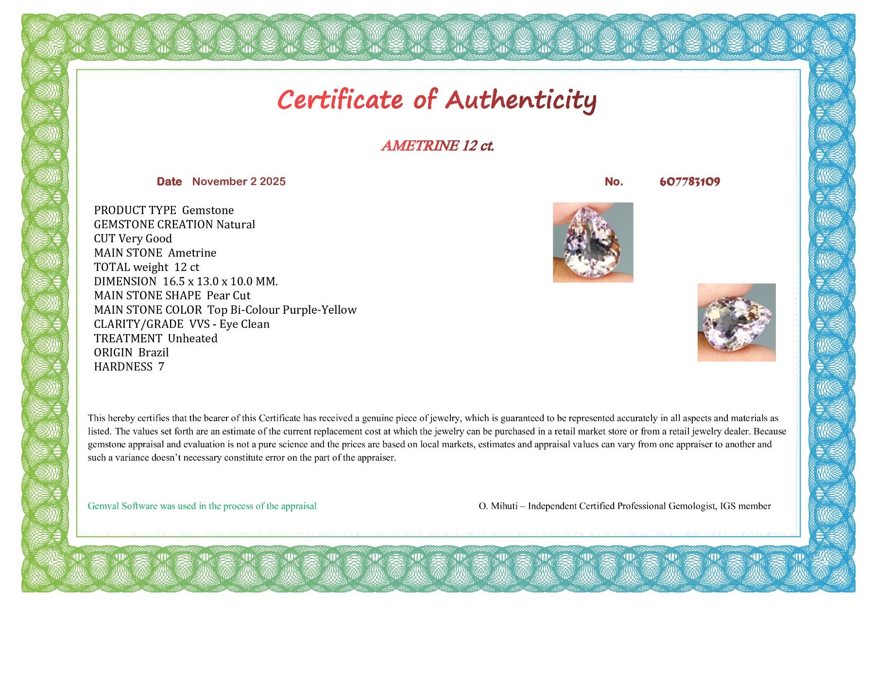 BEAUTIFUL PEAR CUT NATURAL 12 CT. AMETRINE (AMETHYST AND CITRINE) UNTREATED - Estimated Value - CAD 2,250