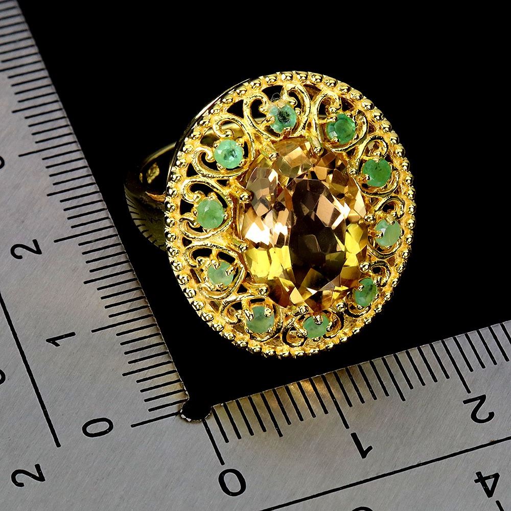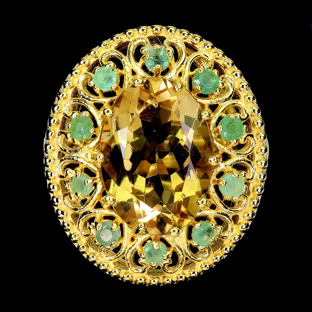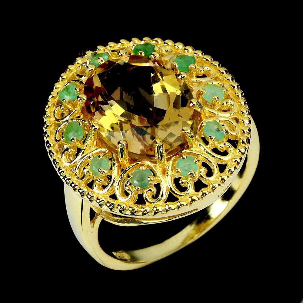 BIG 14X10 mm OVAL CUT CITRINE AND EMERALD IN 14K YELLOW PLATED GOLD OVER 925 STERLING SILVER - SIZE 7 - APPRAISED REPLACEMENT VALUE CAD 950