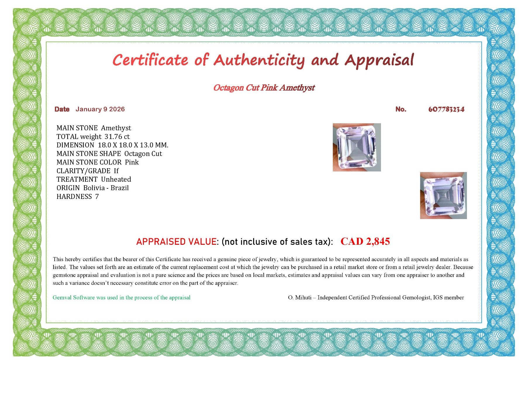 BIG 31.76 CARATS OCTAGON CUT UNHEATED BOLIVIAN PINK AMETHYST18mm - APPRAISED REPLACEMENT VALUE CAD 2,845