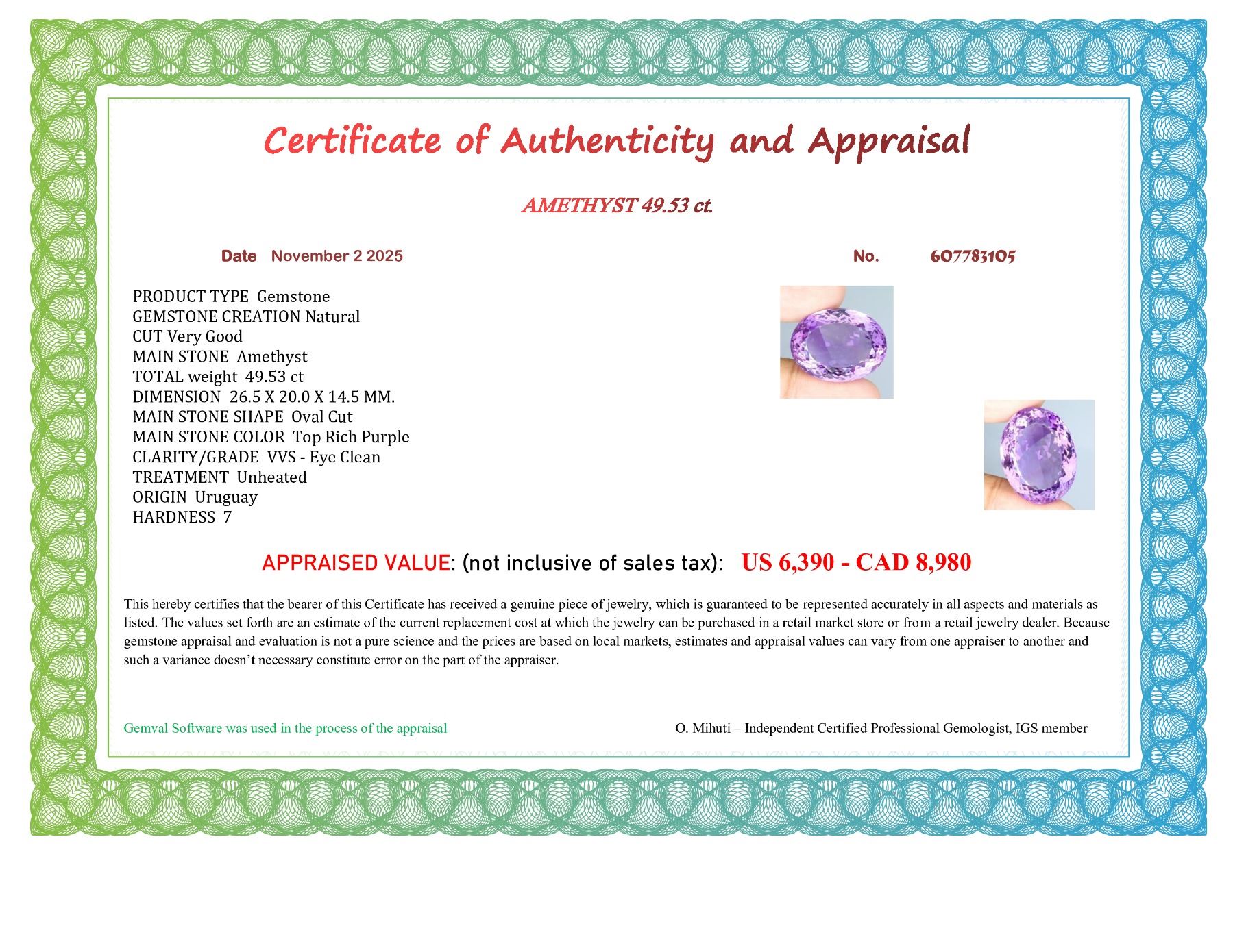 BIG 49.53 CT. NATURAL AMETHYST - Appraised Value CAD 8,980