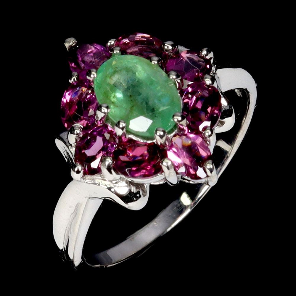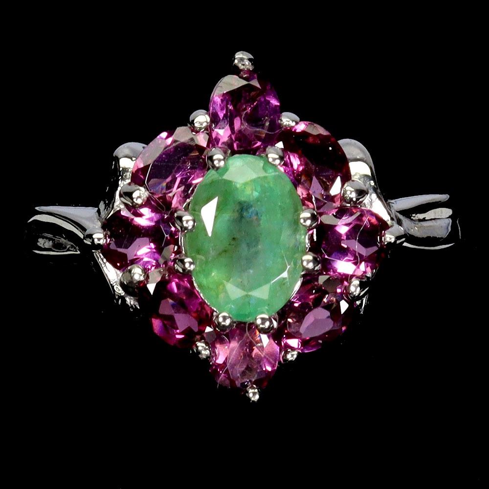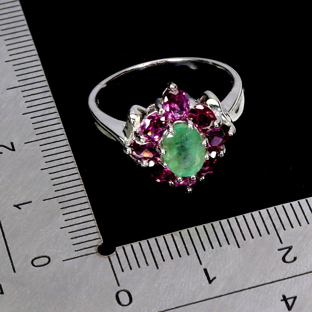 BIG 7X6 mm OVAL EMERALD AND RHODOLITE GARNET RING IN 14K WHITE GOLD PLATED OVER 925 STERLING SILVER - SIZE 7 - APPRAISED REPLACEMENT VALUE CAD 790