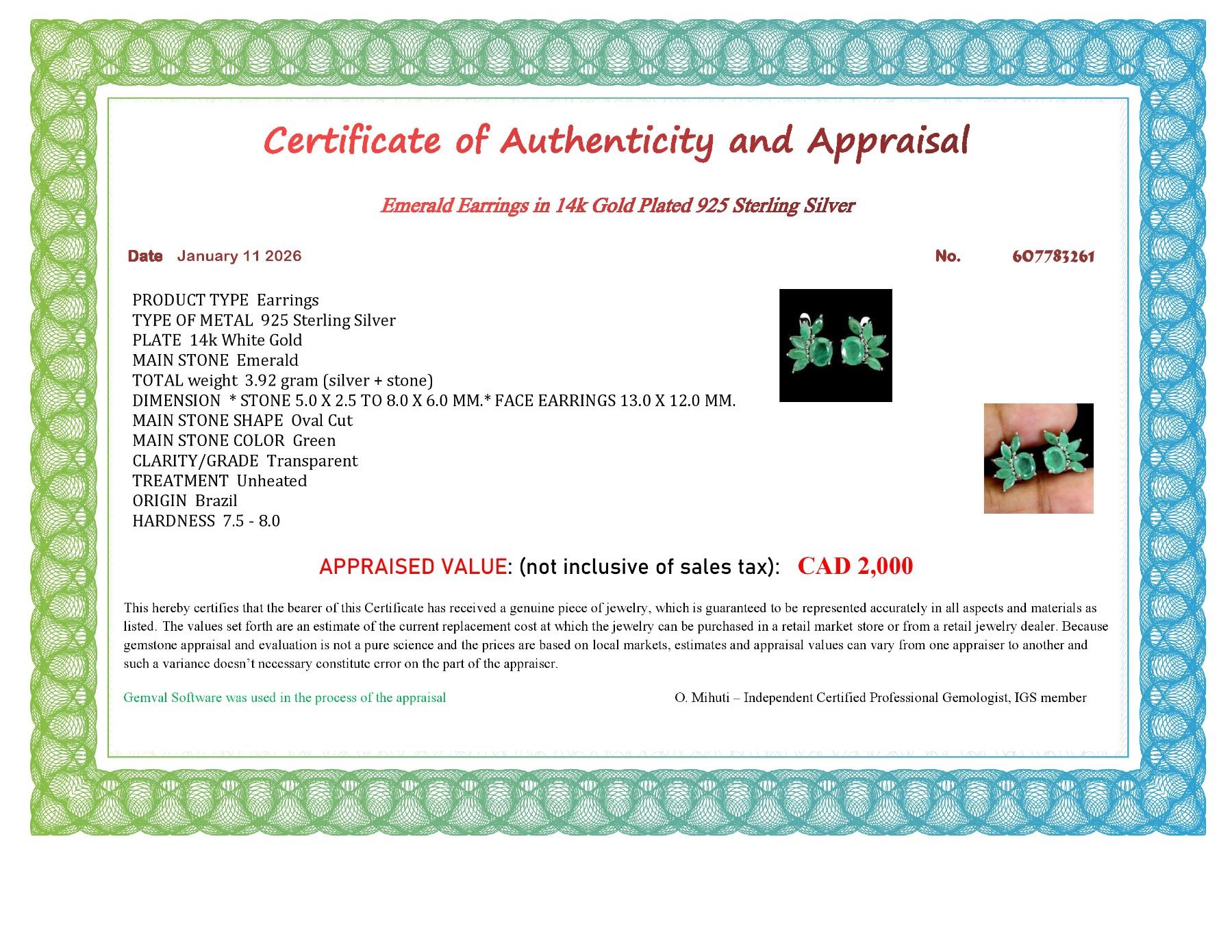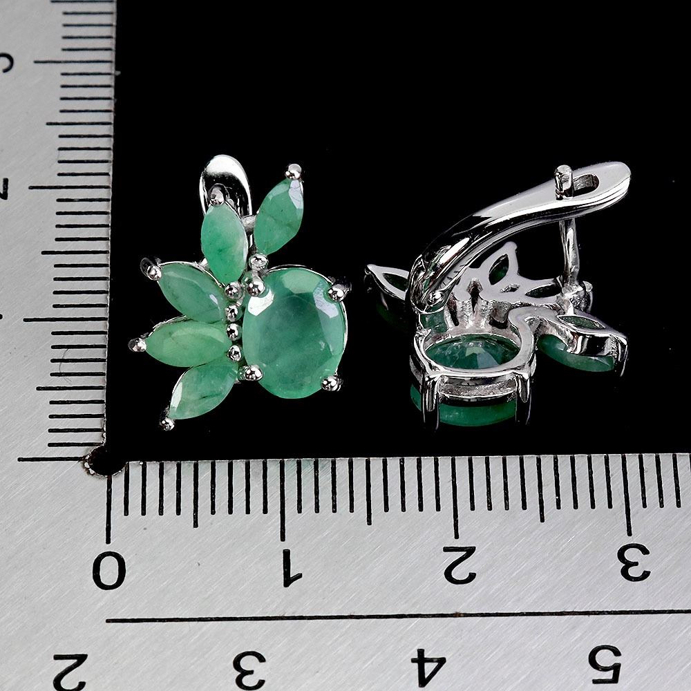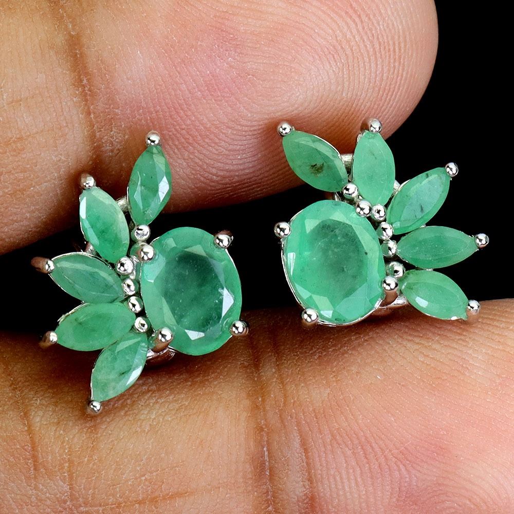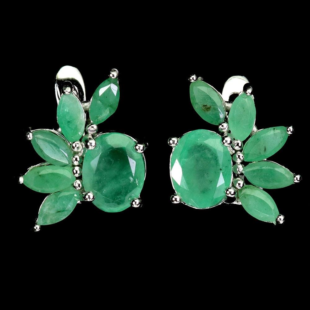 BIG 8X6 mm OVAL EMERALD EARRINGS IN 14K WHITE PLATED GOLD OVER 925 STERLING SILVER - APPRAISED REPLACEMENT VALUE CAD 2,000