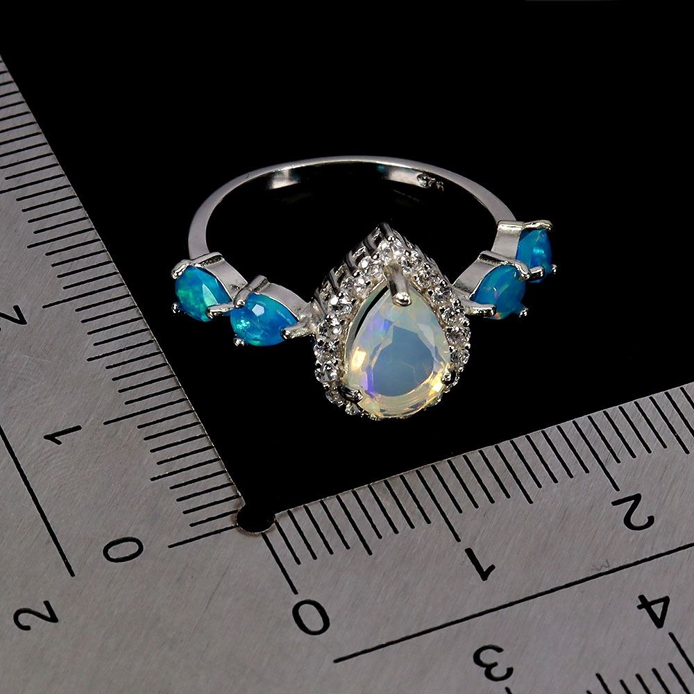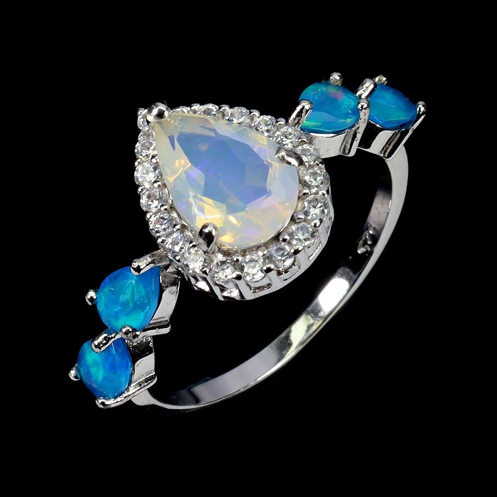 BIG 9X6 mm PEAR CUT FIRE OPAL AND BLUE OPAL RING IN 14K WHITE GOLD PLATED OVER 925 STERLING SILVER - SIZE 7 - APPRAISED REPLACEMENT VALUE CAD 680