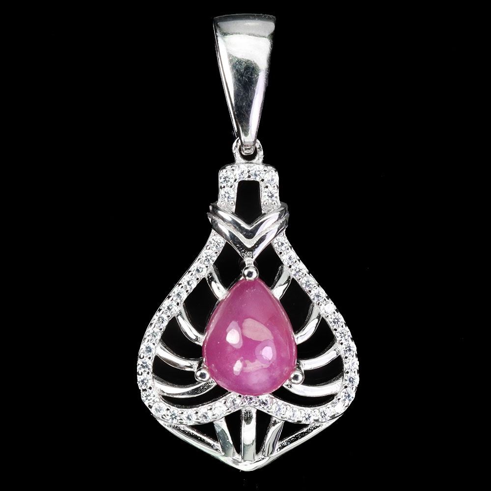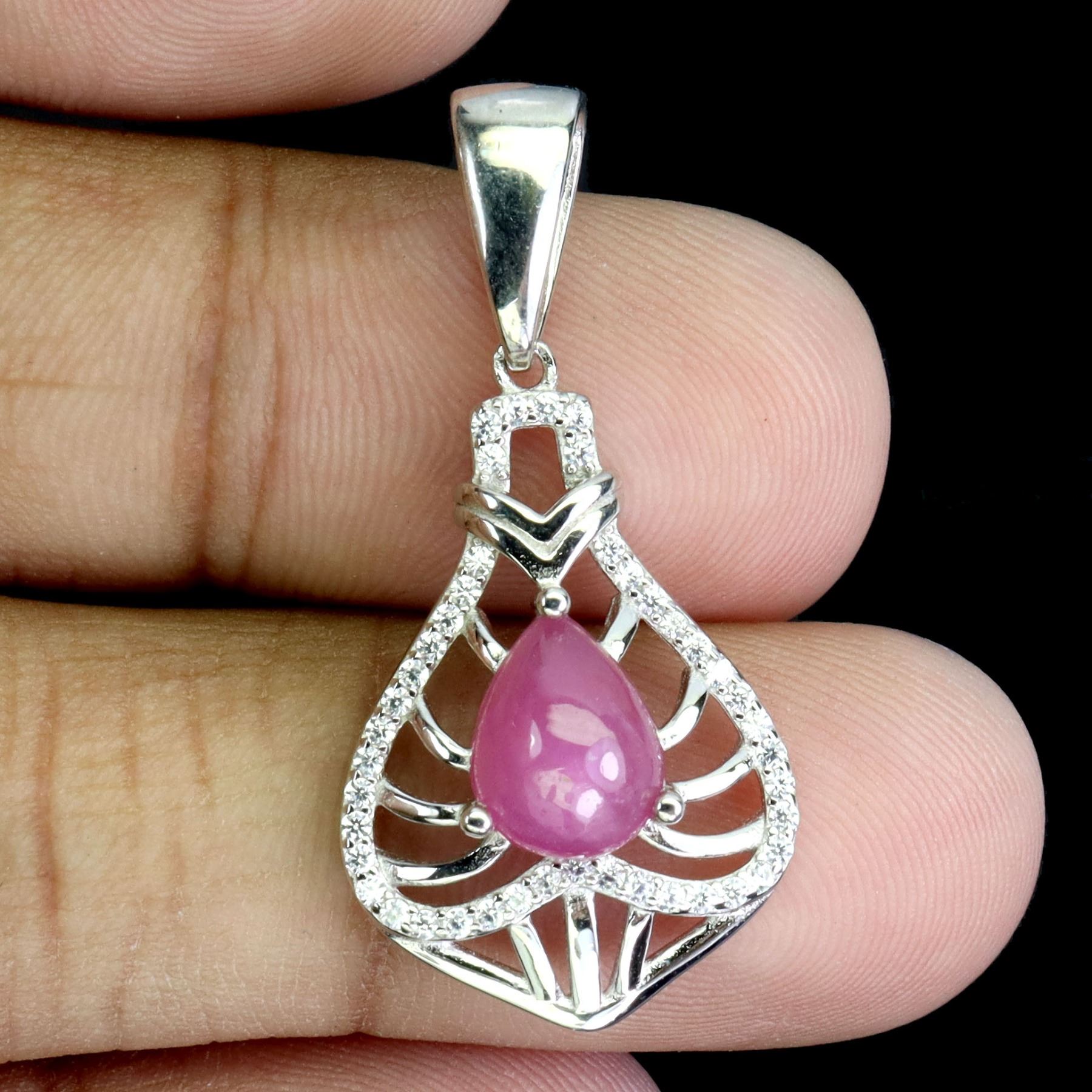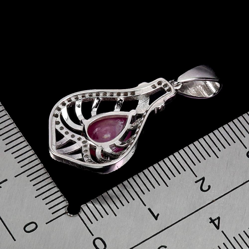 BIG 9X7 mm PEAR CUT RUBY CABOCHON AND CZ PENDANT IN 14K WHITE PLATED GOLD OVER 925 STERLING SILVER - APPRAISED REPLACEMENT VALUE CAD 400