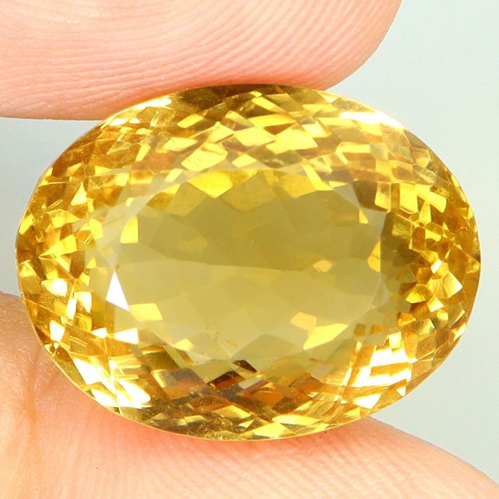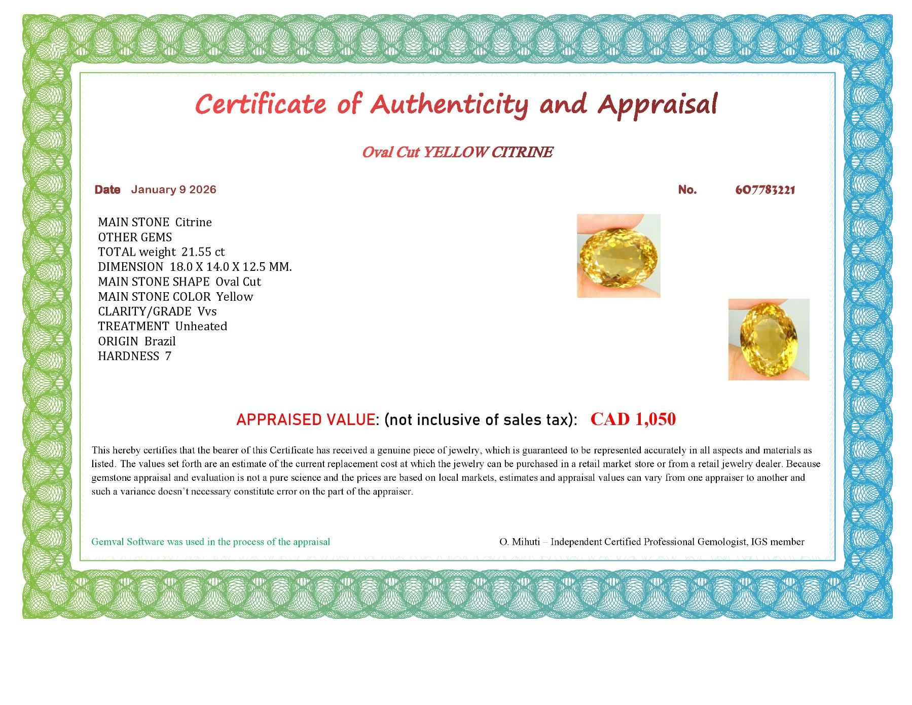 BIG OVAL CUT UNHEATED TOP YELLOW CITRINE 21.55 CARATS 18X14 mm BRAZIL- APPRAISED REPLACEMENT VALUE CAD 1,320