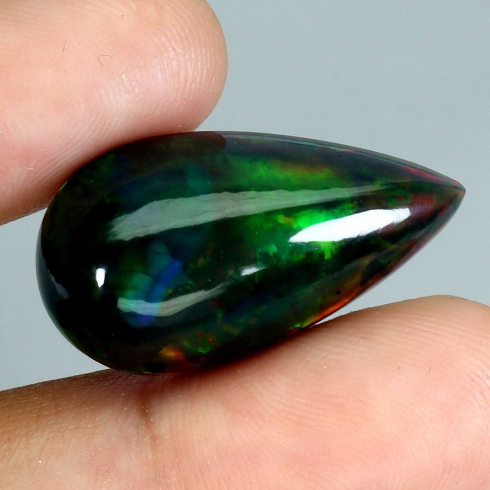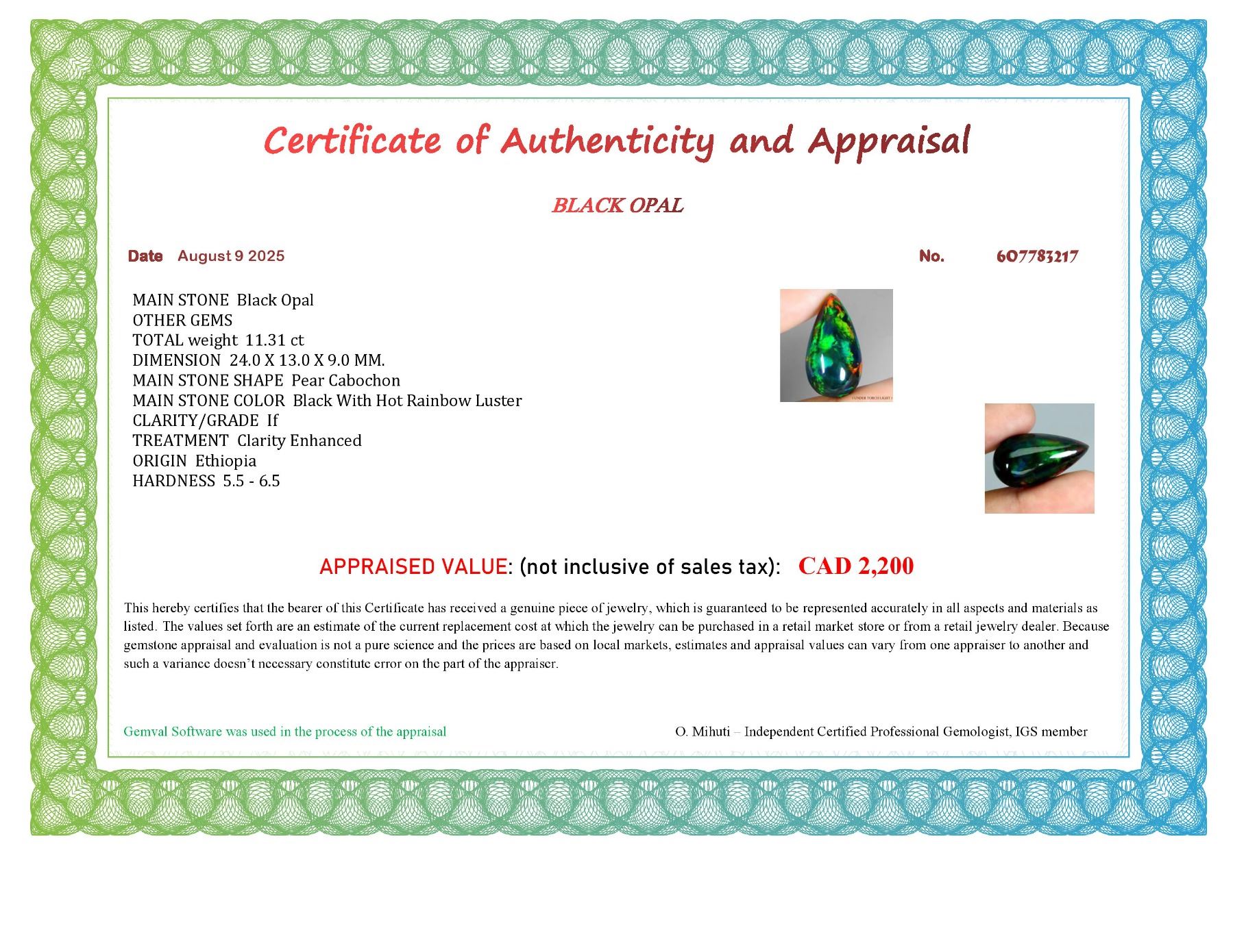 BIG PEAR CABOCHON AAA FLORAL FLASH PLAY OF COLOR BLACK OPAL 11.41 CARATS 24X13 mm RARE GEMSTONE - APPRAISED CERTIFIED VALUE CAD 2,200