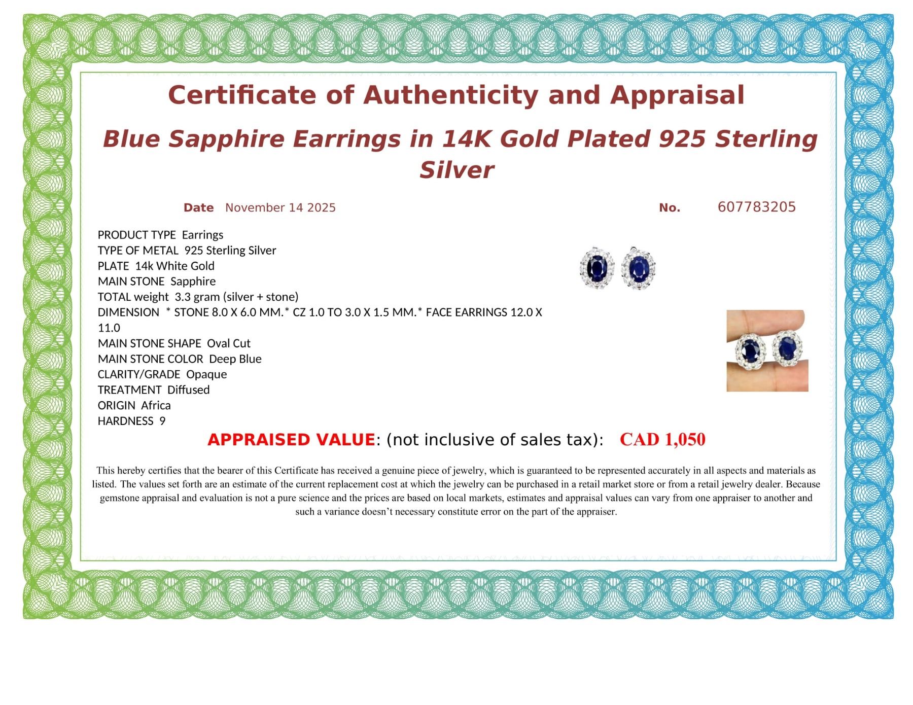 BLUE SAPPHIRE EARRINGS IN 14K WHITE PLATED GOLD OVER 925 STERLING SILVER - APPRAISED REPLACEMENT VALUE $ 1,050