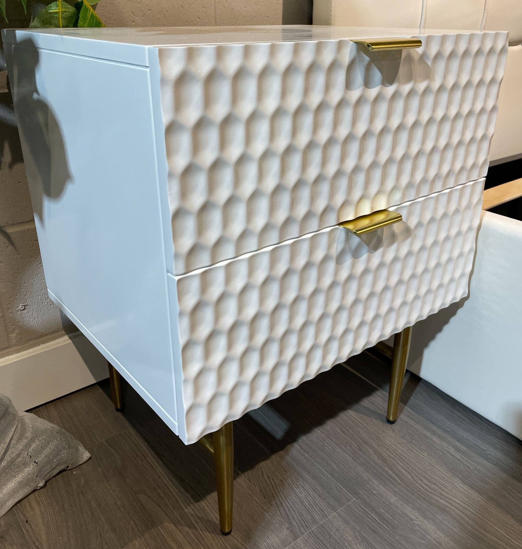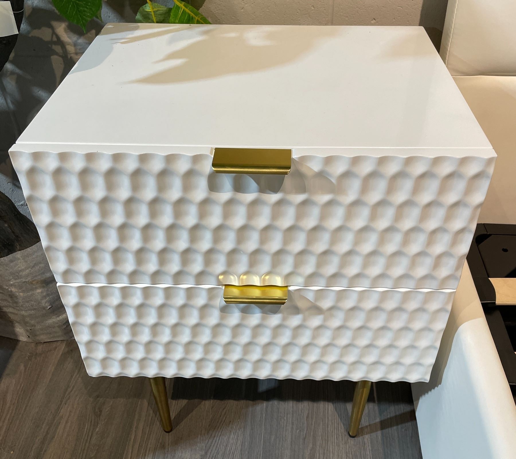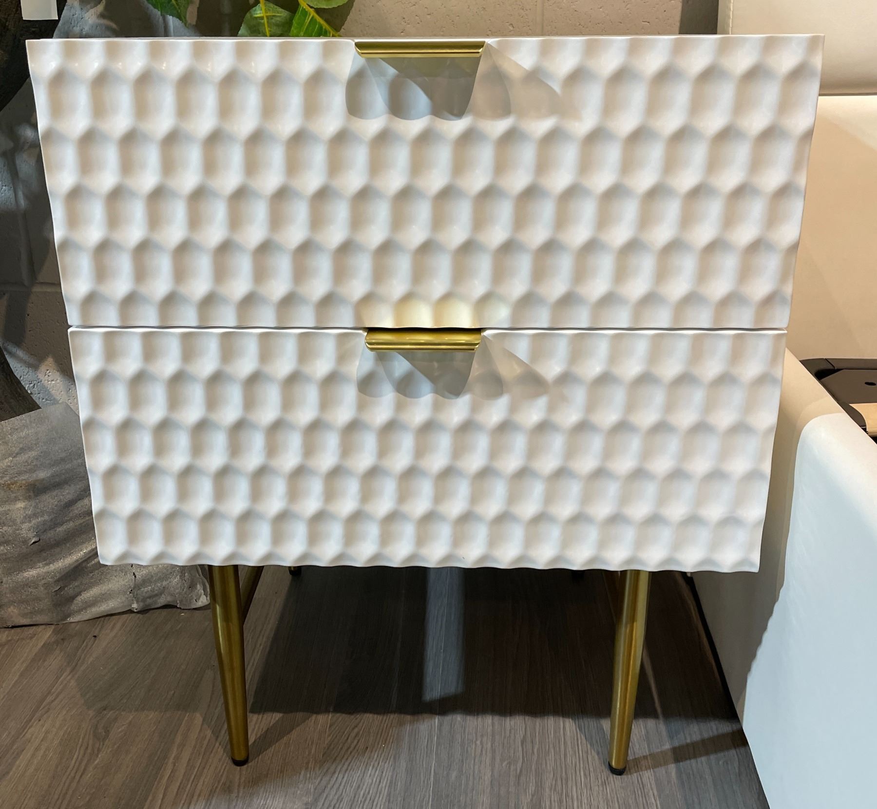 Brand new in box. modern stylish nightstand with golden colour feet. Size about 21L ◊ 17D ◊ 26H; colours white or black.