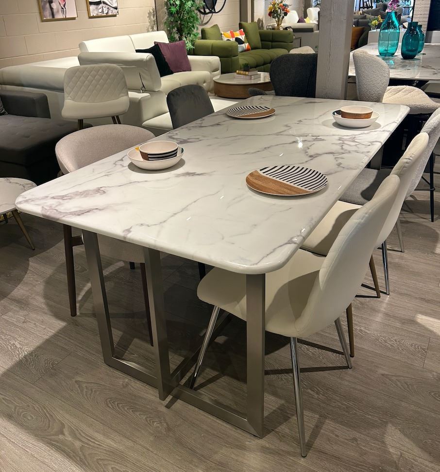 Brand new in box. beautiful round marble dining table with artistic base. Size options include 59” or 71” diameter and base finishes in gold or silver. Selected variant: 59" Silver.