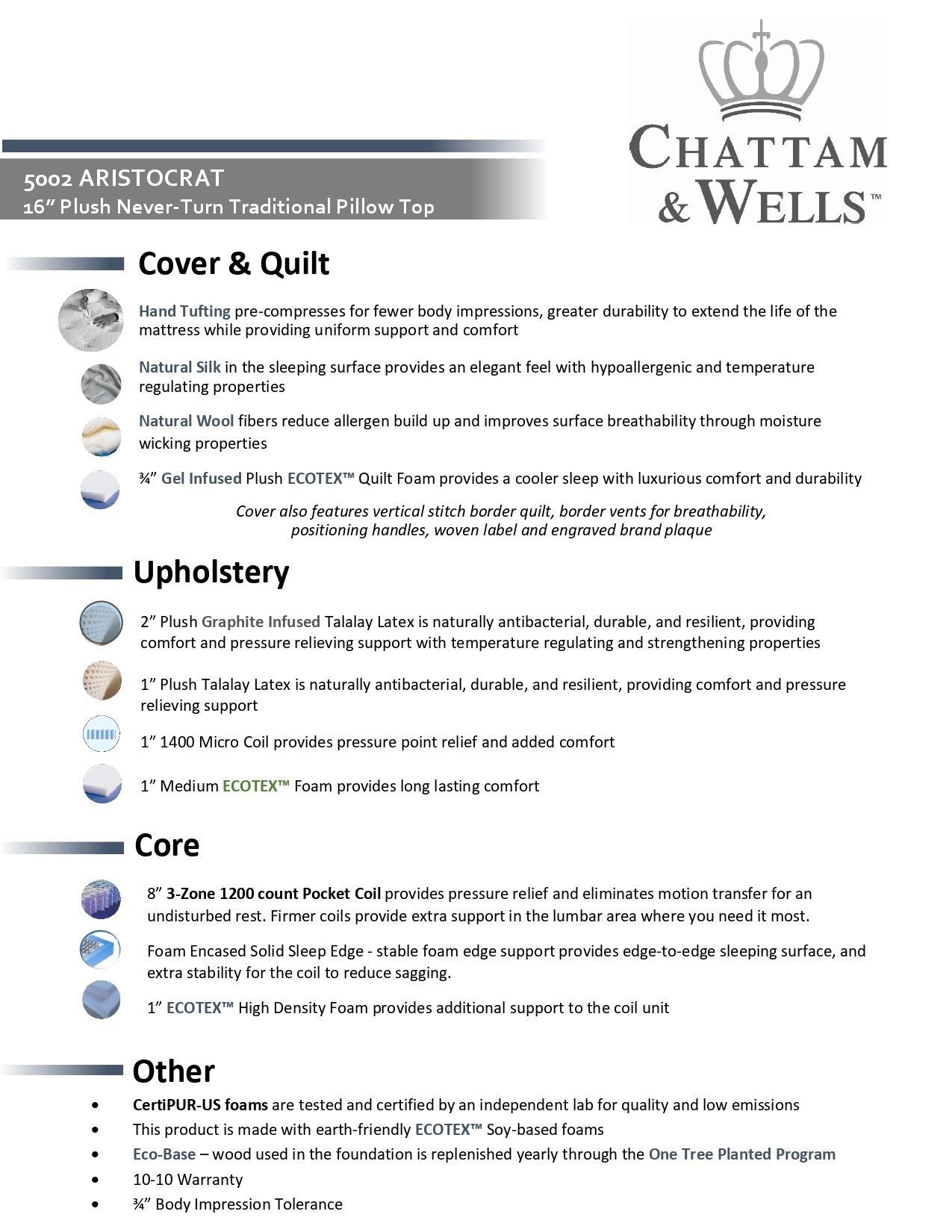 BNIB Chattam & Wells - 5002 Aristocrat 16" Plush Never-Turn Traditional Pillow Top Queen Mattress