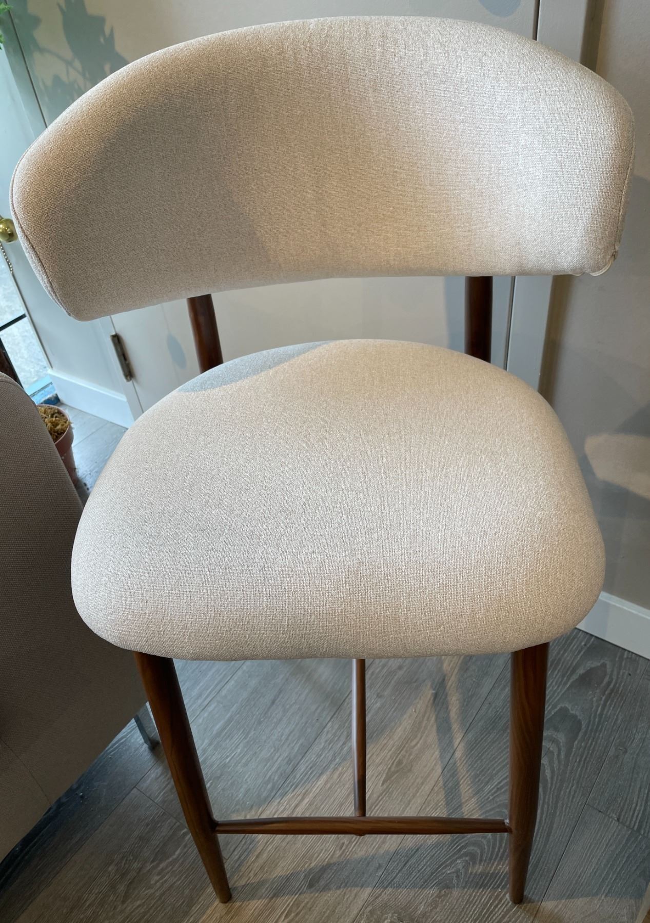 Brand new in box. pair of modern teddyfabric bar chairs with metal frame and woodcolour finish; colour beige. Selected variant: Group of 2.