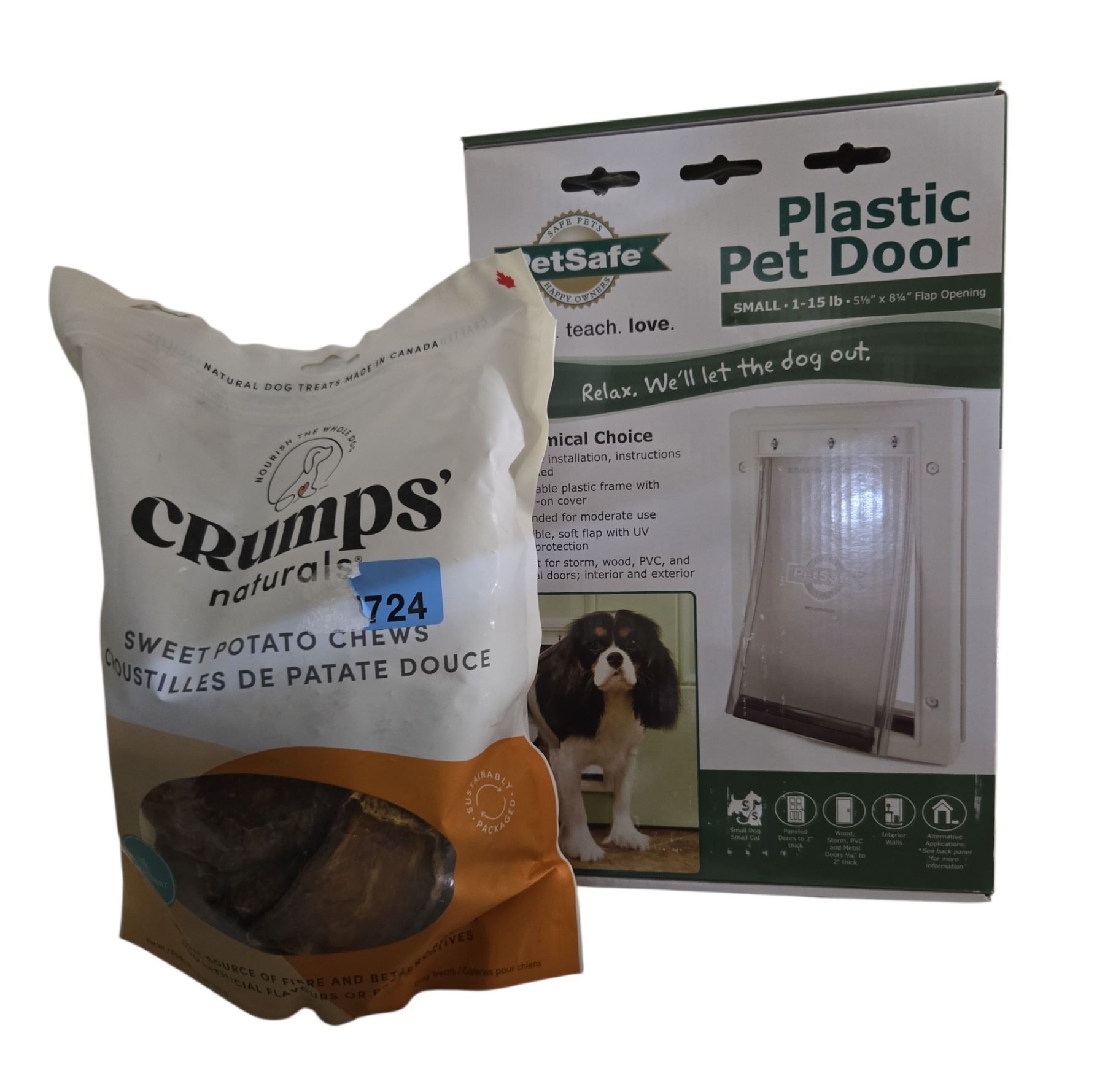 BNIB Group of 2 Plastic Pet Door & Crumps Sweet Potato Chews