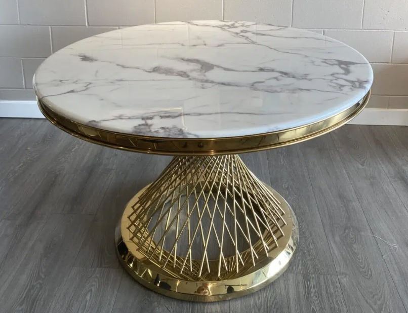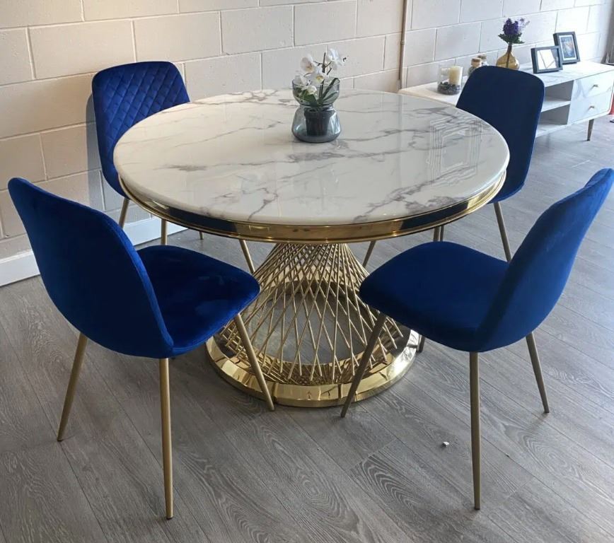Brand new in box. marble round dining table with elegant designed base. Standard size 47diameter; a larger 53option available; base colours golden or silver. Selected variant: 53" Pandora.
