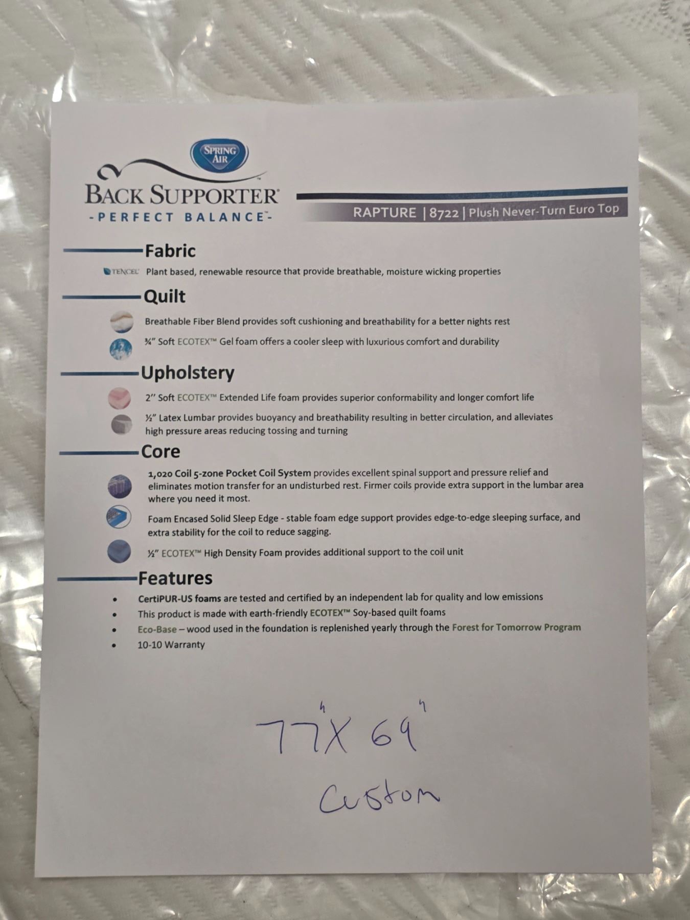 BNIB - Rapture 10 1/2in Euro TOp Mattress - 77in x 69in (RV King)