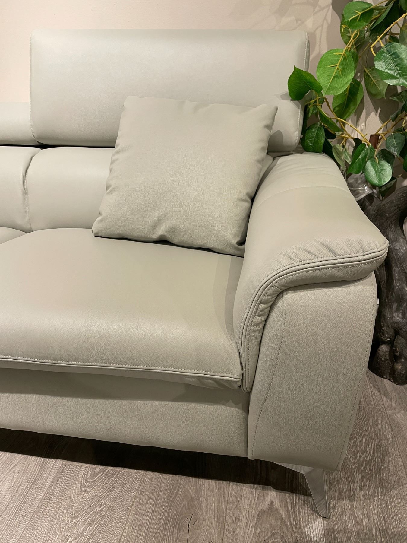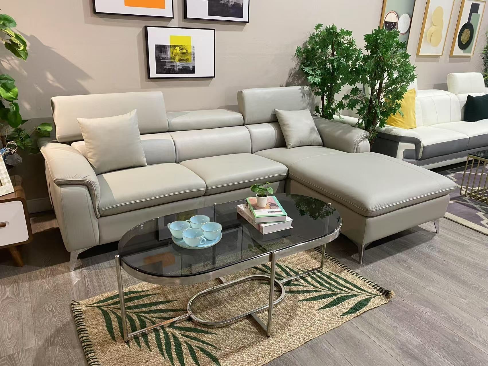 Brand new in box. brand new realleather Lshape sectional couch with tidy design. Size approx 100L x 36D x 37H; chaise 68; colours black, white or light grey; left or right chaise. Selected variant: Grey - Right.