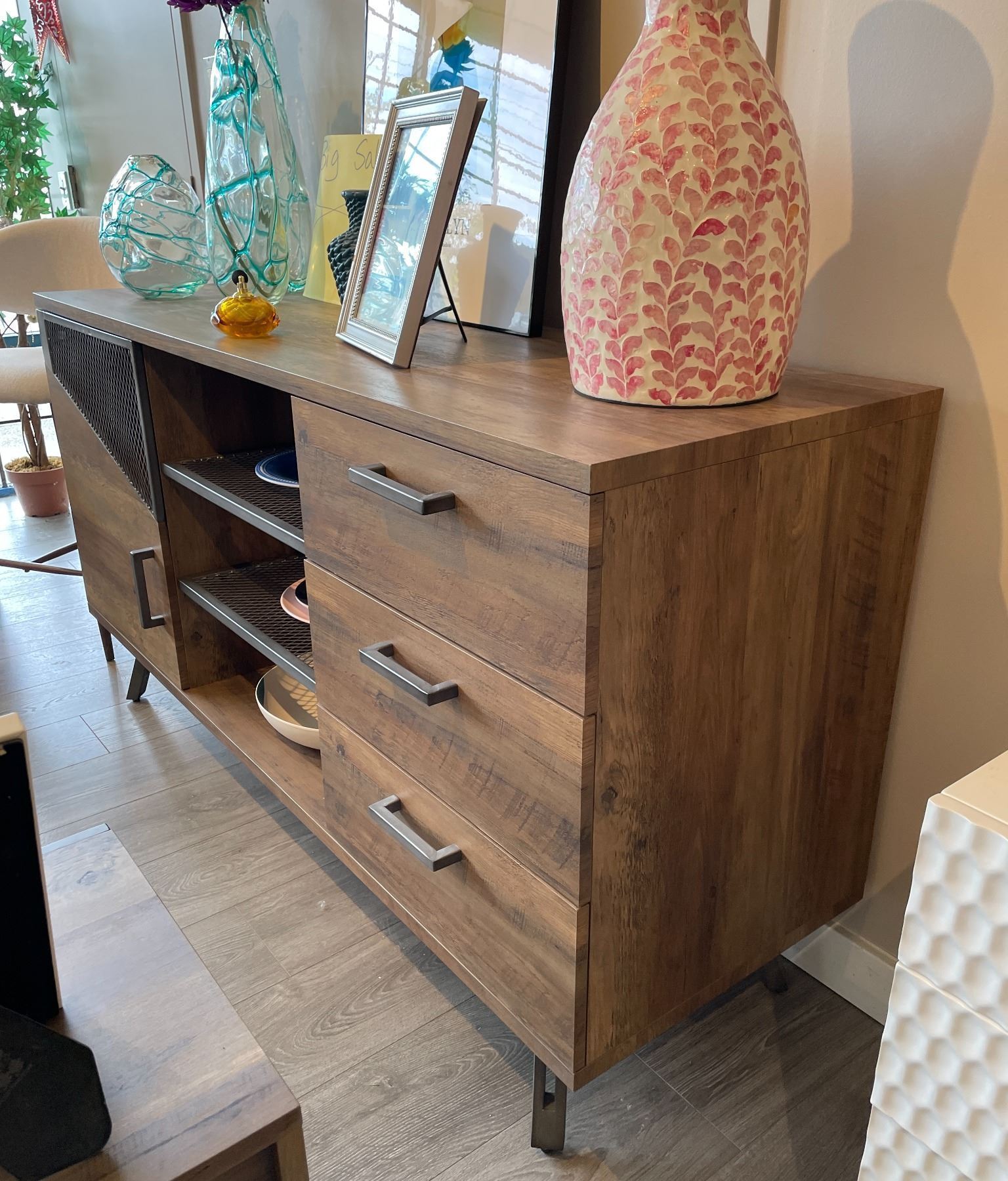 Brand new in box. woodindustry style sideboard with three drawers, two metal shelves and a cabin; measures approximately 63L ◊ 20D ◊ 34H.