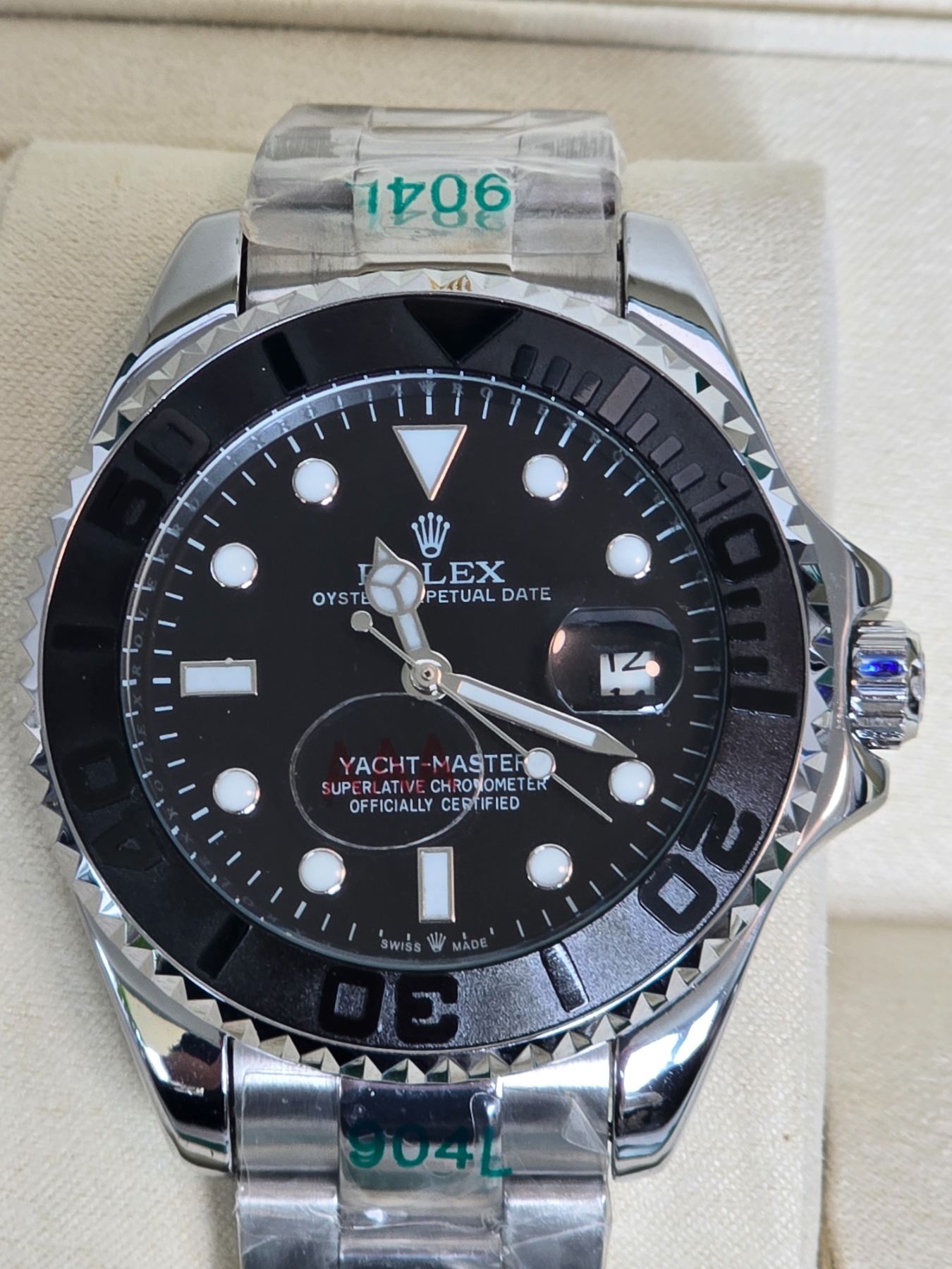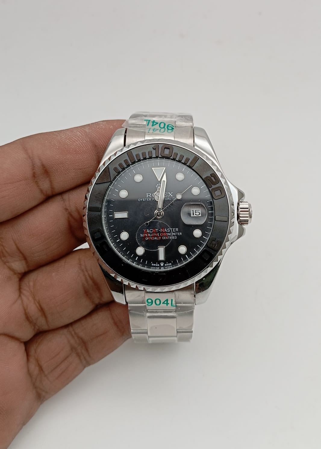 BRAND NEW FULLY AUTOMATIC ROLEX YACH MASTER REF# M226627-0001 , WITH DATE, AAA QUALITY REPLICA WATCH, BLACK DIAL WITH WHITE INDEXES, BLACK CERAMIC SPINNING BEZEL, 904L STAINLESS STEEL CASE (THE SAME STEEL USED IN AUTHENTIC ROLEX WATCHES). STAINLESS STEEL OYSTERBRACELET. FULL SET WITH BOX, PAPERS AND BAG.