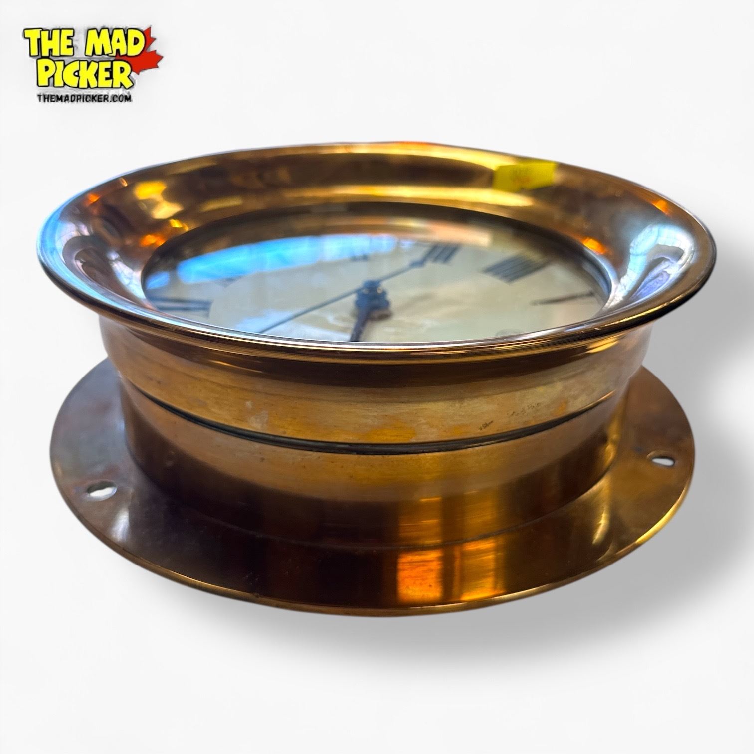 Polished brass ship's clock made by BT in 1889. Features Roman numerals and vintage nautical design. Likely intended as a functional maritime timepiece. No additional measurements or condition details provided.