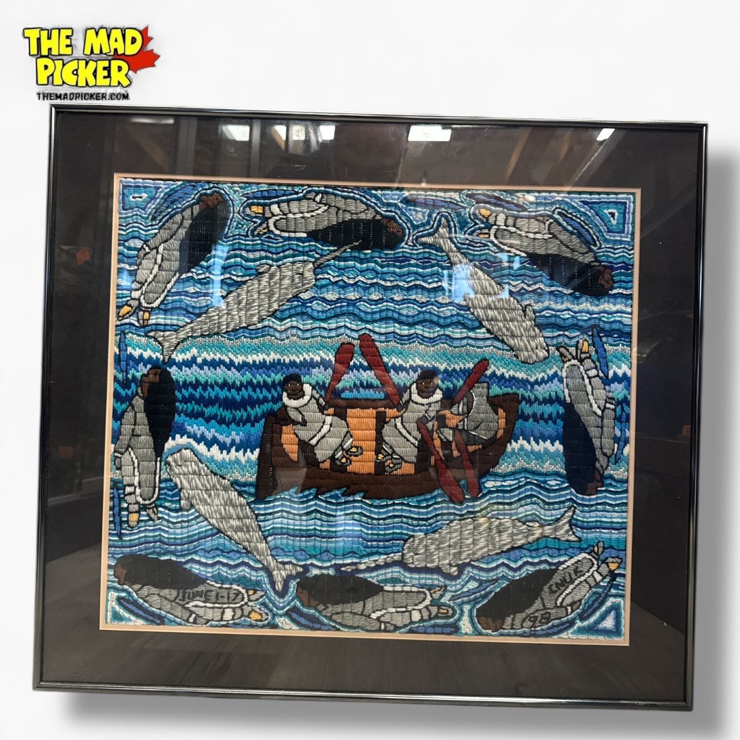 Textile applique fabric in Baker Lake style depicting the Legend of Kiviuq, unsigned but characteristic of works by Victoria Mamnguqsualuk or her family. Known for bold designs and storytelling motifs, Baker Lake works are a significant part of Inuit artistic tradition. The piece is unsigned.