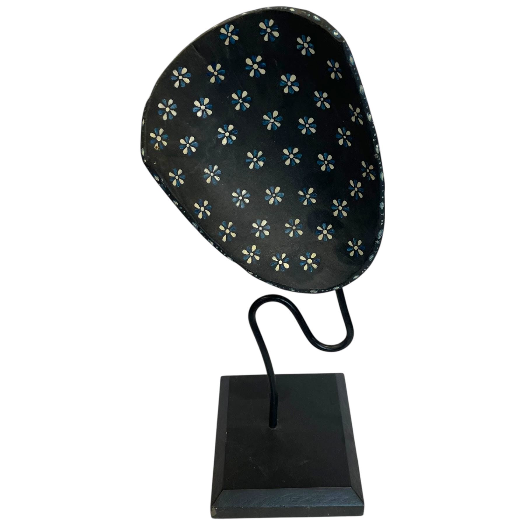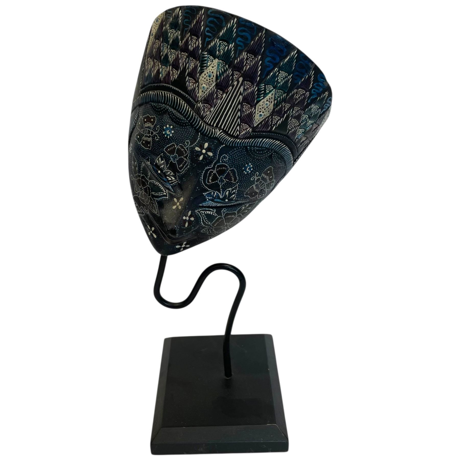 Decorative wooden mask representing Dewi Sri, a goddess of rice and fertility in Balinese and Javanese culture. Mounted on a stand for display. Overall height measures 16-Inch. Detailed carving showcases traditional craftsmanship. Item is as pictured.