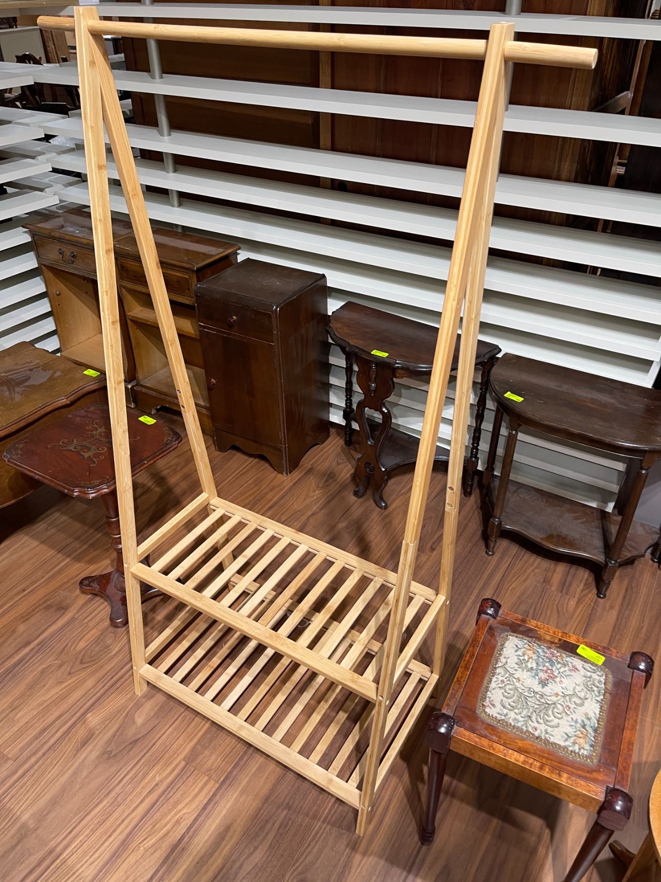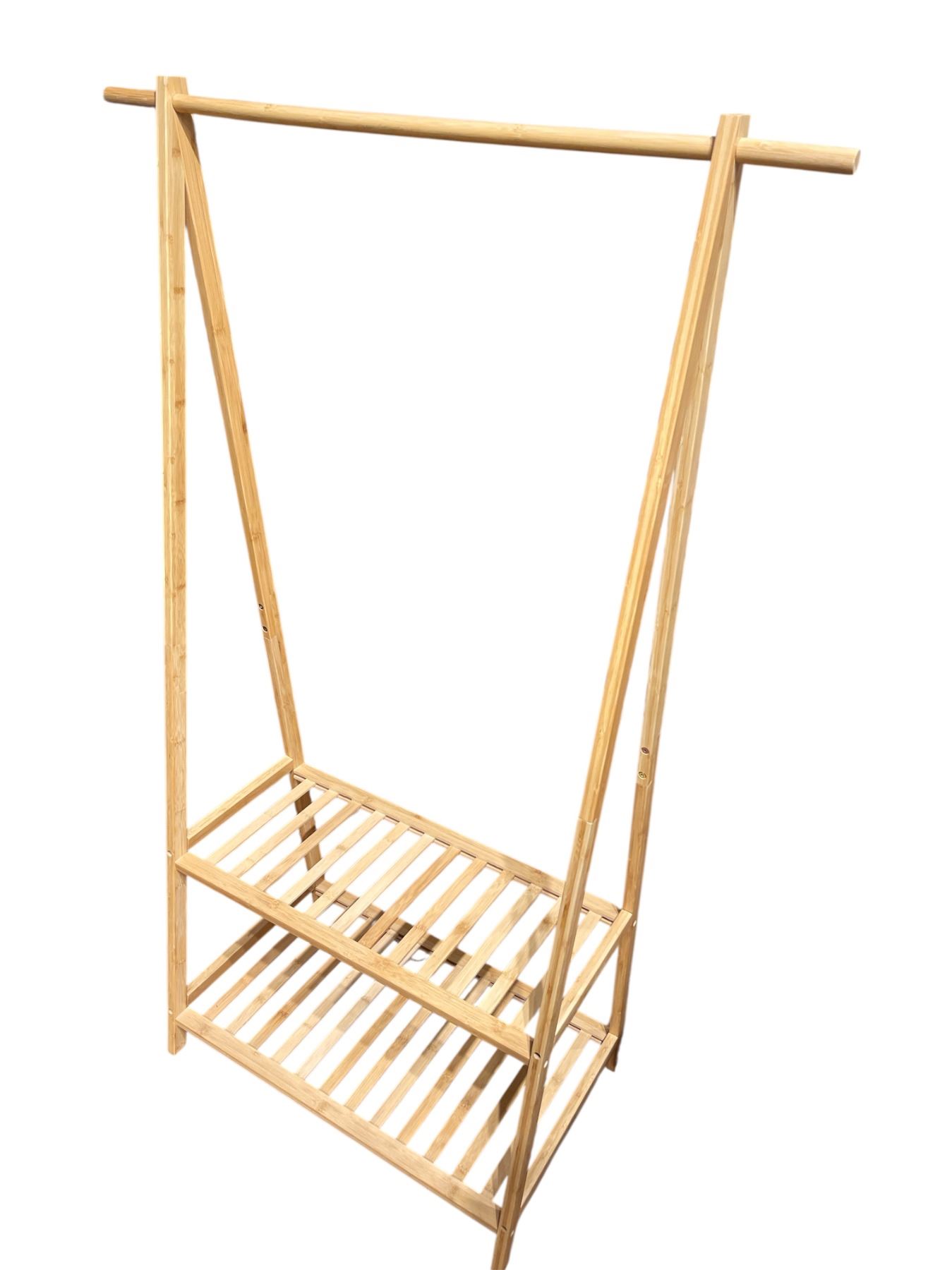 Bamboo closet organizer with clothes hanger and shoe storage. Dimensions are 35.5 In length, 17 In width, and 60 In height. Functional design suitable for organizing clothing and footwear. Item is as pictured.