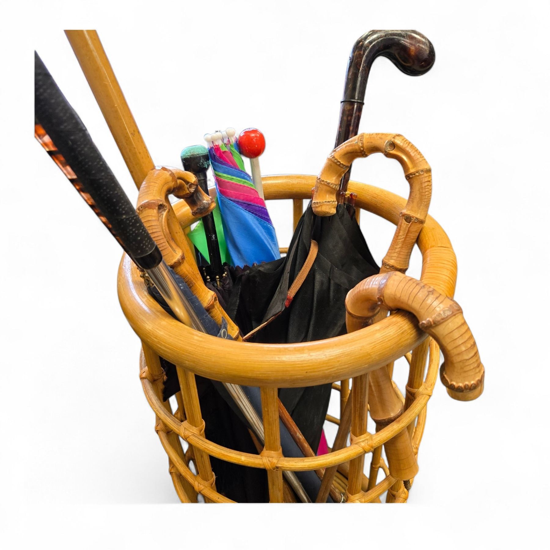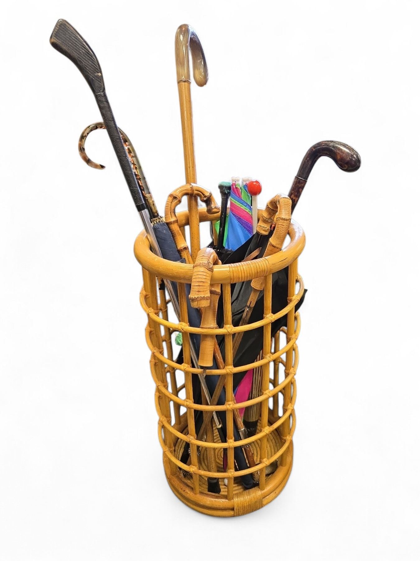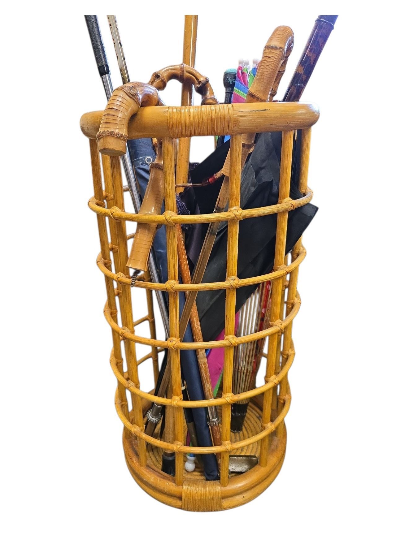 Bamboo Umbrella Stand and Contents (Umbrellas, Canes and a Vintage Putter)