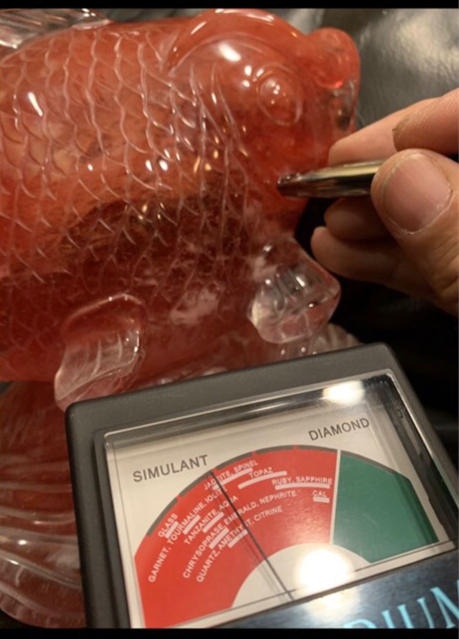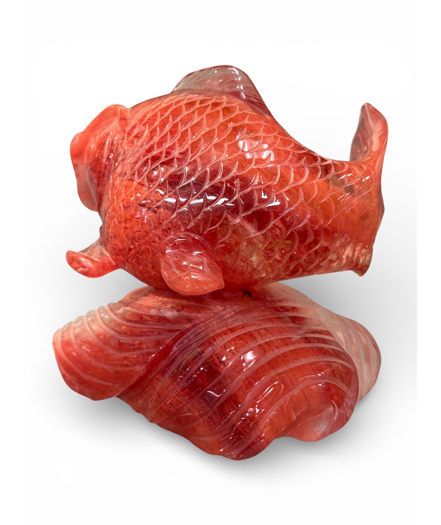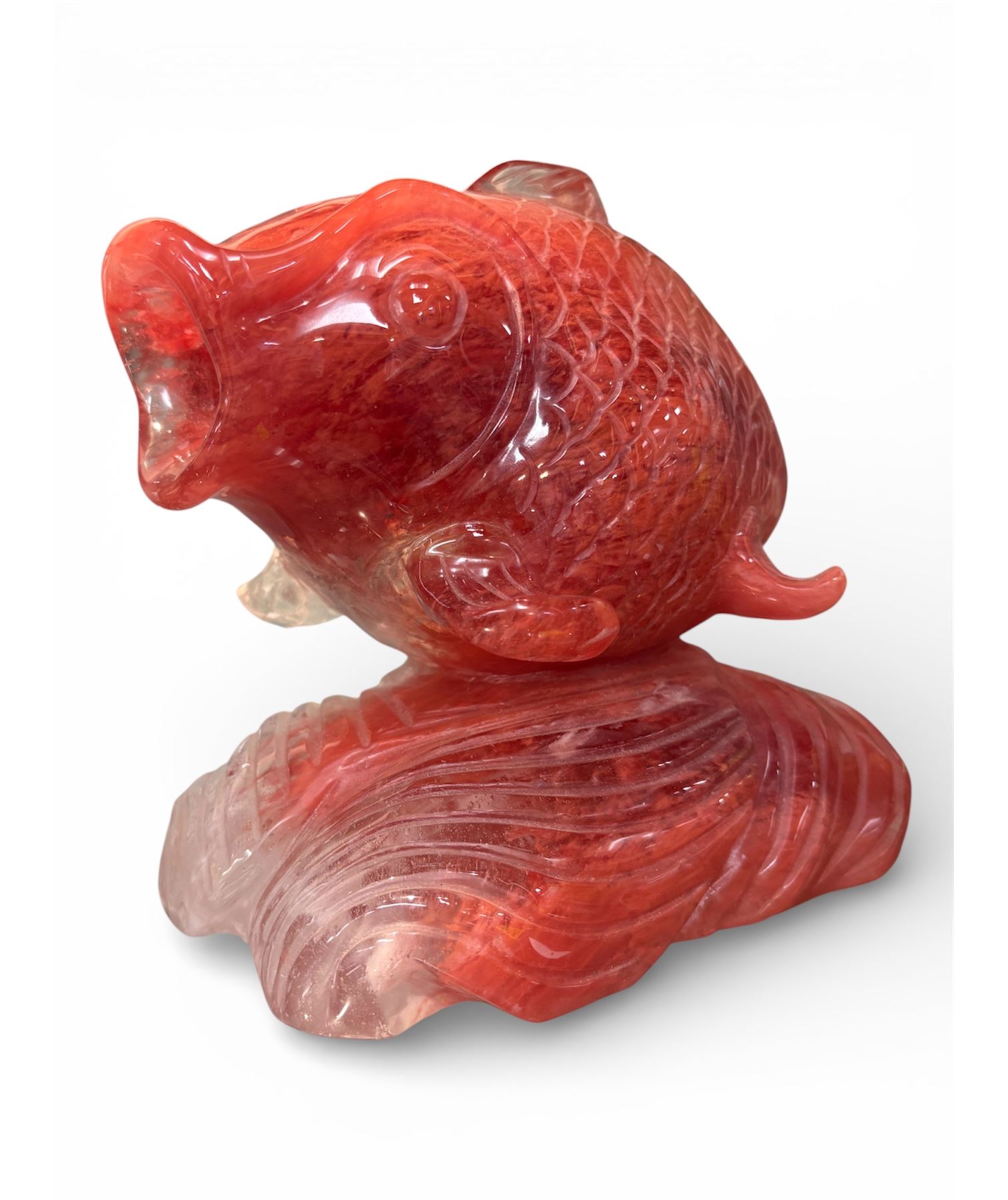 Handcrafted Feng Shui koi fish sculpture carved from red jade. Depicts a lucky carp symbolizing prosperity and abundance. Stands 7-Inch tall. Suitable for Feng Shui practices or decorative purposes. Item is as pictured.