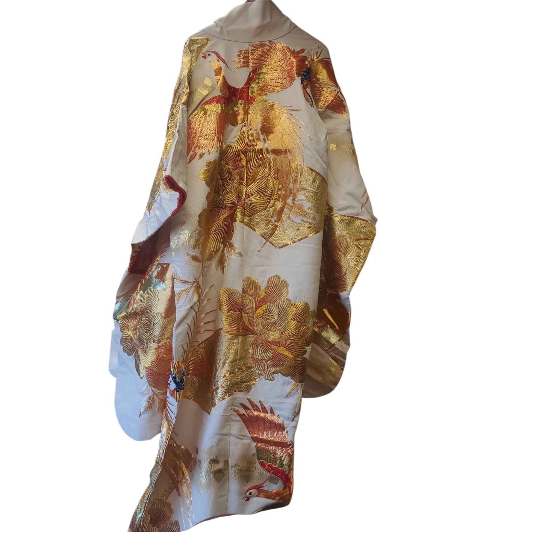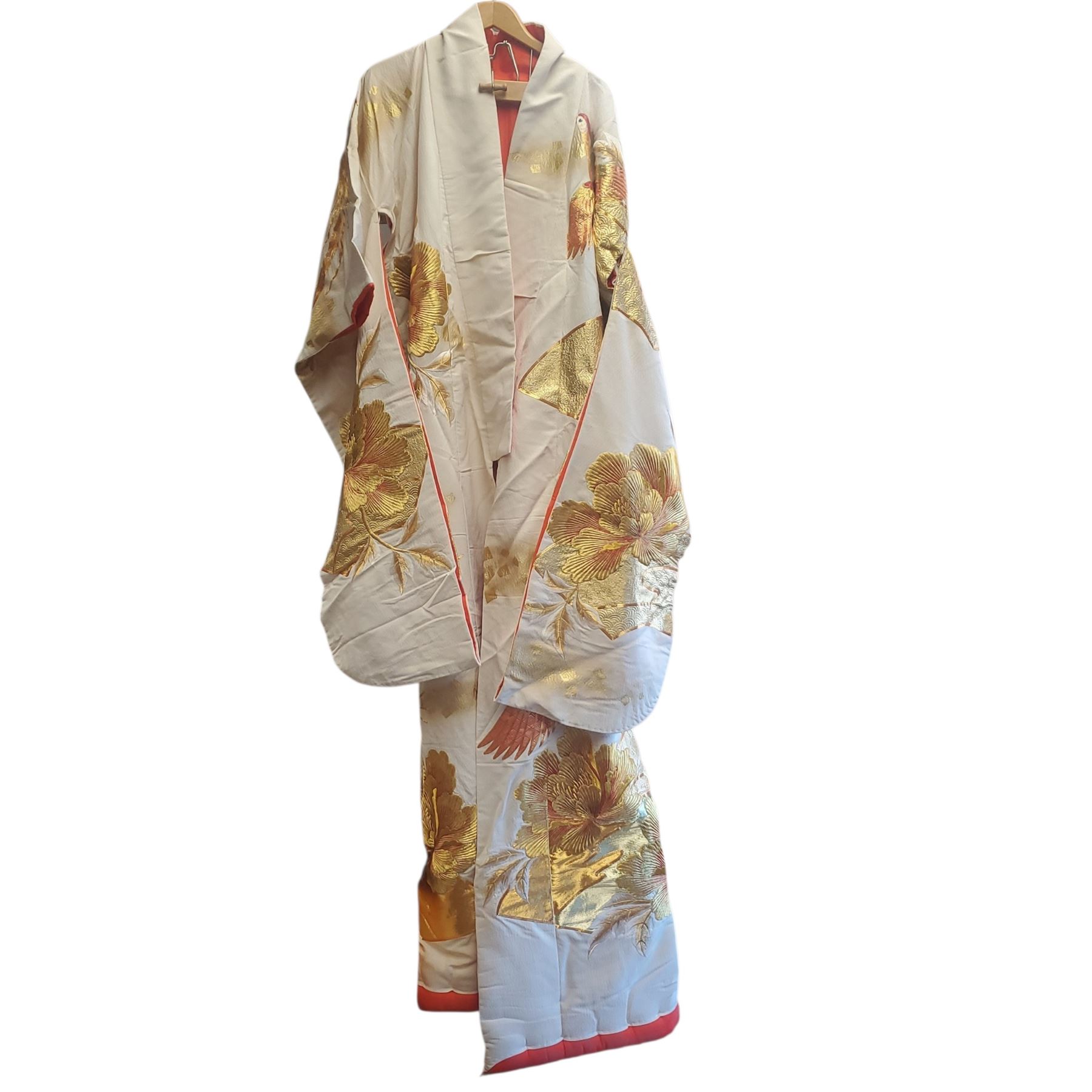 Beautiful high-quality Japanese kimono in cream and orange featuring intricate gold floral and pheasant embroidery. Measures 71-Inch in length. Includes a wooden storage box for safekeeping. Item is as pictured.