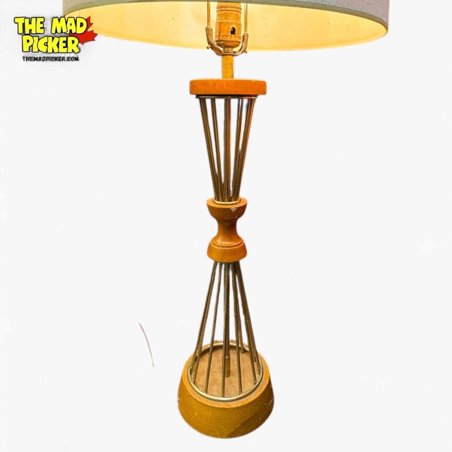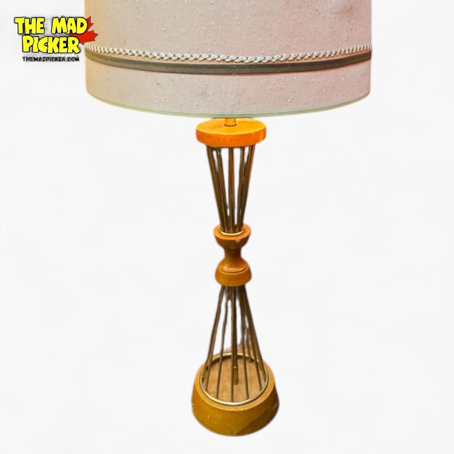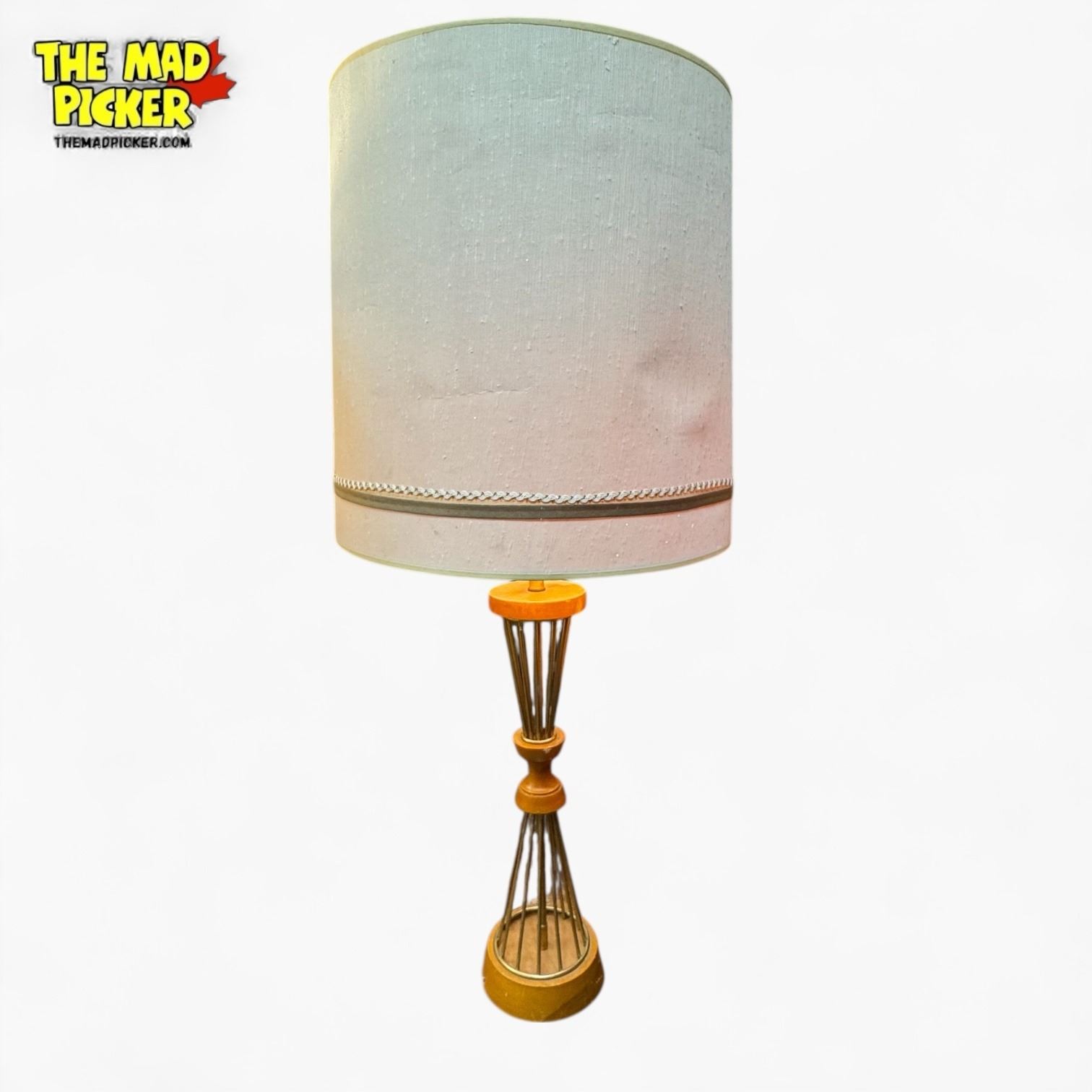 Bethel table lamp featuring a mid-century design with a wood and brass base. Designed for a standard light bulb. Requires a replacement lampshade for full functionality. Distinctive vintage aesthetic.