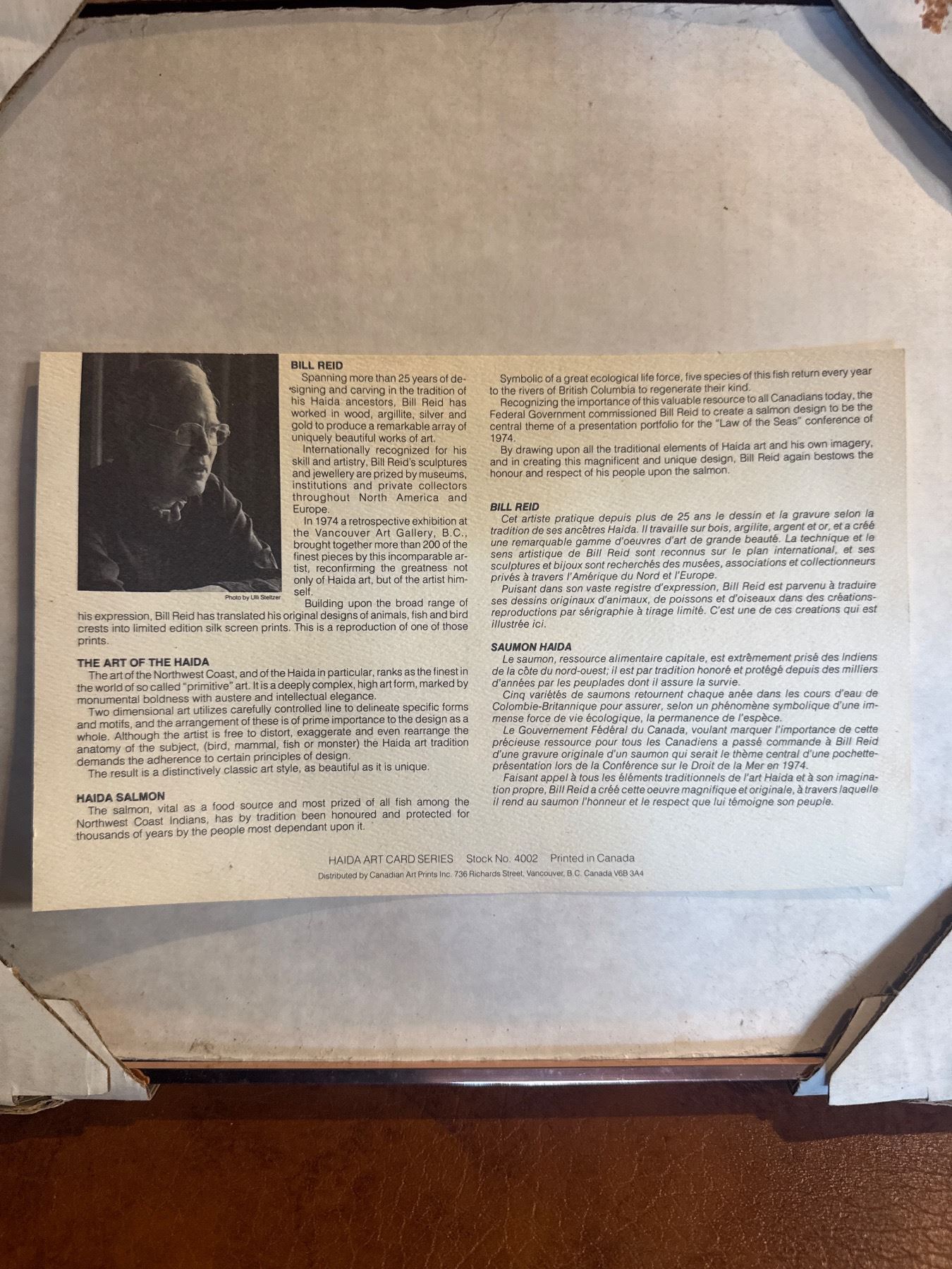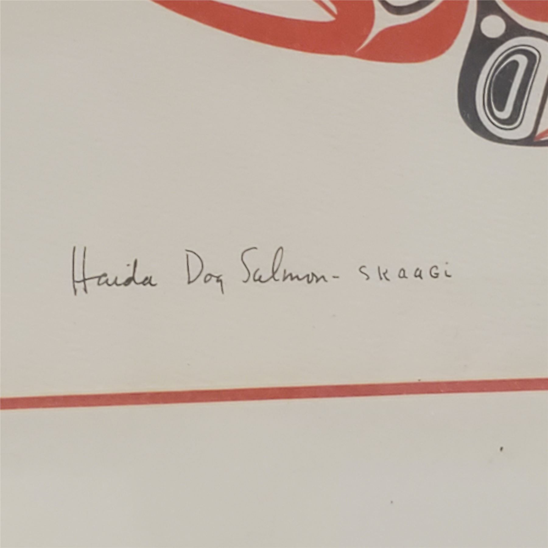 Print by Bill Reid titled 'Haida Dog Salmon' created in 1974. Measures 11.5x14.5-Inch. Reid was a prominent Haida artist known for his detailed depictions of indigenous themes and wildlife. This print features intricate design representative of Haida culture. Item is as pictured.